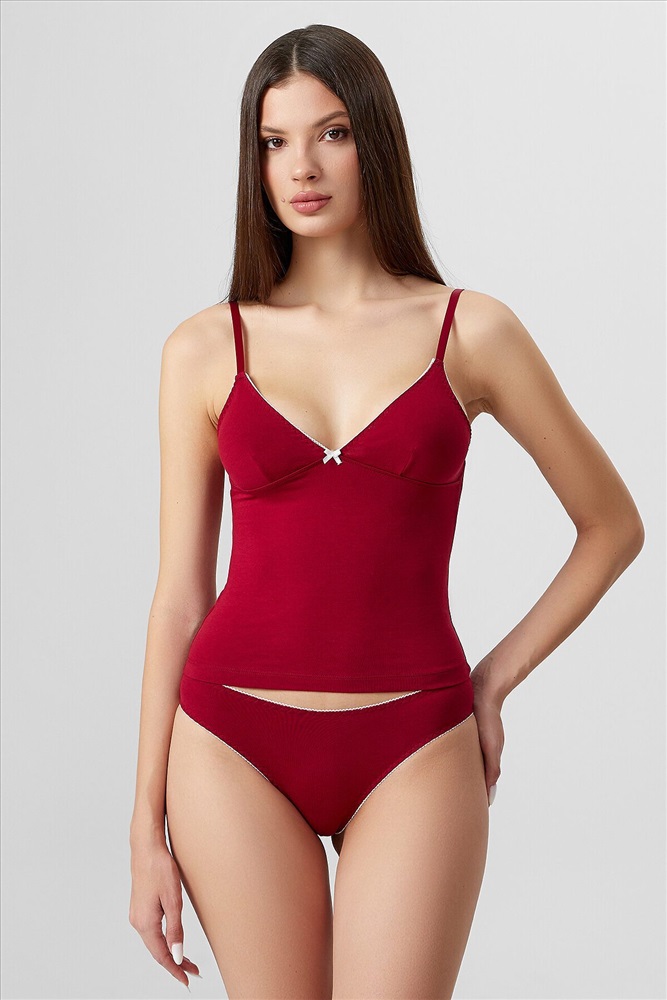 Комплект женский, состоит из топа и трусов (слипы), из кулирного полотна. Топ женский на тонких бретелях. Бретели выполнены из бретельной эл тесьмы 10 мм (SWE12-10, Артекс E7573/М) с регулировкой по длине. Пластиковые кольца-регуляторы 10 мм в цвет бретели. На детали переда подрез под грудью с эластичной тесьмой 6 мм в шве (жилка тканая Wt4-6 , артекс E7112), чашки с вертикальными вытачками. Спинка цельная. Срезы чашек, проймы и верхний срез спинки обработаны эл тесьмой 10 мм (эл с зубом KTE5-10, артикул с зубом Е2699) в один прием на 4-укольном зигзаге. Силуэт облегающий, длиной немного ниже уровня талии. Низ изделия обработан швом вподгибку узкой плоскошовной строчкой. Трусы женские слипы со средней посадкой из кулирного полотна. Подкладка ластовицы из основного полотна, отлетная по переднему краю. Передняя и задняя детали цельные. Верхний срез и нижние срезы обработаны эл тесьмой 10 мм (с зубом KTE5-10, артикул с зубом артекс Е2699) в один прием на 4-укольном зигзаге, тесьма располагается с изнаночной стороны.
