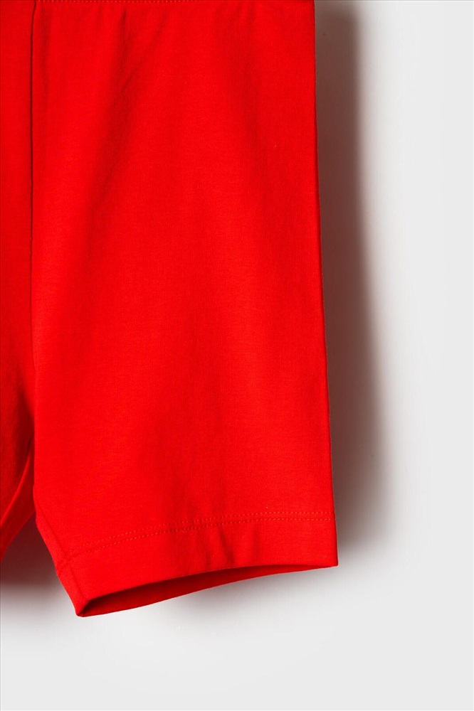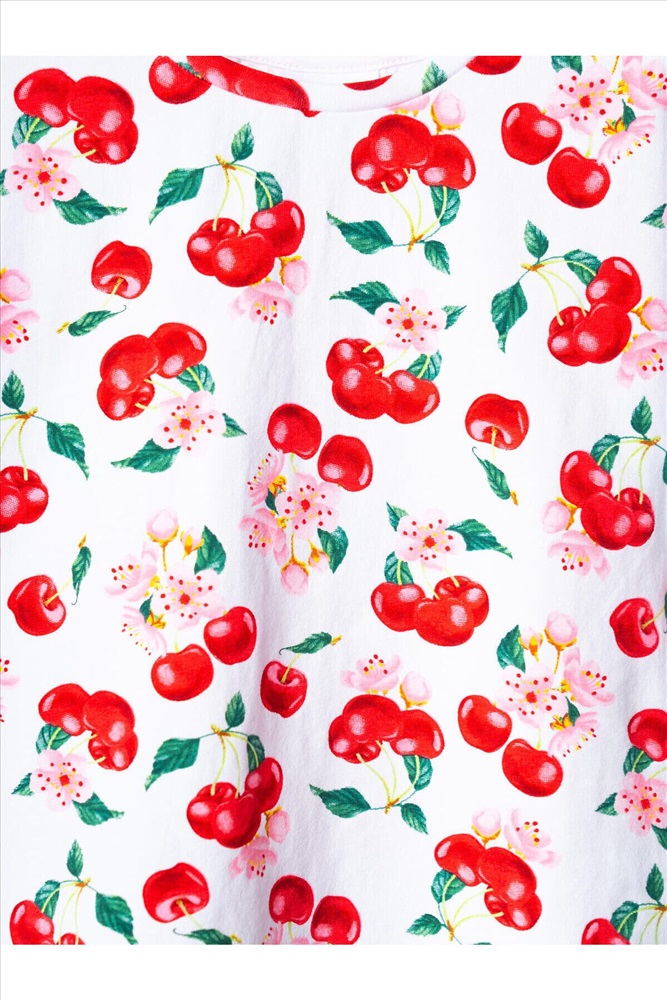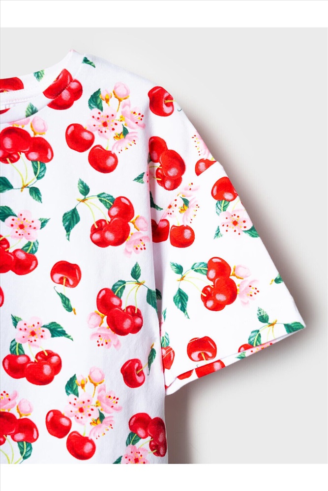Детский яркий комплект для девочки. Состоит из оверсайз футболки с коротким рукавом и укороченных легинсов. Футболка из хлопкового трикотажа джерси, с ярким принтом с вишнями и цветами. Легинсы выполнены из однотонного красного трикотажа, хорошо тянутся и комфортно сидят по фигуре. Пояс с резинкой обеспечивает удобную посадку.