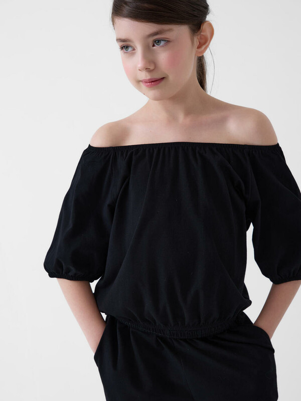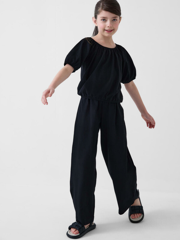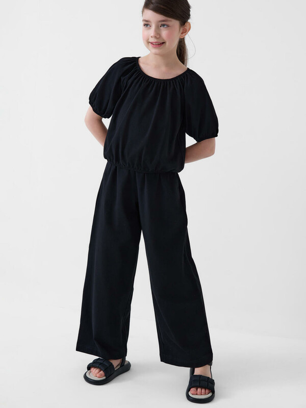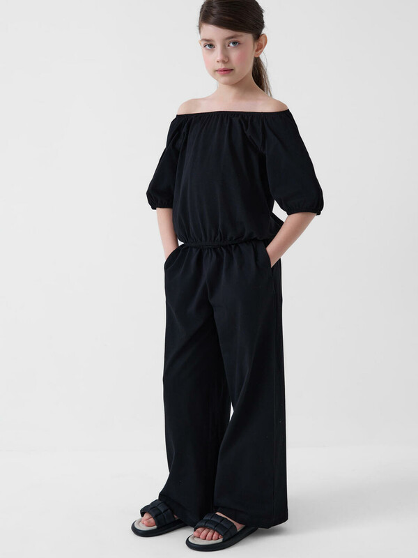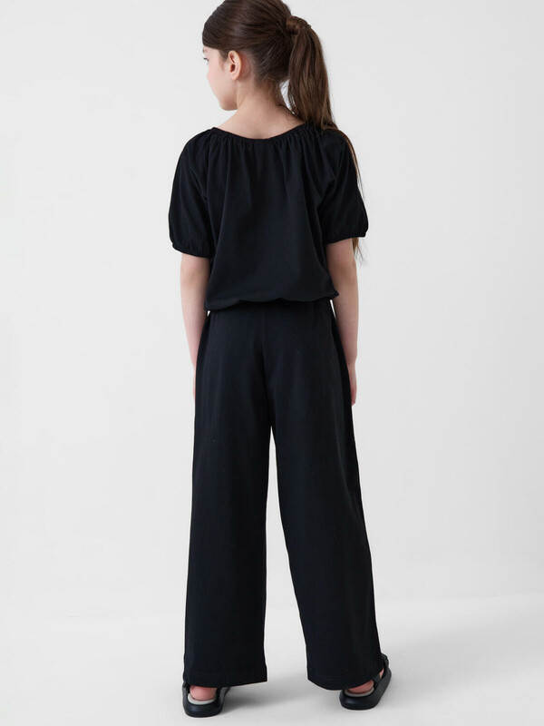 Детский легкий комплект для девочки. Состоит из футболки и прямых брюк на резинке. Выполнен из хлопкового трикотажа. Футболка свободная, с округлым вырезом и мягкой сборкой по горловине и низу, за счёт чего выглядит воздушной и комфортной. Брюки на резинке — прямые, со средней посадкой.