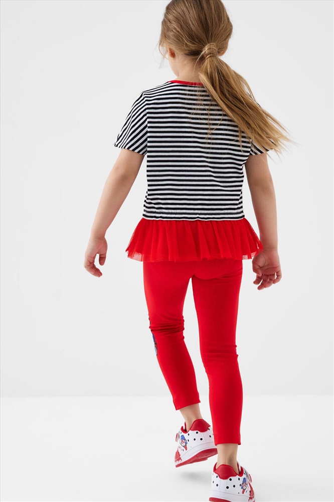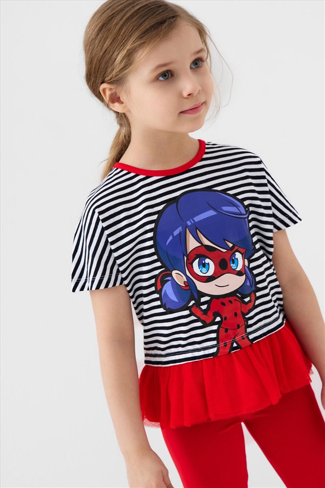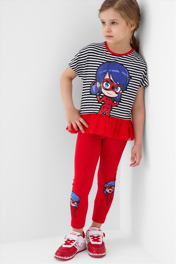 Летний детский комплект для девочки. Состоит из футболки с коротким рукавом и легинсов с принтом любимых мультяшных героев "Леди Баг и Супер-Кот". Футболка свободного кроя, выполнена из хлопкового трикотажа джерси и украшена оборкой из сетки. Леггинсы на резинке выполнены из хлопкового трикотажа джерси.