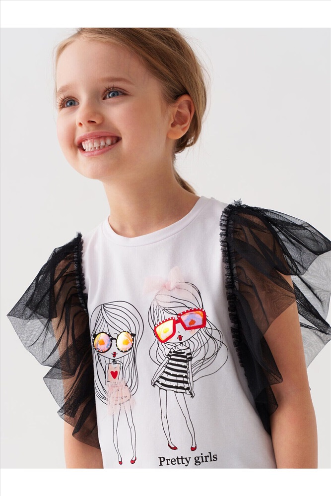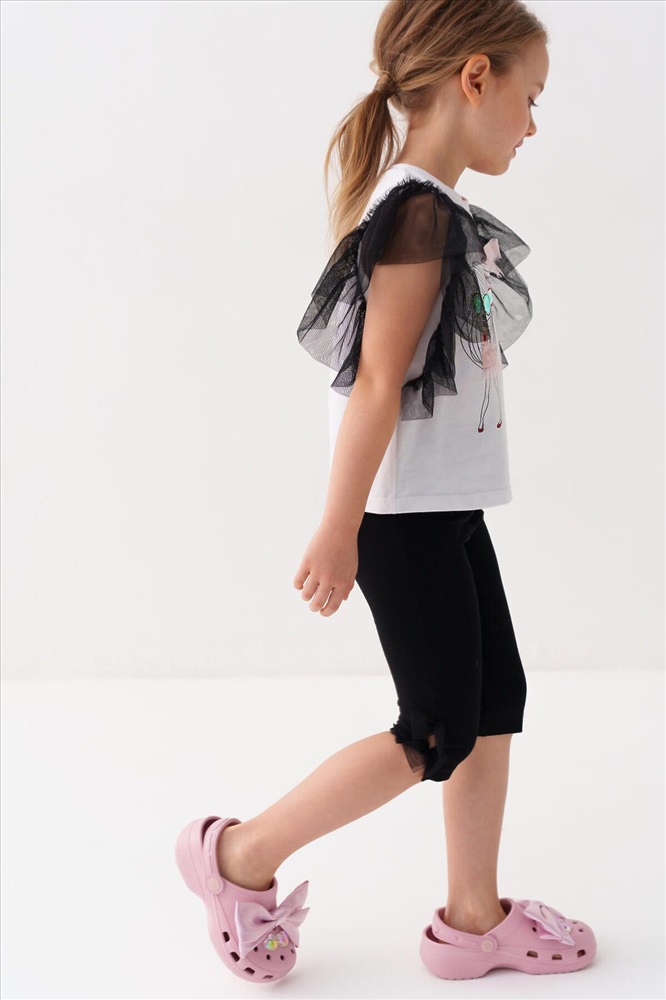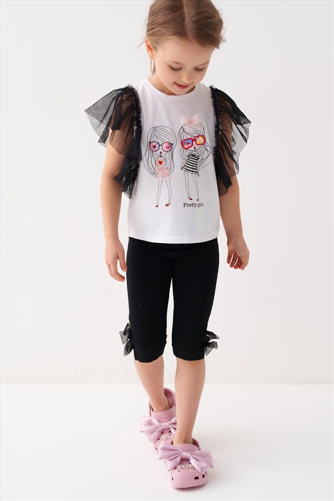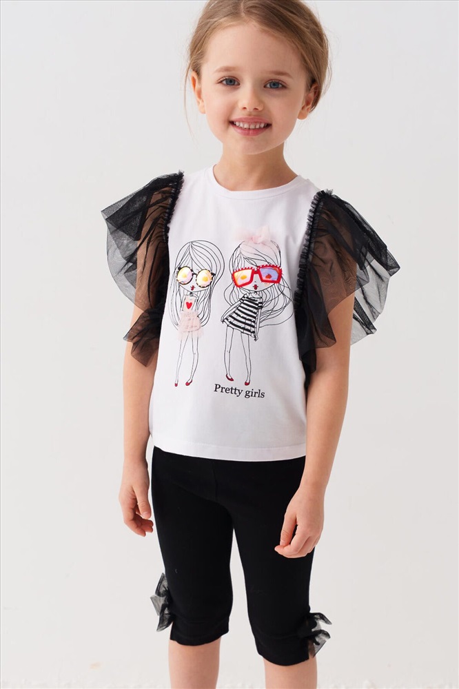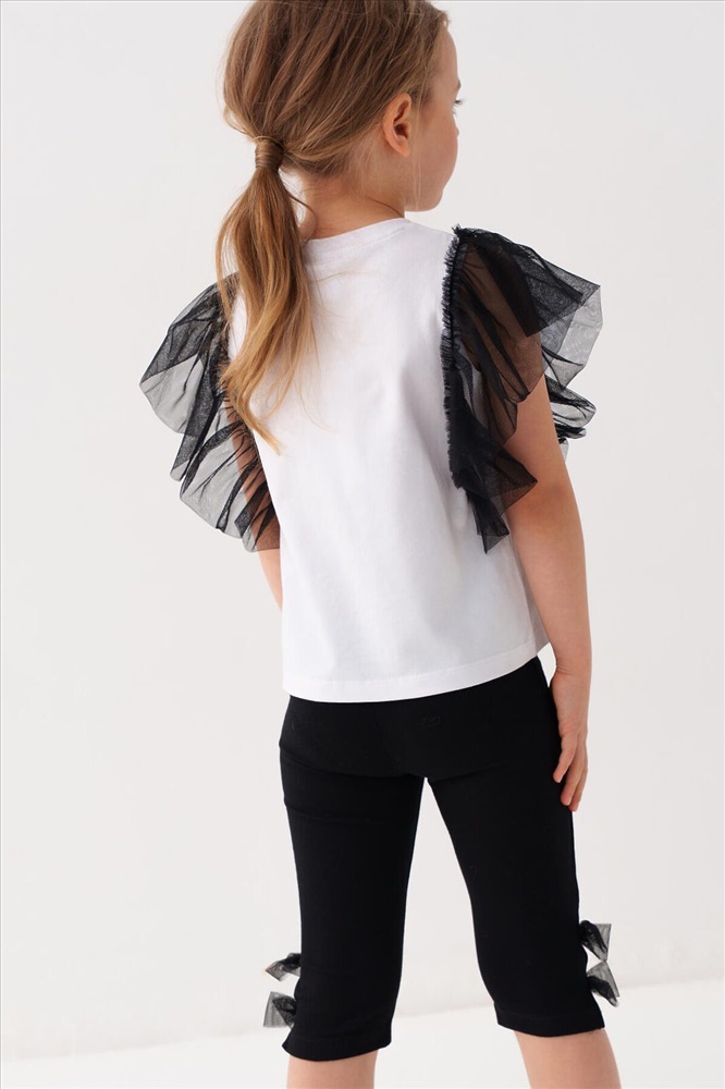 ID товара: 1240021 Состав: Футболка- 95% хлопок, 5% эластан; 100% полиэстер, Леггинсы- 95% хлопок, 5% эластан Сезон: Весна/Лето Детский комплект для девочки. Состоит из футболки и укороченных легинсов из хлопкового трикотажа джерси. Футболка прямого кроя, с ярким принтом на груди. Рукава-крылышки выполнены из лёгкой сетки, что придаёт изделию нарядный и модный вид. Легинсы чёрного цвета, укороченной длины, плотно прилегают по фигуре. В поясе — удобная эластичная резинка. По низу легинсов расположены декоративные бантики с вставками из сетки, которые перекликаются с дизайном рукавов футболки. Комментарии к товару