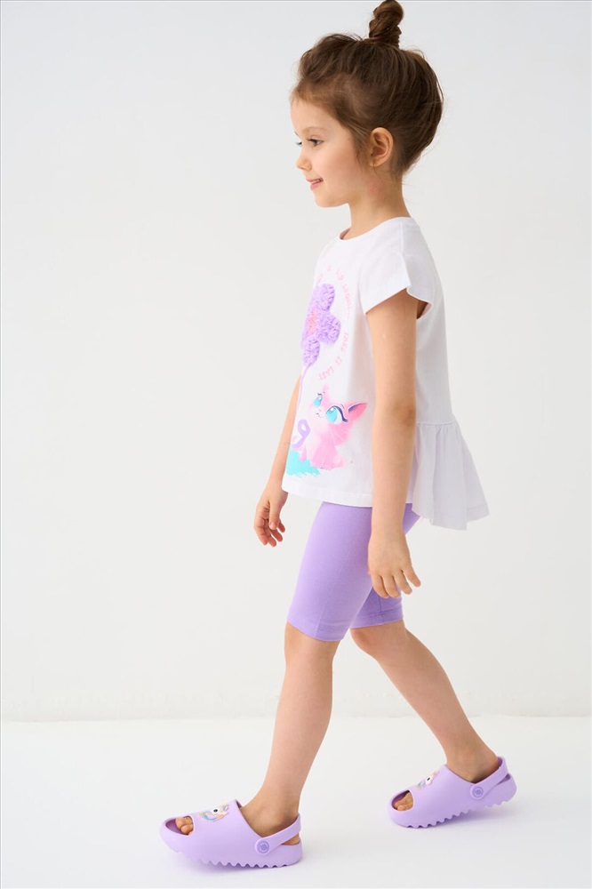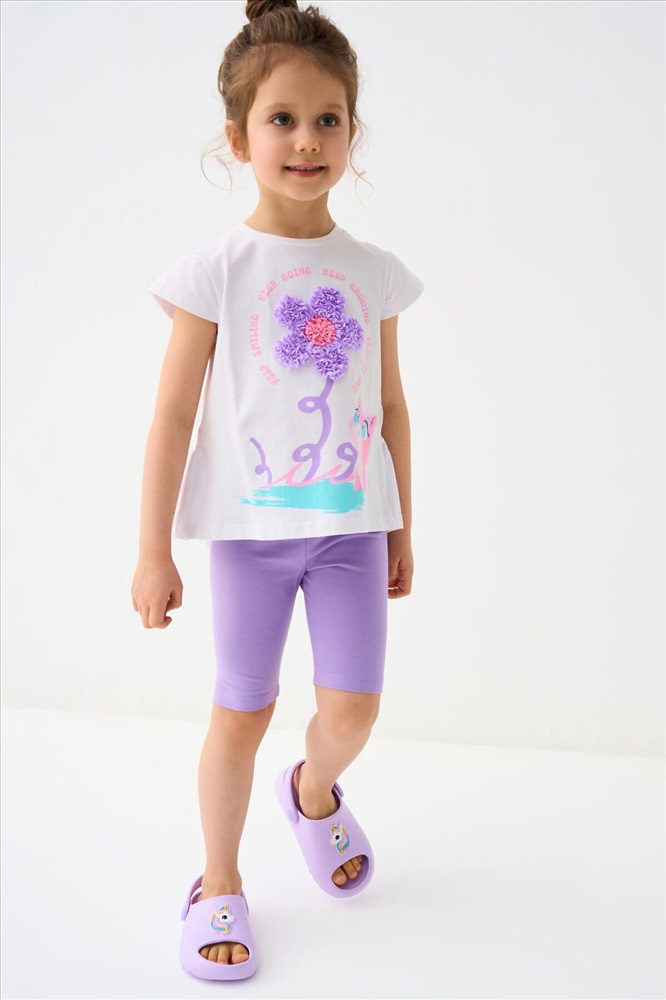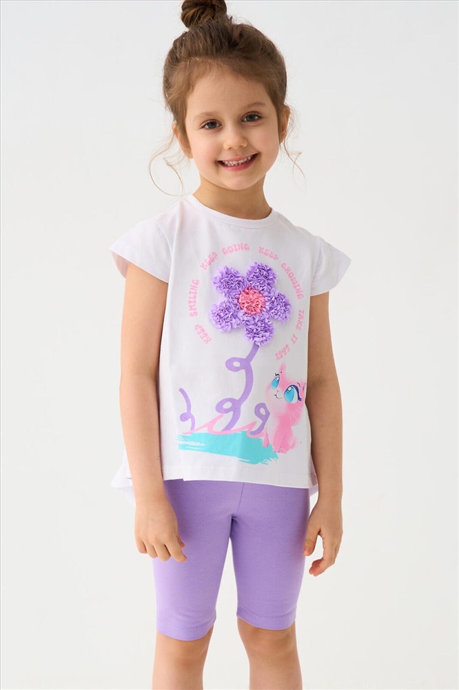 Детский комплект для девочки. Состоит из футболки прямого кроя, с короткими рукавами и укороченных легинсов. Футболка слегка удлиненная, с аккуратной сборкой внизу. На передней части размещен яркий декоративный рисунок с цветком и персонажем, дополненный объемной вышивкой, что делает модель выразительной и привлекательной. Легинсы облегающего силуэта, комфортно сидят по фигуре и хорошо тянутся. Пояс мягкий, на резинке, не сдавливает и подходит для активного движения.