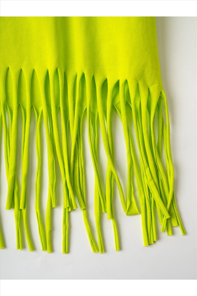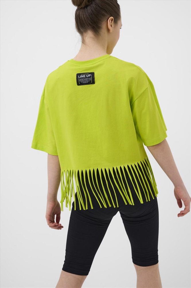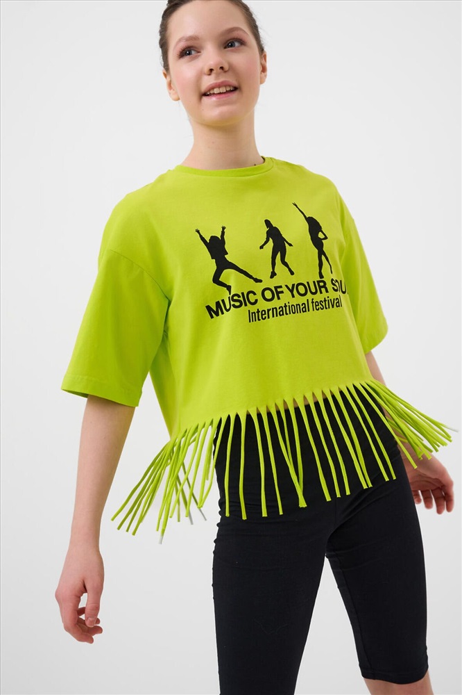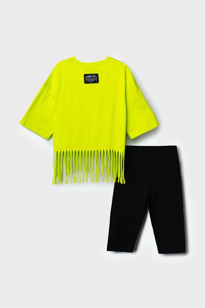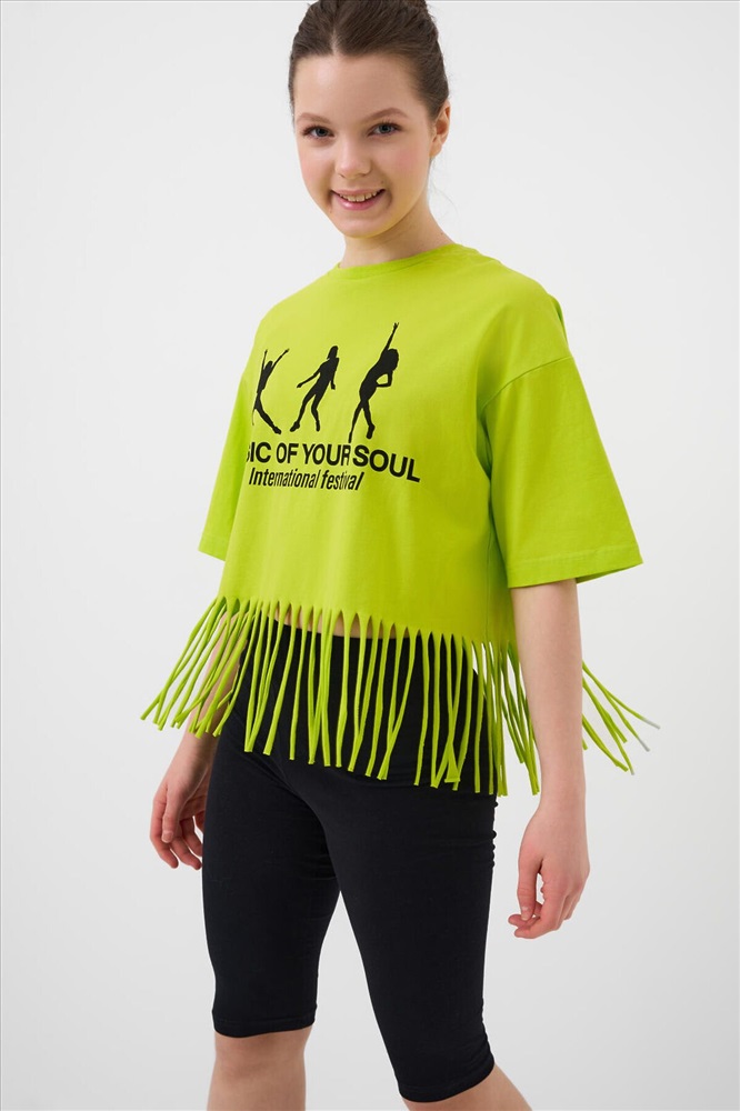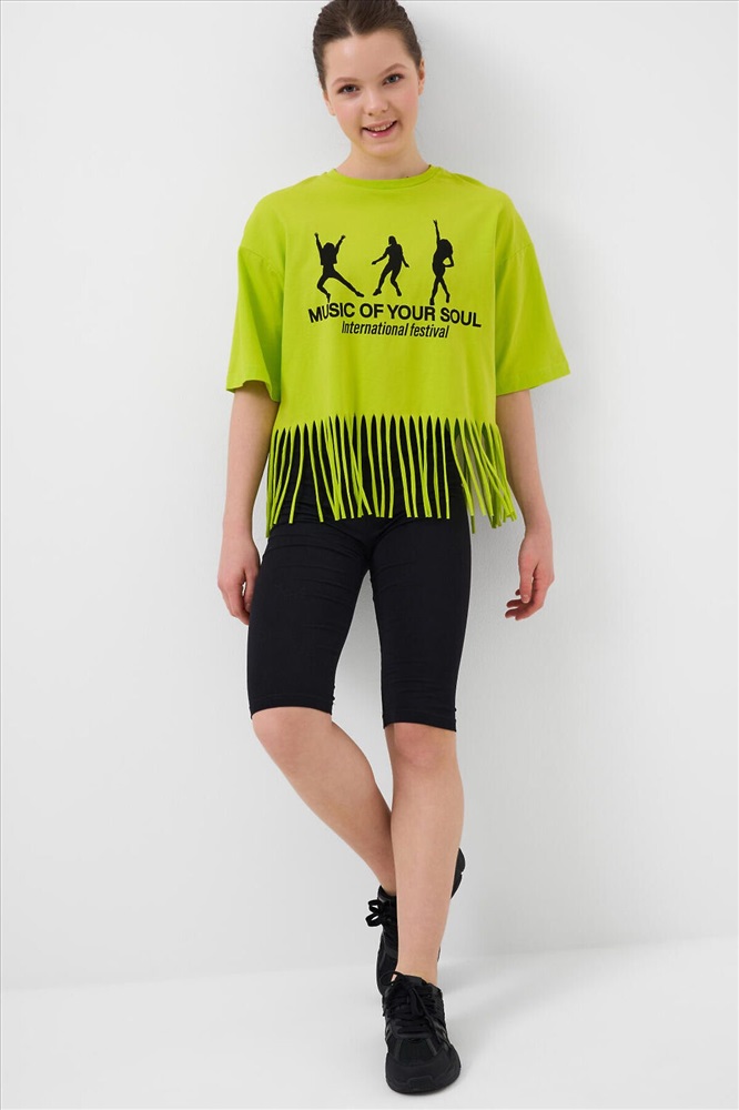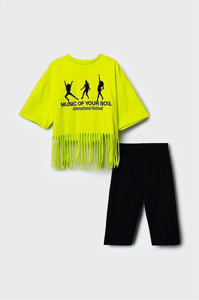 Комплект для девочки подростка. Состоит из яркой оверсайз футболки и укороченных легинсов. Футболка из хлопкового трикотажа джерси, с короткими рукавами и круглой горловиной. Главный акцент — крупный принт и бахрома по низу. На спинке под горловиной расположена стильная нашивка. Легинсы выполнены из мягкого трикотажа джерси, имеют облегающую посадку и удобный пояс на резинке.