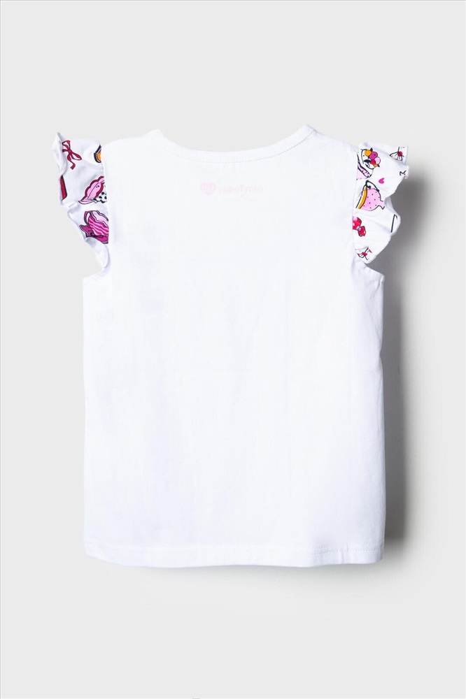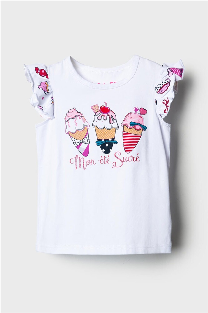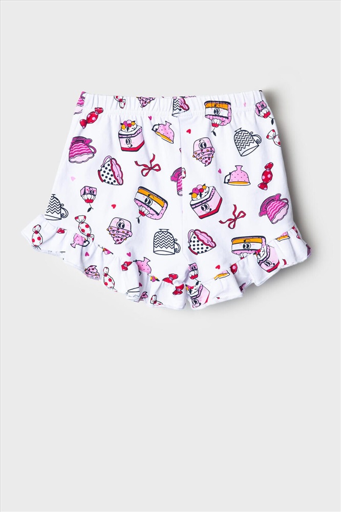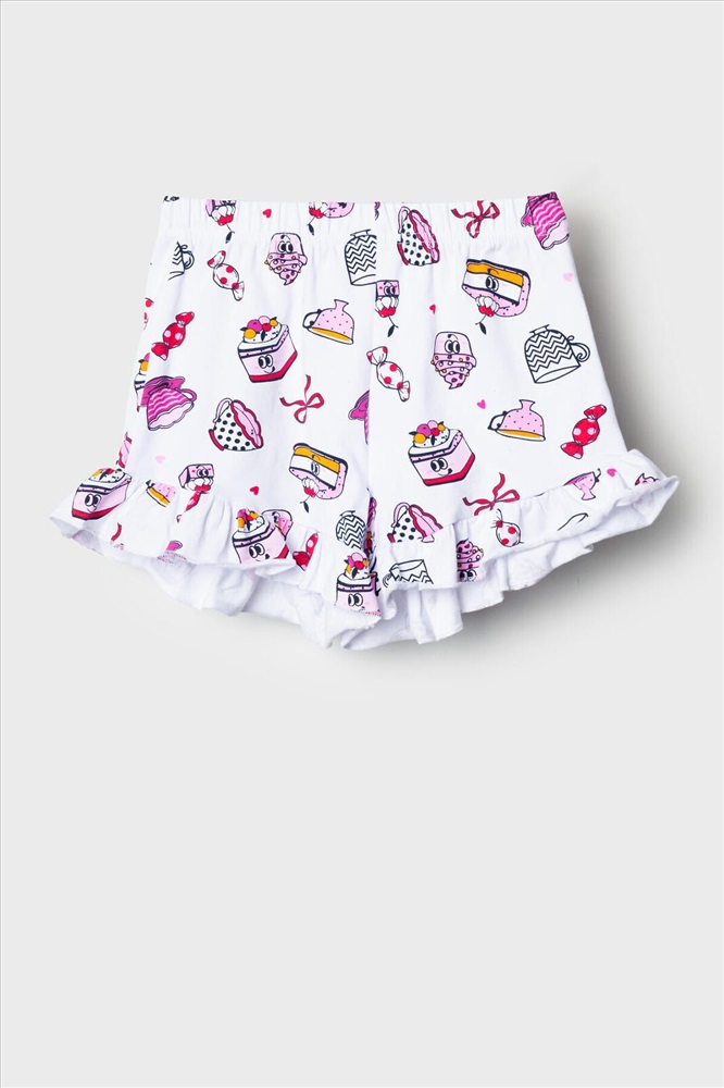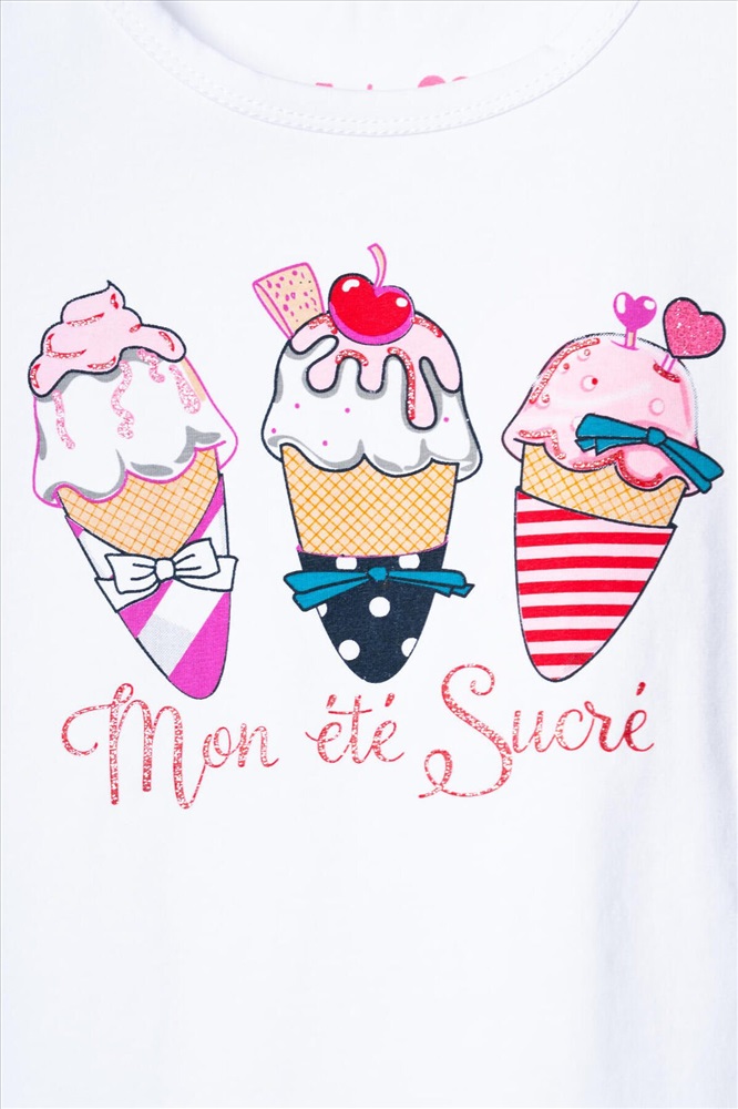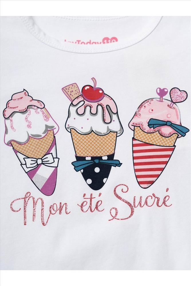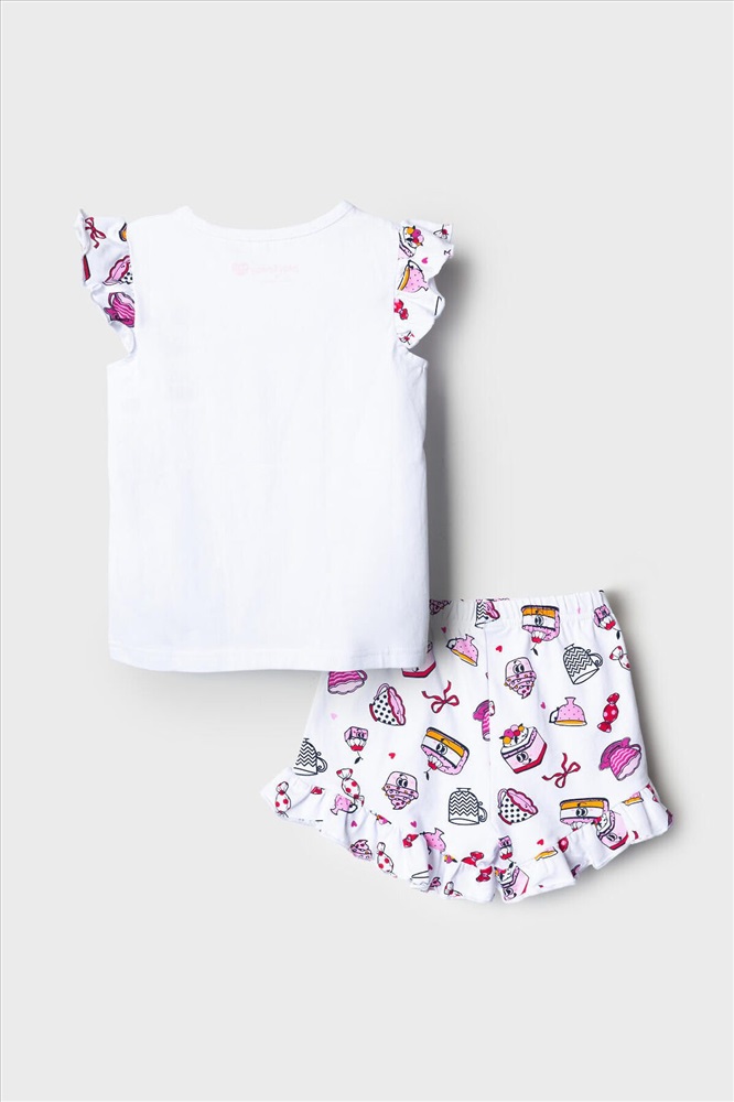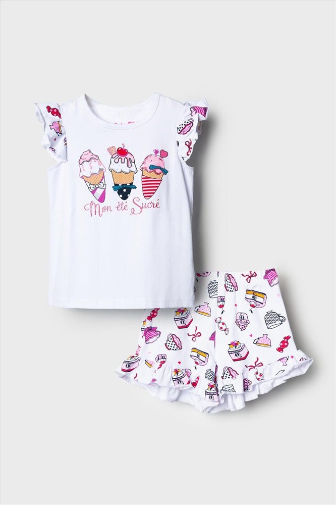ID товара: 1239768 Состав: 95% хлопок, 5% эластан Сезон: Весна/Лето Пижама детская для девочки. Комплект для девочки из футболки, прямого кроя и шорт с ярким летним дизайном. Футболка белого цвета с милым принтом мороженого. Рукава украшены оборками. Шорты на резинке, с расклешённым низом и воланами по краю. Материал - хлопковый, дышащий трикотаж. Комментарии к товару