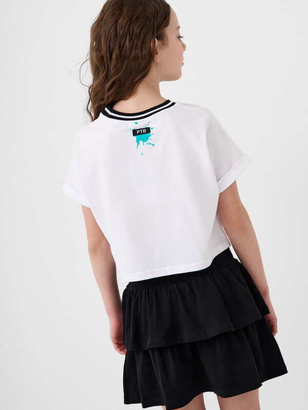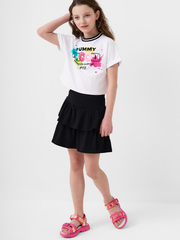 Легкий комплект для девочки подростка. Выполнен из мягкого хлопкового трикотажа джерси, состоящий из укороченной футболки и юбки-шорт. Футболка свободного кроя с ярким принтом. Пышная юбка на резинке с воланами, внутри имеет удобные шорты, что делает модель практичной для активного отдыха.