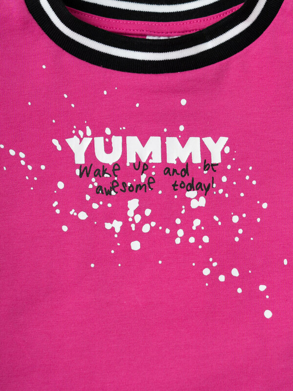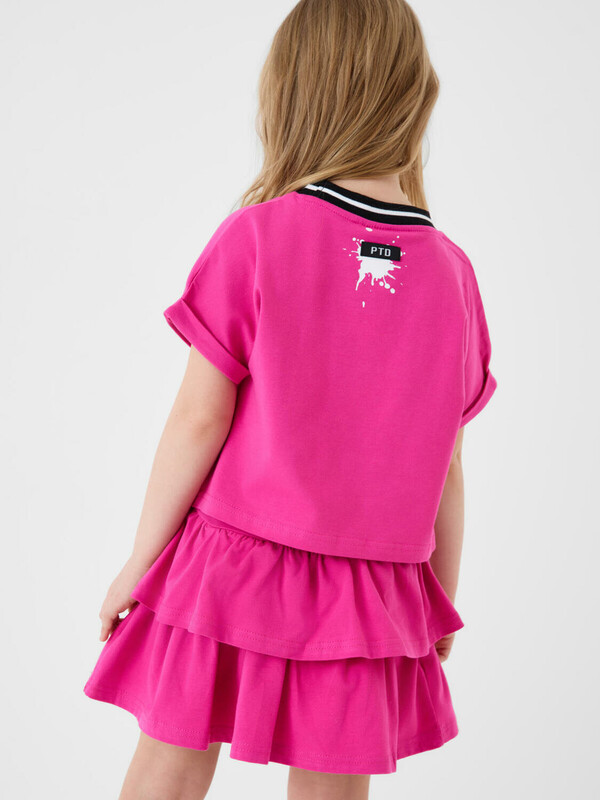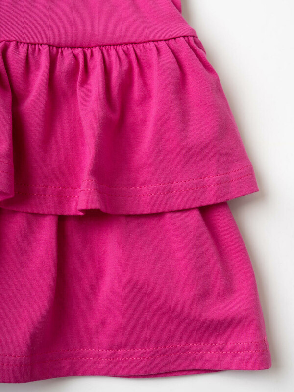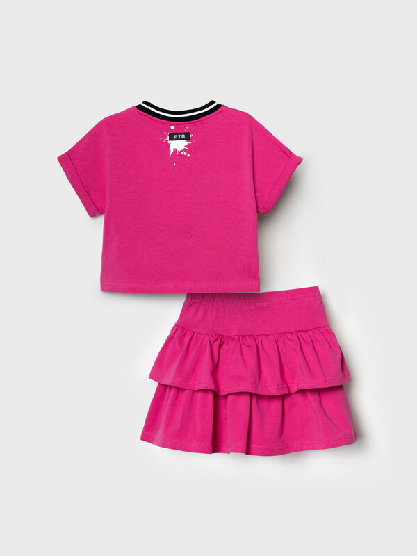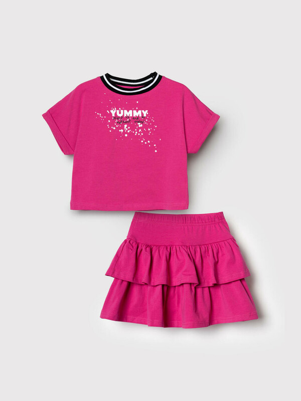 Легкий детский комплект для девочки. Выполнен из мягкого хлопкового трикотажа джерси, состоящий из укороченной футболки и юбки-шорт. Футболка свободного кроя с ярким принтом. Пышная юбка на резинке с воланами, внутри имеет удобные шорты, что делает модель практичной для активного отдыха.