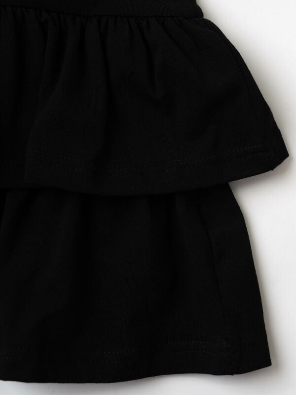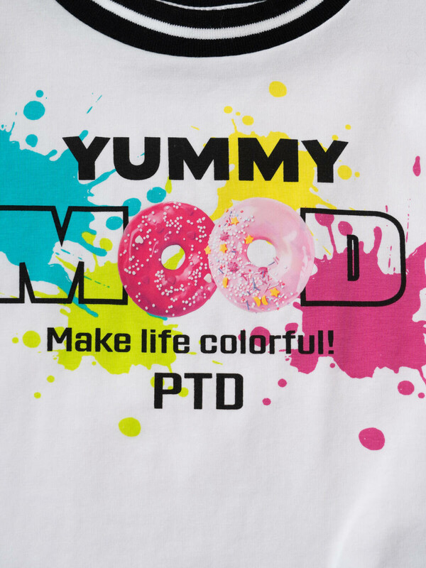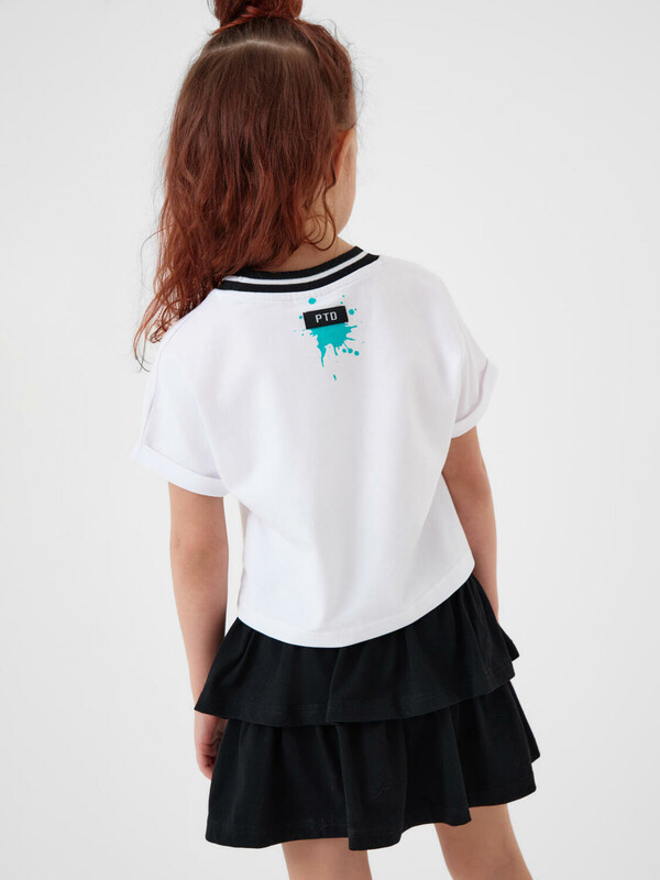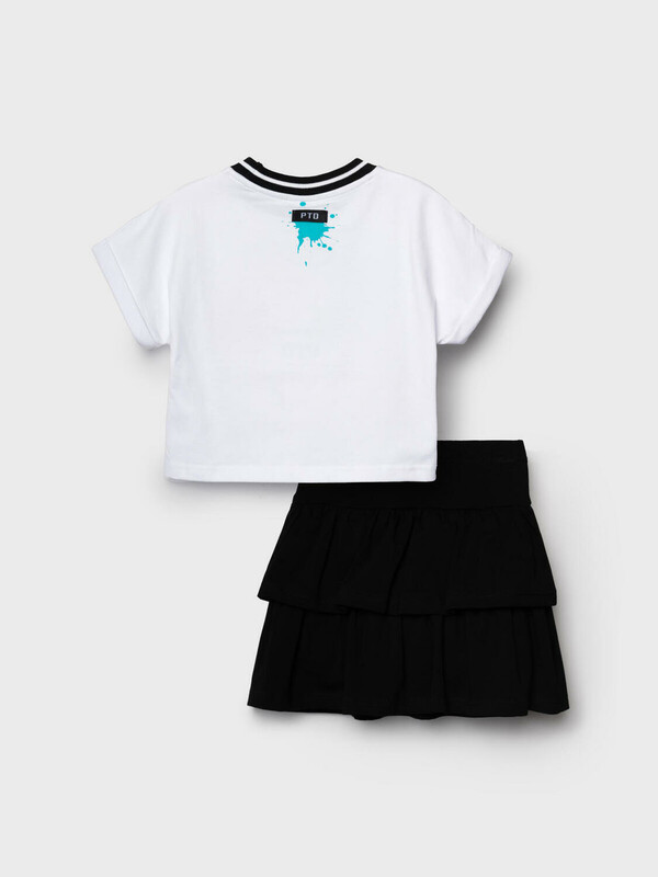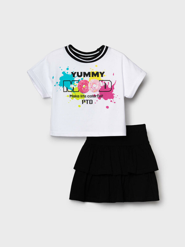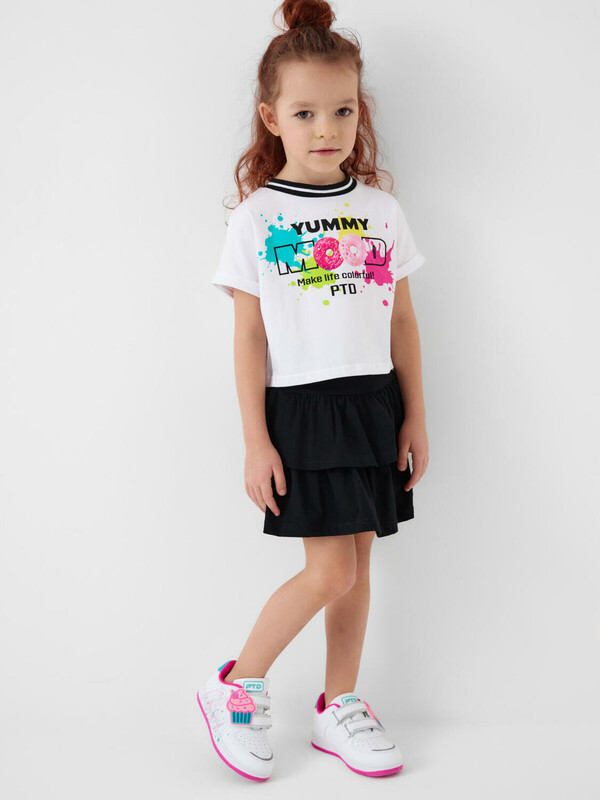 Легкий детский комплект для девочки. Выполнен из мягкого хлопкового трикотажа джерси, состоящий из укороченной футболки и юбки-шорт. Футболка свободного кроя с ярким принтом. Пышная юбка на резинке с воланами, внутри имеет удобные шорты, что делает модель практичной для активного отдыха.