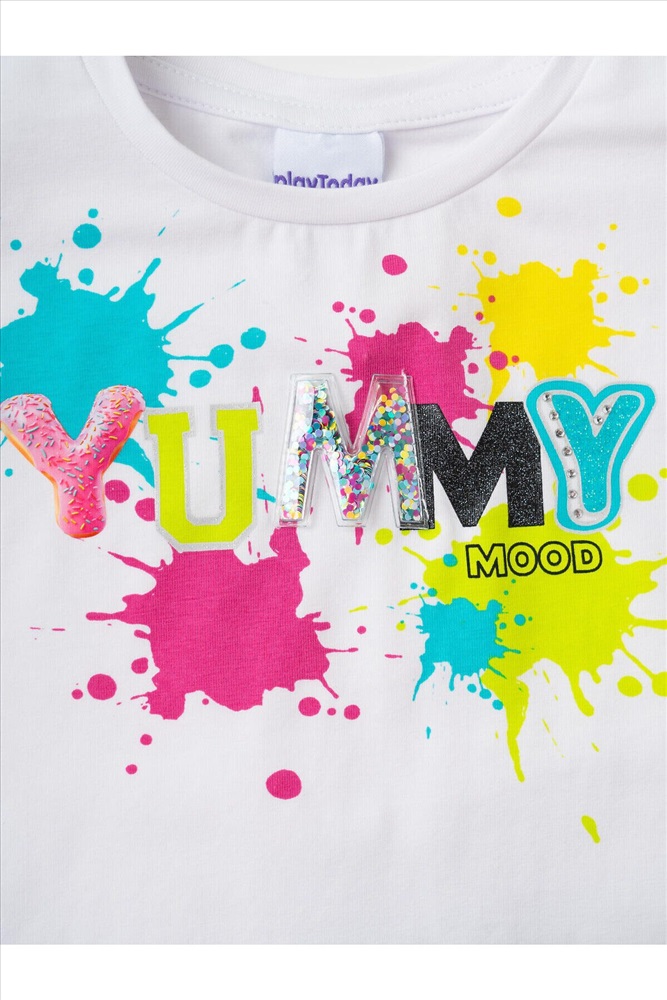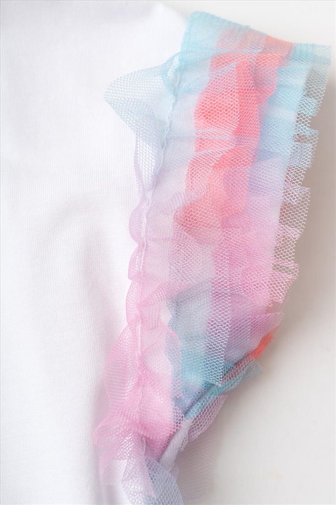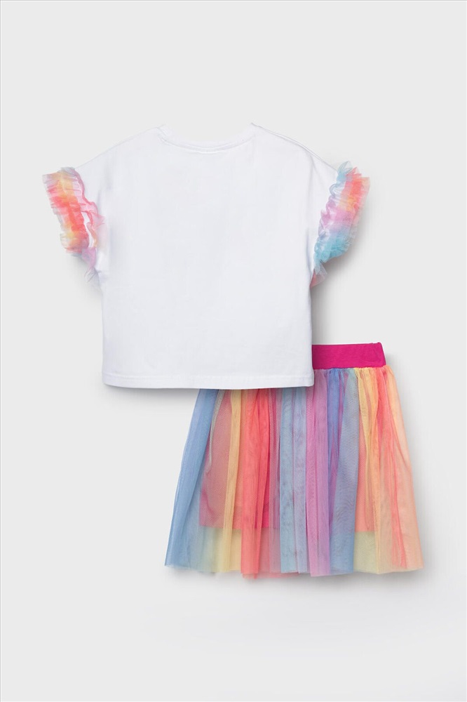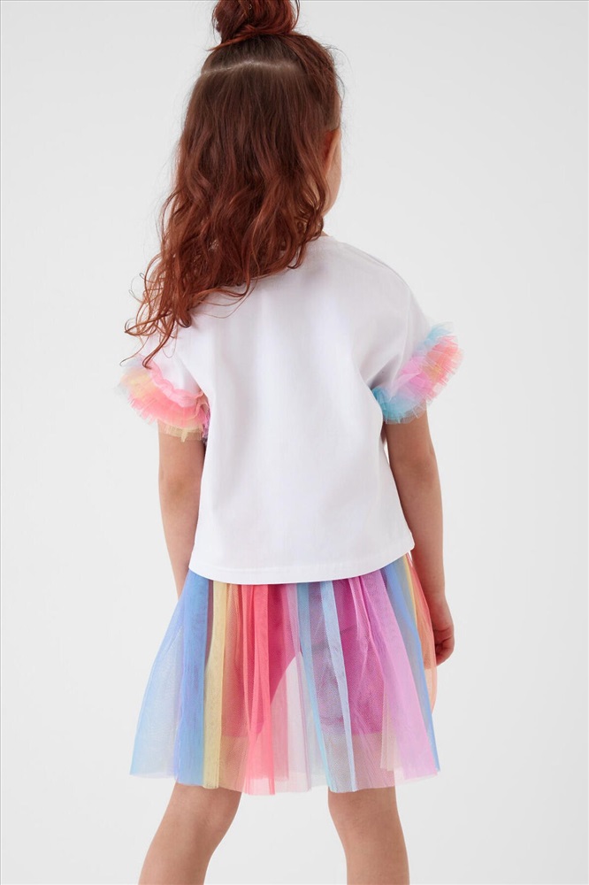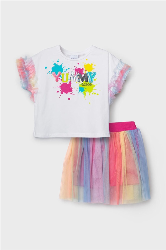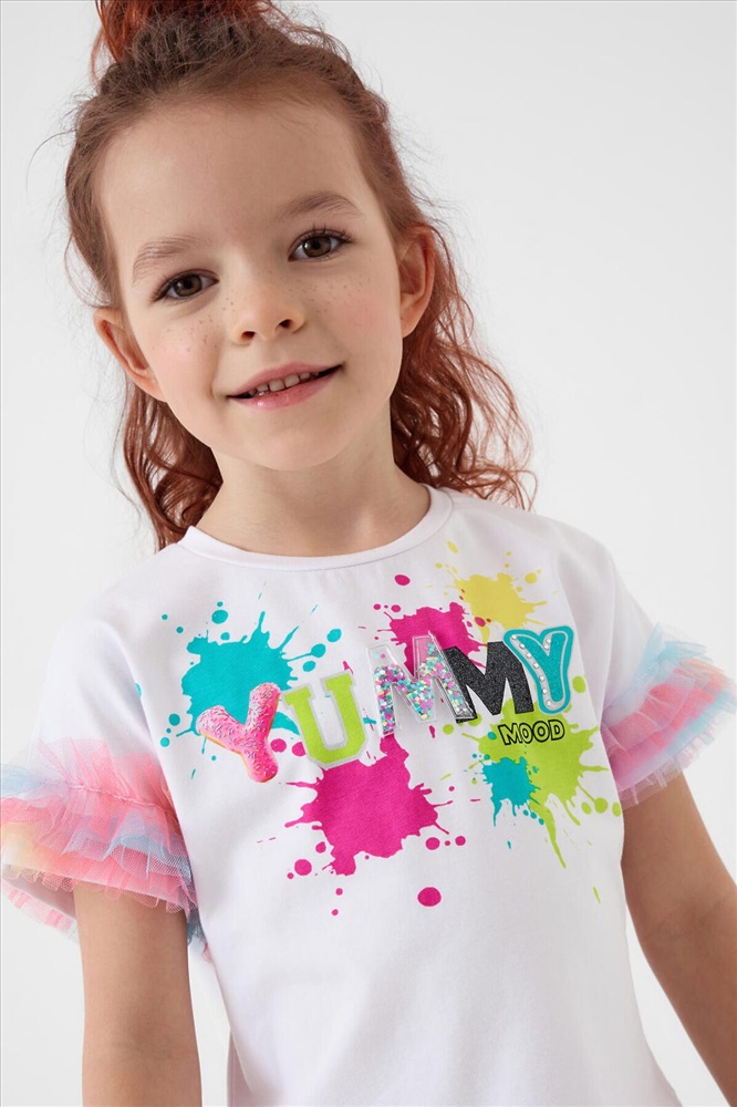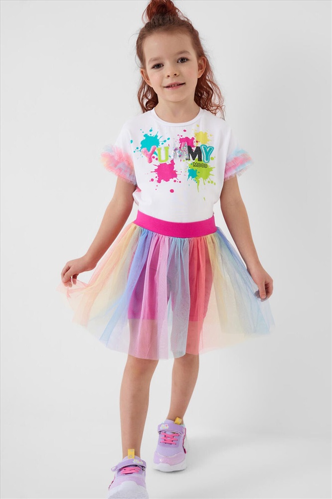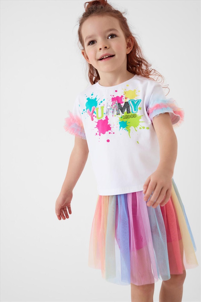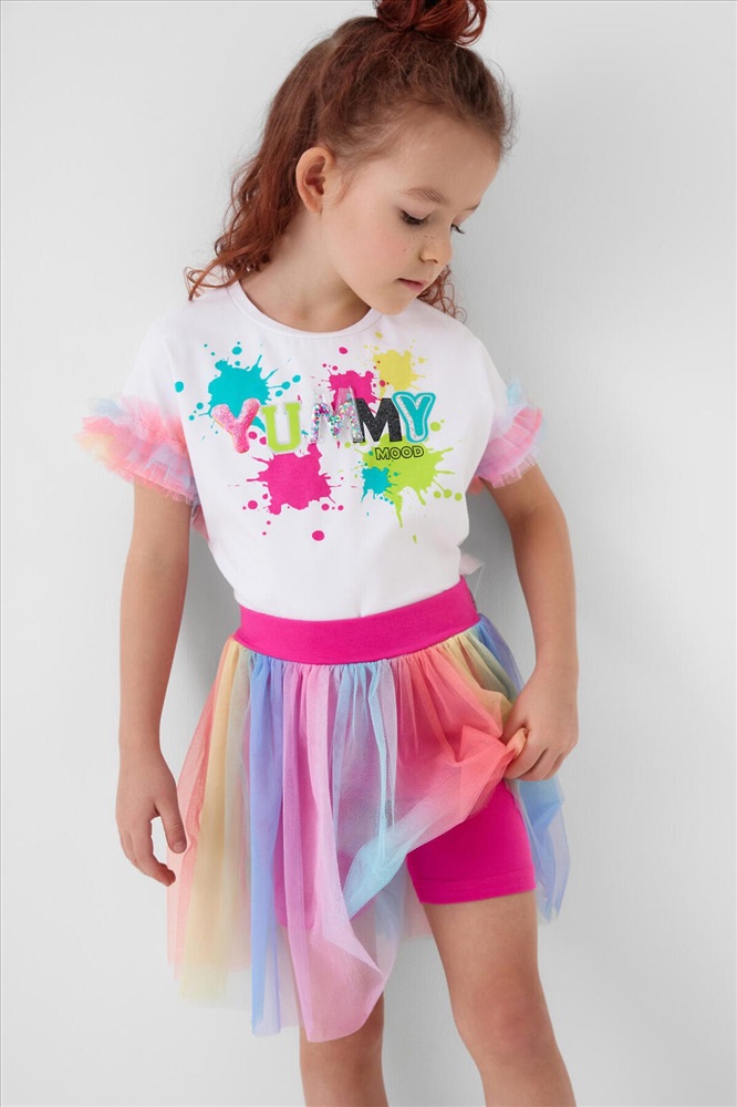 ID товара: 1240354 Состав: Джемпер- 95% хлопок, 5% эластан, Шорты- Ткань 1- 95% хлопок, 5% эластан; Ткань 2- 100% полиэстер Сезон: Весна/Лето Яркий детский трикотажный комплект для девочки. Состоит из футболки и юбки-шорт. Футболка прямого кроя, с короткими рукавами украшена эффектным принтом. Главный акцент — объемные рукава с многослойными воланами из легкой сетки. Юбка-шорты выполнена в том же стиле: сверху — пышная сетчатая юбка с градиентным принтом, снизу — удобные трикотажные шорты. Пояс на мягкой резинке обеспечивает комфортную посадку. Комментарии к товару
