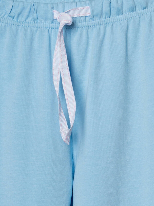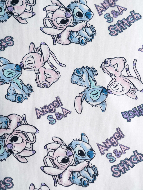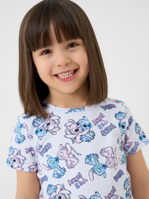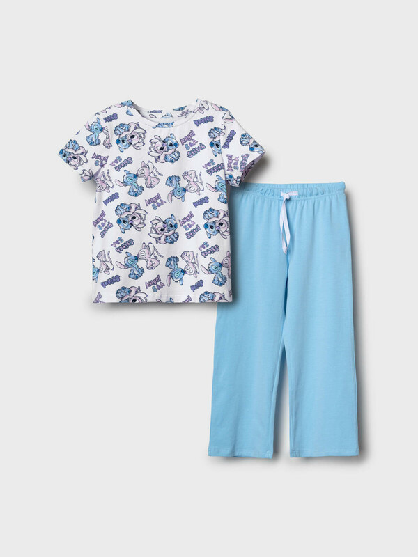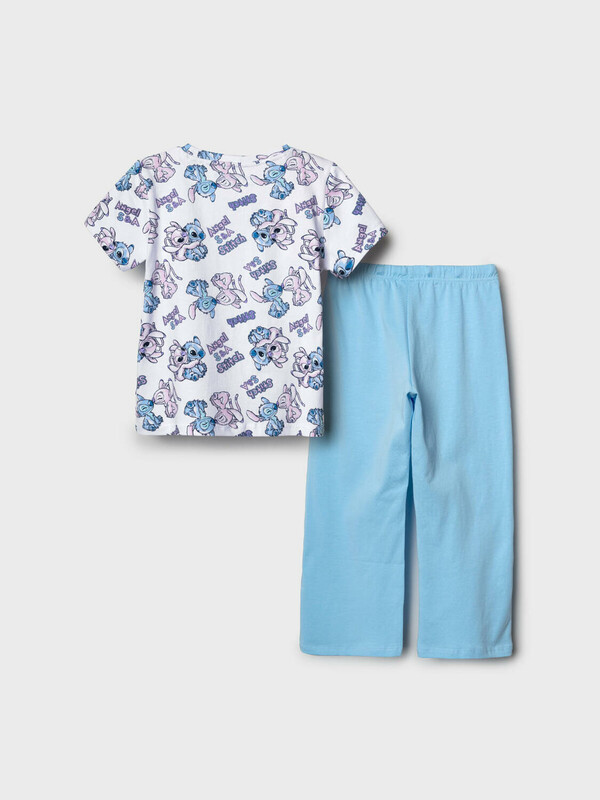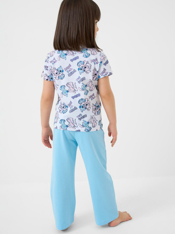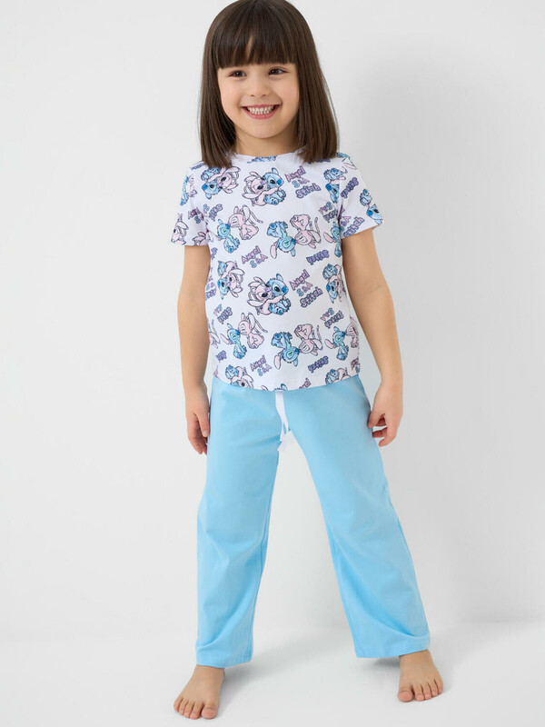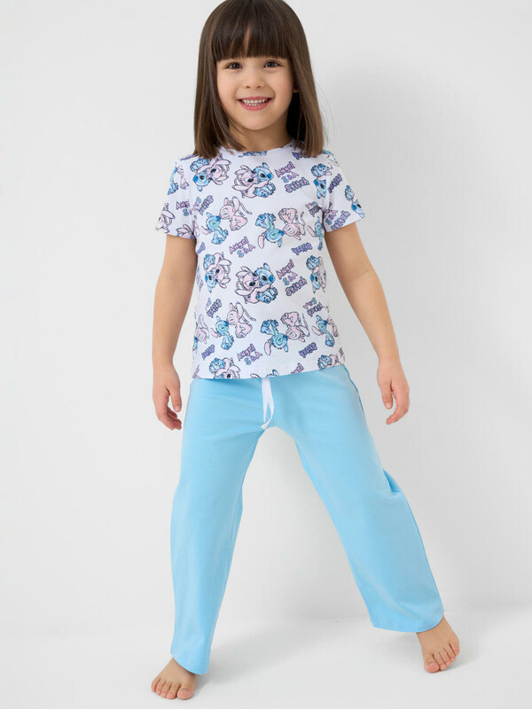 Пижама детская с Лило и Стич для девочки. Комплект состоит из футболки, прямого кроя и длинных брюк. Футболка белая с ярким и милым принтом. Брюки — на удобной резинке. Материал — мягкий, хлопковый трикотаж, приятный к телу.