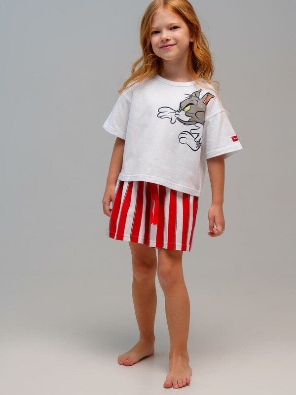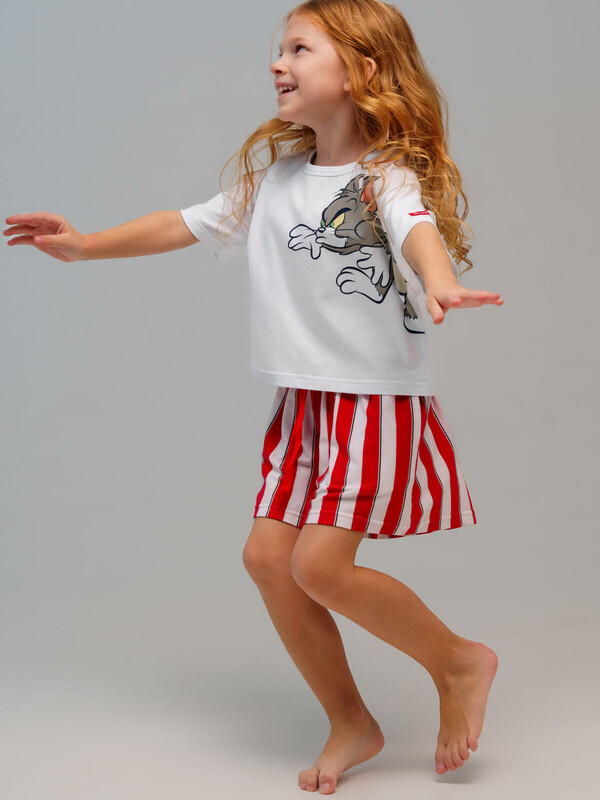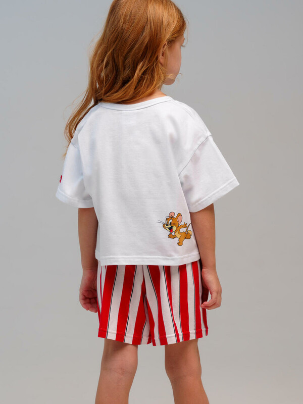Костюм детский для девочки. Футболка оверсайз, шорты из эластичного и приятного на ощупь трикотажа джерси. Шорты на резинке со шнурком. Высокое содержание хлопка 95%. Благодаря наличию эластана в составе ткани изделие держит форму и меньше мнется. Модель выполнена из качественного и приятного на ощупь трикотажа.