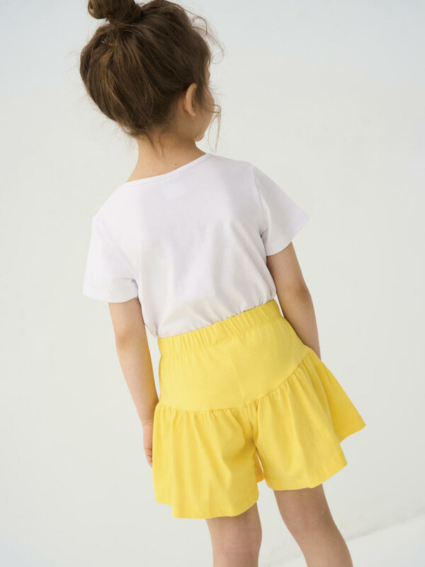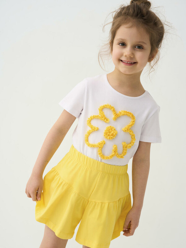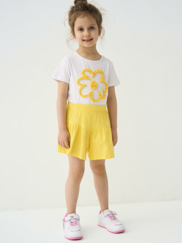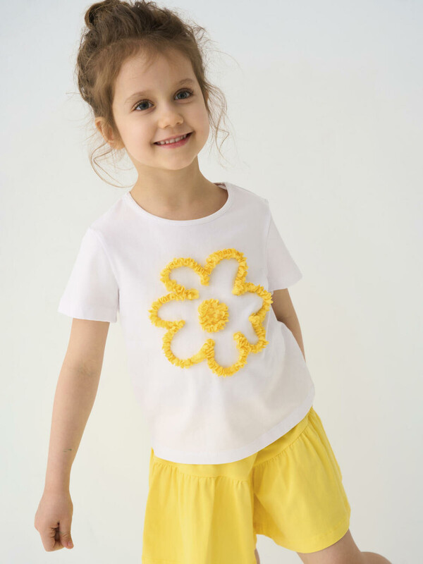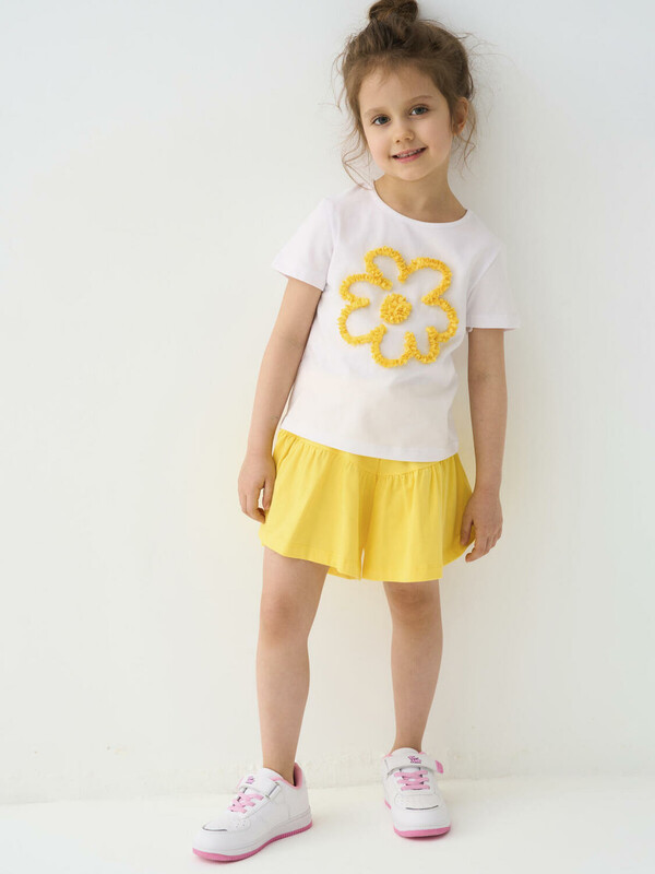 Детский костюм для девочки. Состоит из футболки с коротким рукавом и шорт. Выполнен из хлопкового трикотажа. Футболка прямого кроя, с красочным принтом цветка. Шорты свободные, хорошо сидят на талии благодаря эластичному поясу.
