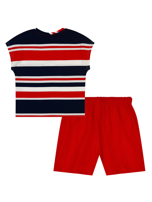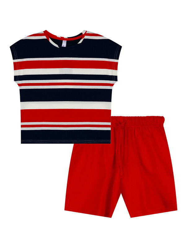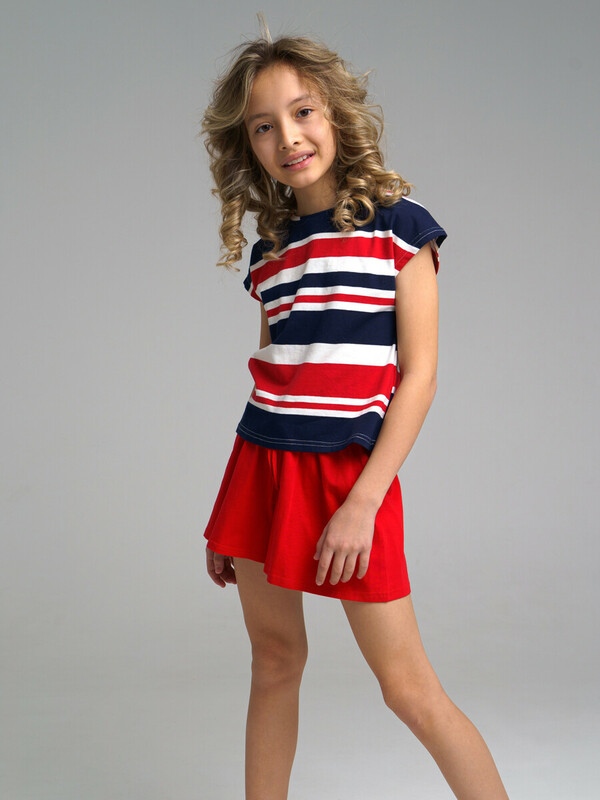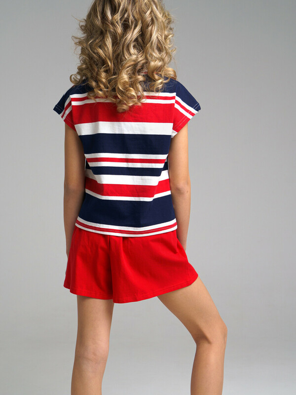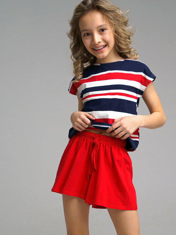 Комплект: футболка, шорты из качественного эластичного и приятного на ощупь трикотажа джерси. Футболка укороченная, без рукавов. Высокое содержание хлопка 95%. Благодаря наличию эластана в составе ткани, изделие держит форму и меньше мнется. Принт сохраняет первоначальный вид даже после многочисленных стирок. Эластичный пояс со шнурком.