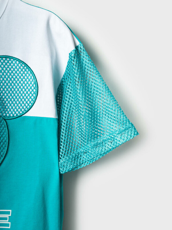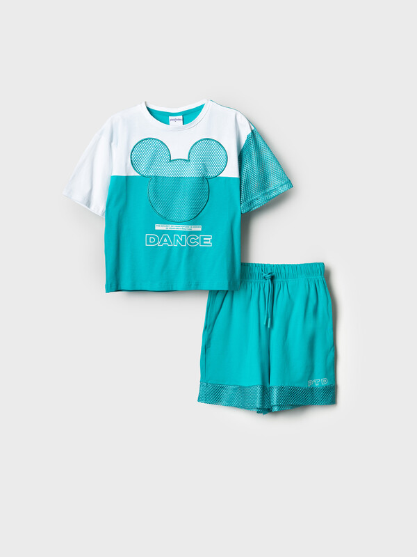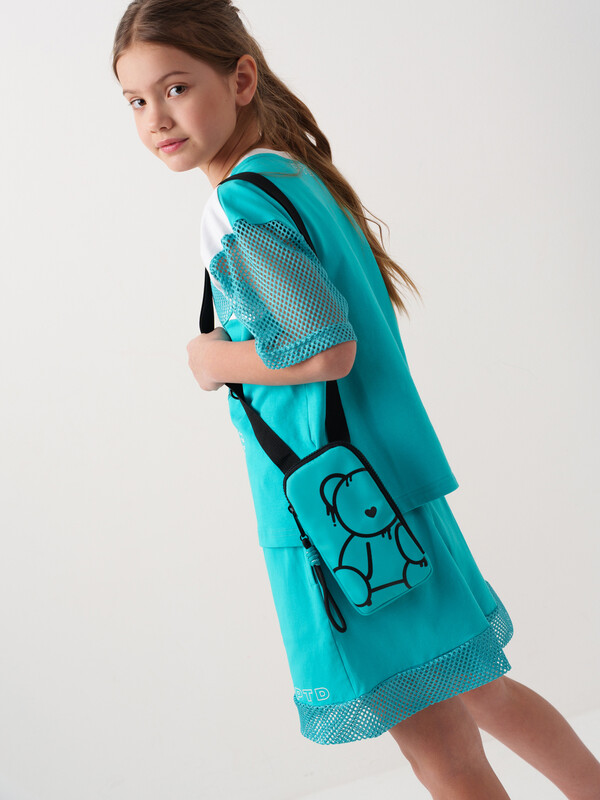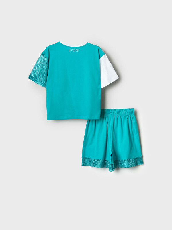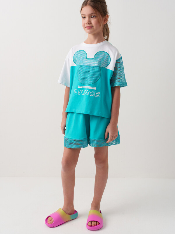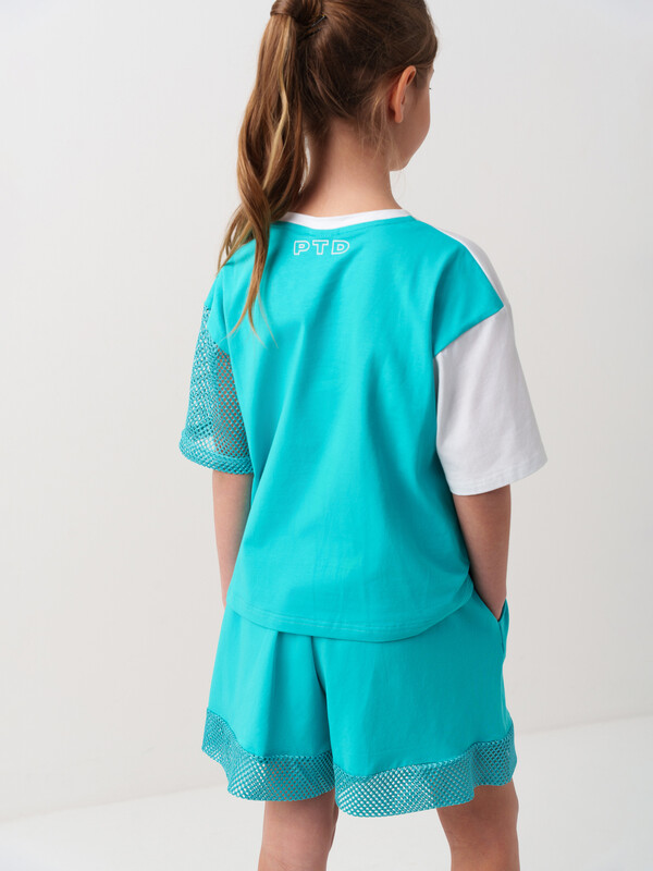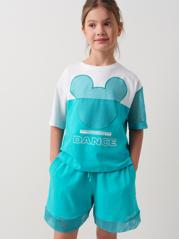 Костюм для девочки подростка. Состоит из футболки с коротким рукавом и удобных шорт. Выполнен из хлопкового трикотажа. Футболка свободного кроя, оформлена крупным графичным принтом. Рукав и принт выполнены из сетки. Шорты свободные, с эластичным поясом и декоративным шнурком для регулировки посадки.