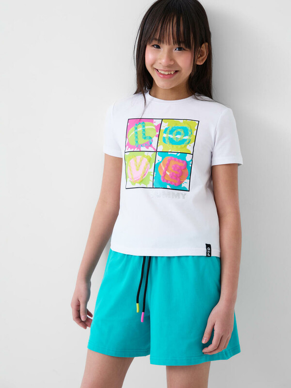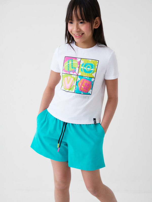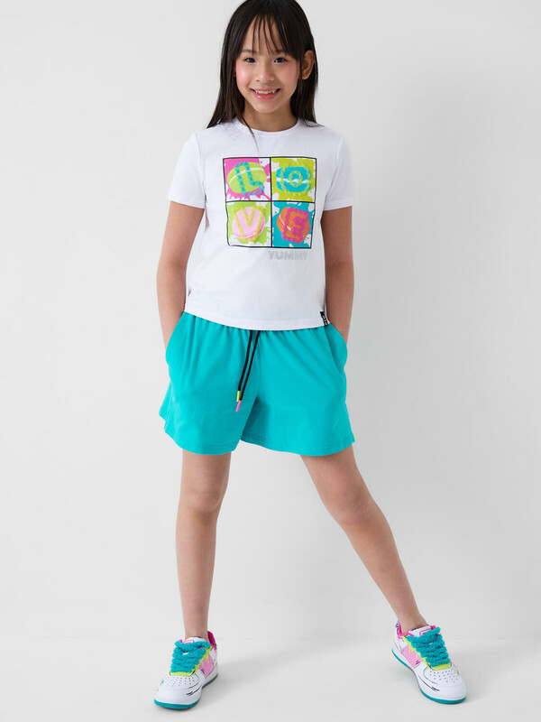 Стильный костюм для девочки подростка. Состоит из футболки с коротким рукавом и шорт. Выполнен из хлопкового трикотажа. Футболка прямого кроя, с красочным принтом и нашивкой. Шорты свободные, короткие, хорошо сидят на талии благодаря эластичному поясу и регулирующему шнурку. Удобные боковые карманы.