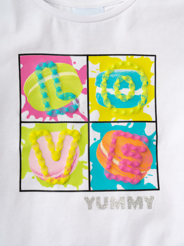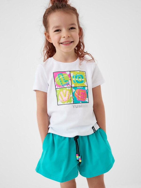 Детский костюм для девочки. Состоит из футболки с коротким рукавом и шорт. Выполнен из хлопкового трикотажа. Футболка прямого кроя, с красочным принтом и нашивкой. Шорты свободные, короткие, хорошо сидят на талии благодаря эластичному поясу и регулирующему шнурку. Удобные боковые карманы.