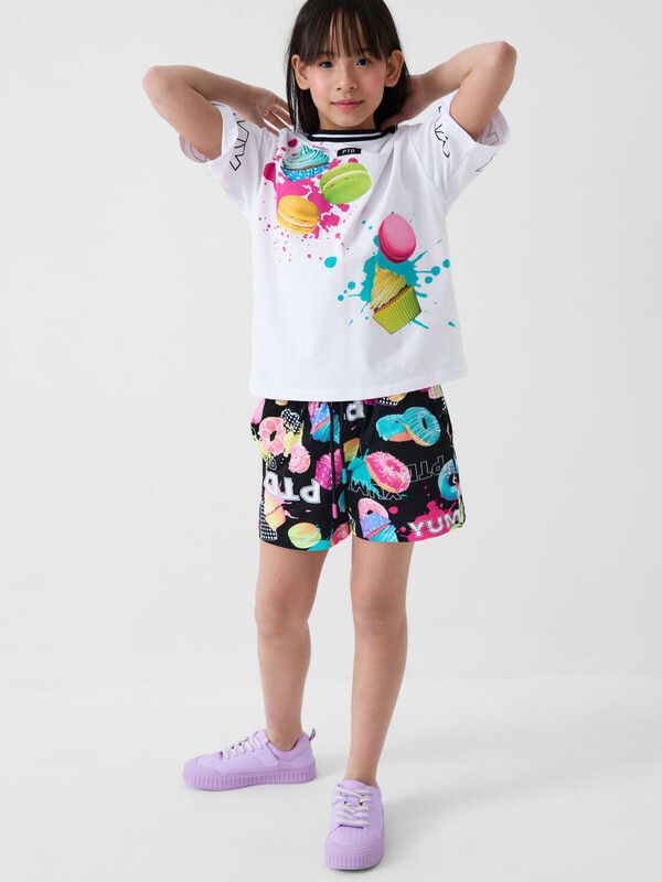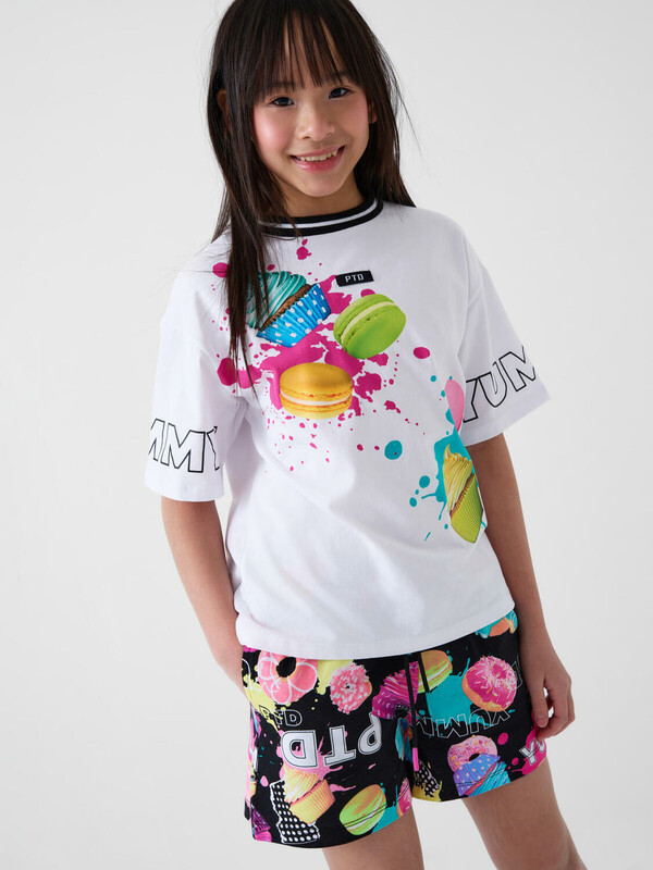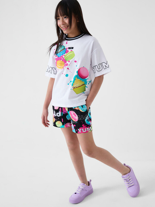 Стильный костюм для девочки подростка. Состоит из футболки с коротким рукавом и шорт. Выполнен из хлопкового трикотажа. Футболка оверсайз с красочным принтом. Шорты свободные, короткие, хорошо сидят на талии благодаря эластичному поясу и регулирующему шнурку. Удобные боковые карманы.