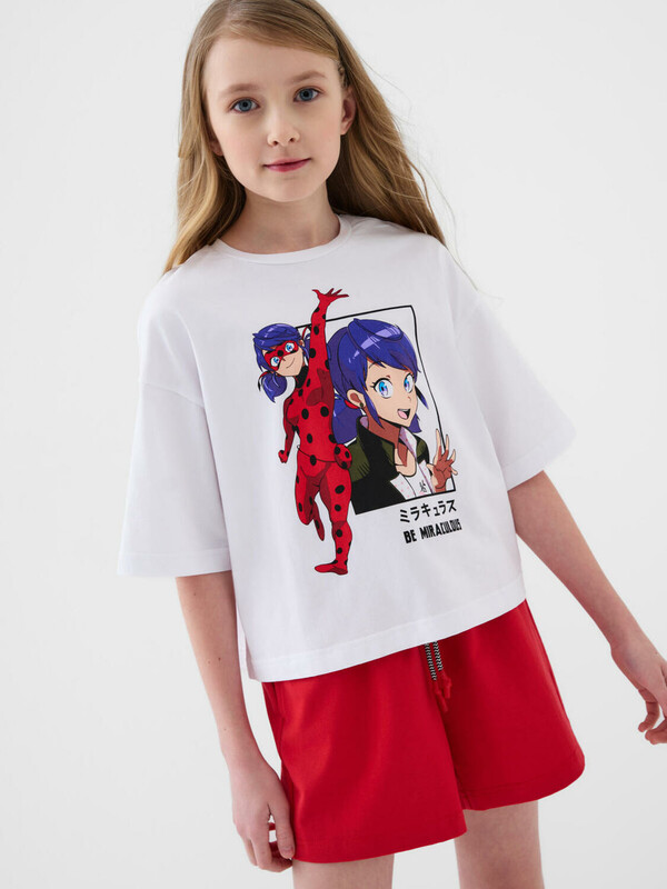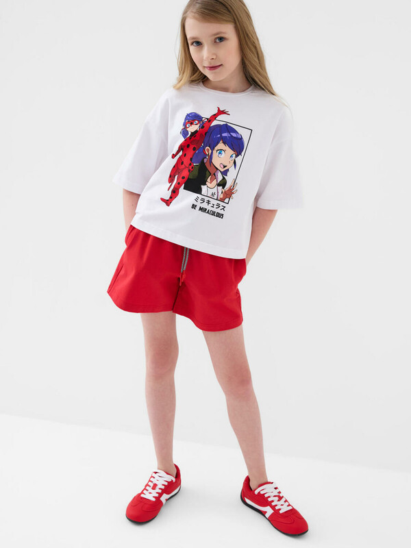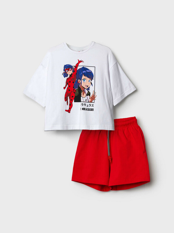 Костюм для девочки подростка. Состоит из футболки и шорт. Выполнен из хлопкового трикотажа. Футболка оверсайз, с коротким рукавом. Яркий принт с любимым персонажем "Леди Баг и Супер-Кот". Шорты свободные, с эластичным поясом и шнурком для регулировки посадки. По бокам расположены карманы.
