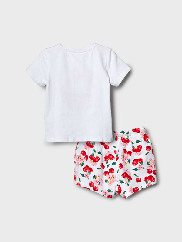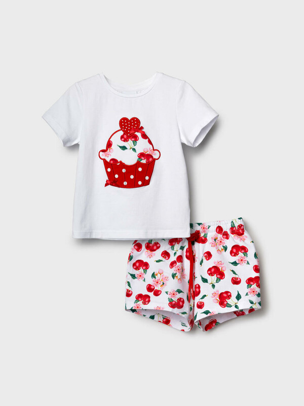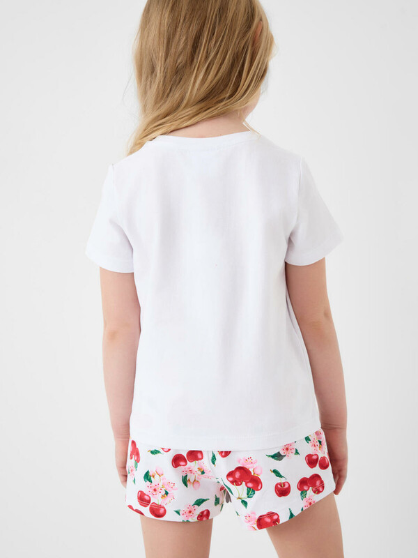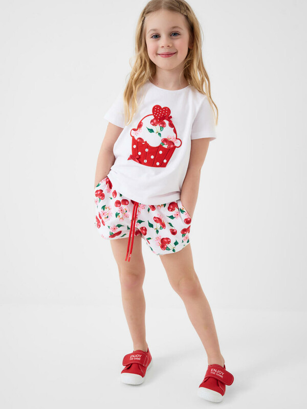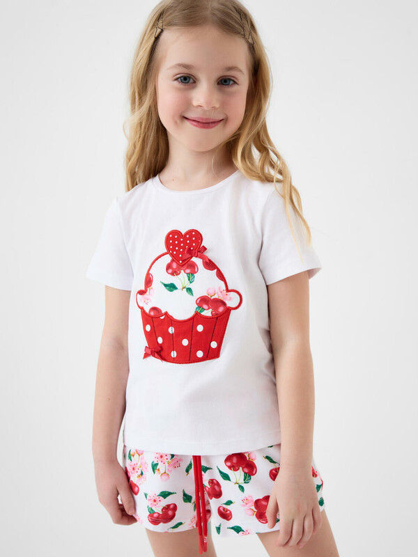 Детский костюм для девочки. Состоит из футболки с коротким рукавом и шорт. Выполнен из хлопкового трикотажа. Футболка прямого кроя, с красочным принтом и объемными бантиками. Шорты свободные, хорошо сидят на талии благодаря эластичному поясу и регулирующему шнурку. Удобные боковые карманы.