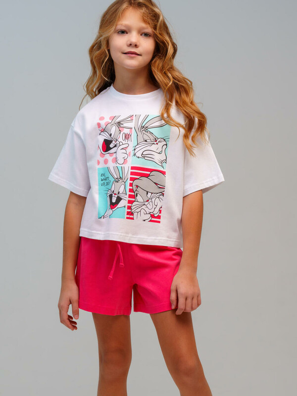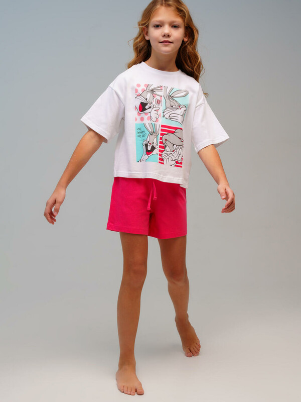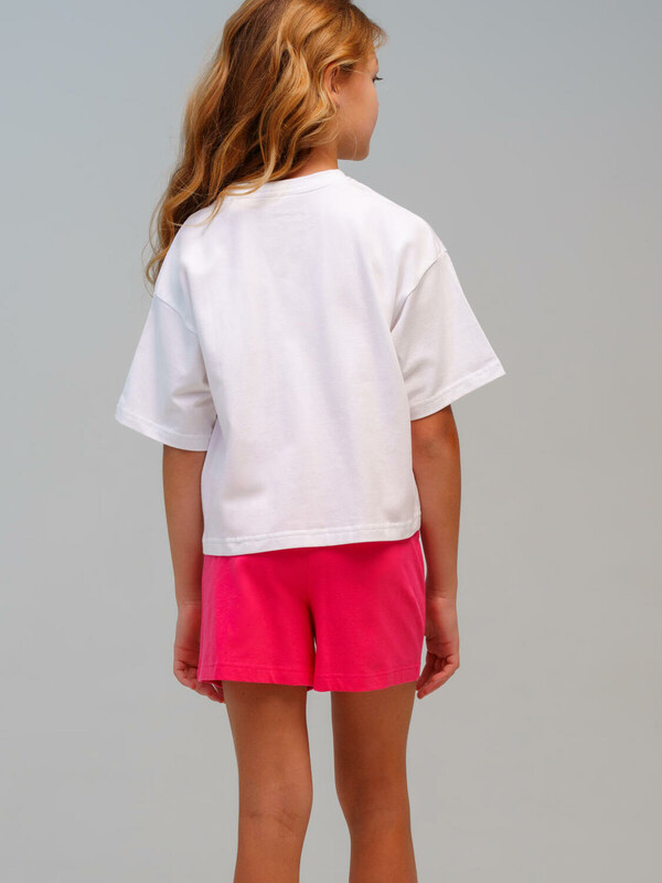 Пижама для девочки подростка. Футболка и шорты из эластичного и приятного на ощупь трикотажа. Шорты на резинке со шнурком. Высокое содержание хлопка 95%. Благодаря наличию эластана в составе ткани изделие держит форму и меньше мнется. Модель выполнена из качественного и приятного на ощупь трикотажа.