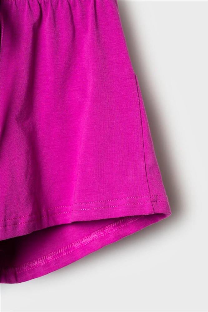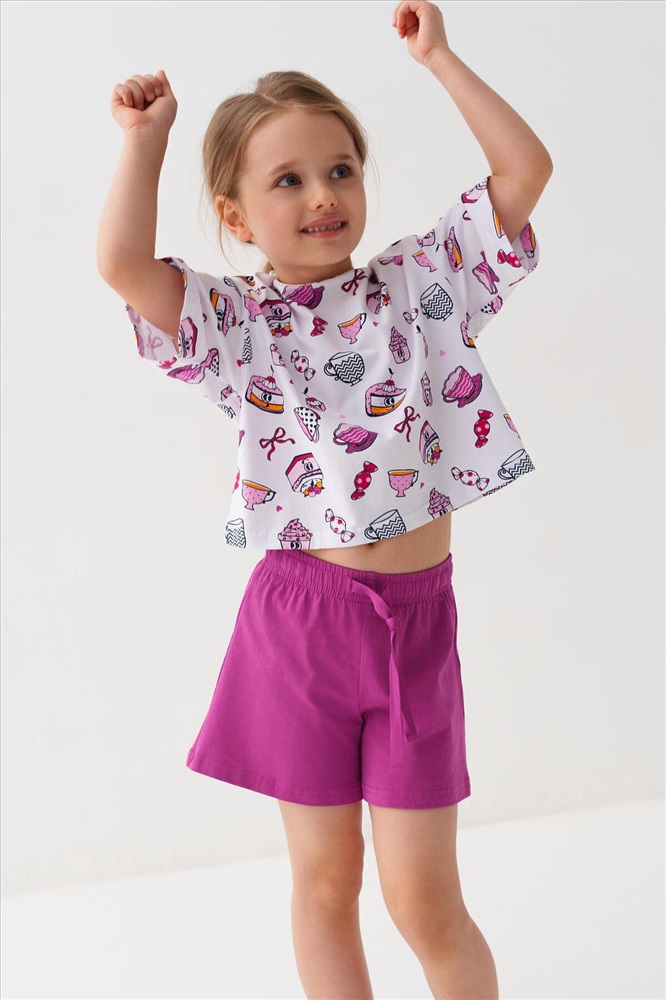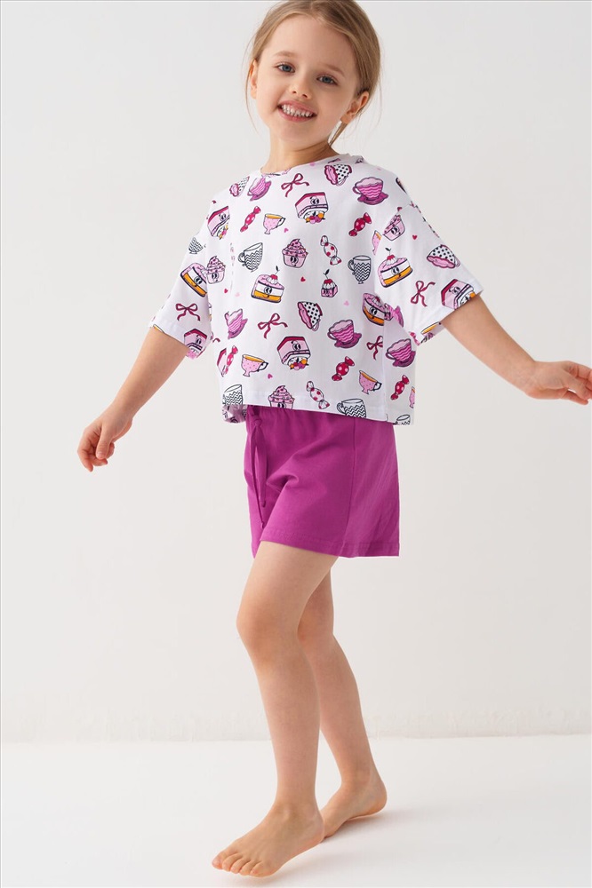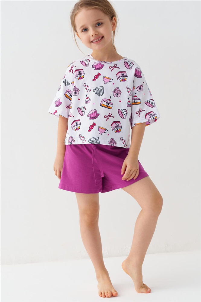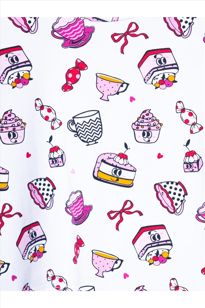 Детская пижама для девочки. Состоит из футболки оверсайз и шорт. Футболка белого цвета украшена ярким принтом с изображением сладостей — кексов, ягод, чашек. У неё короткие рукава и круглая горловина. Шорты однотонные с мягким эластичным поясом спереди. Пижама выполнена из мягкого, хлопкового трикотажа.