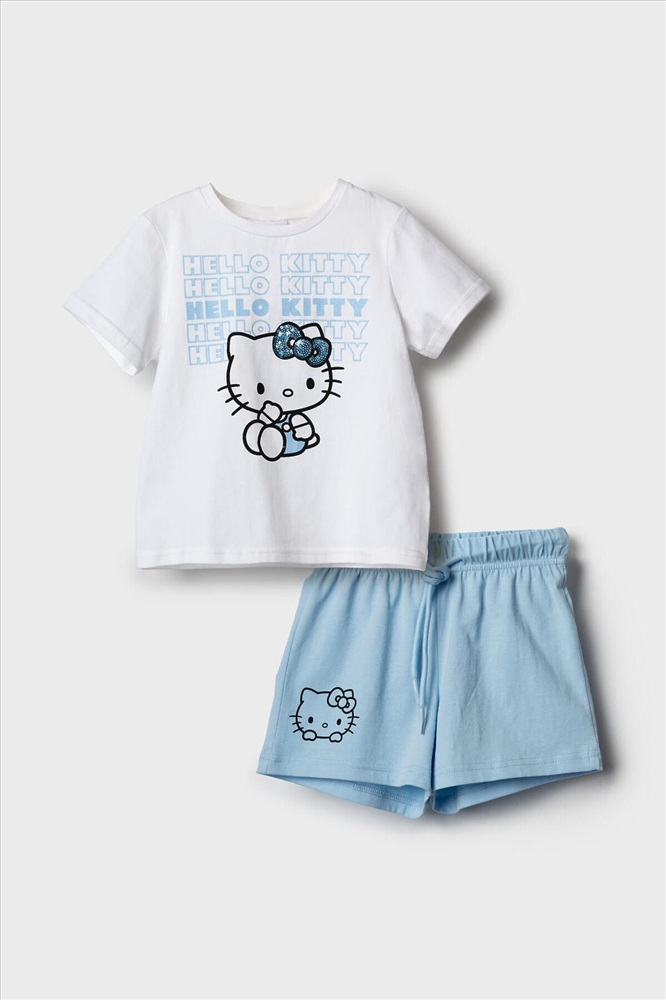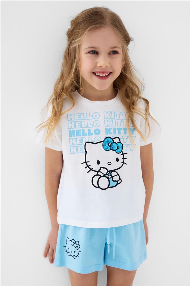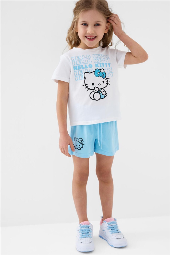 ID товара: 1240135 Состав: 95% хлопок, 5% эластан Сезон: Весна/Лето Детский костюм для девочки. Состоит из футболки и шорт. Выполнен из хлопкового трикотажа. Футболка прямого кроя, с коротким рукавом. Яркий принт с любимым персонажем "Hello Kitty". Шорты свободные, с эластичным поясом и шнурком для регулировки посадки. Комментарии к товару
