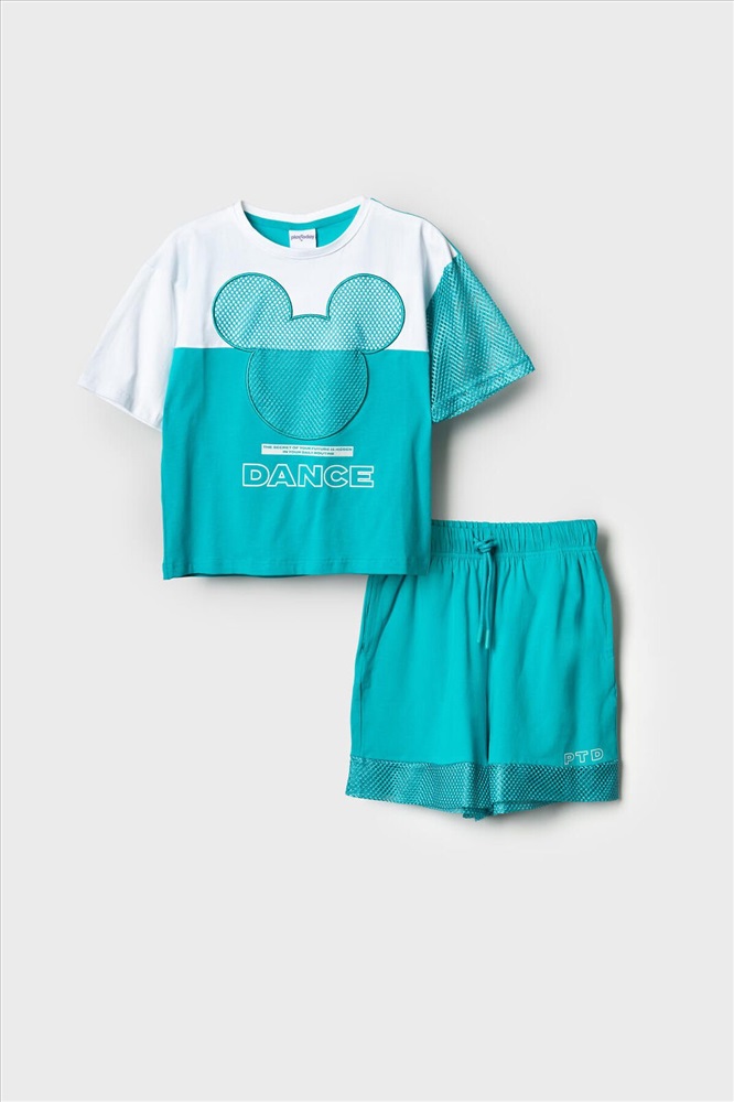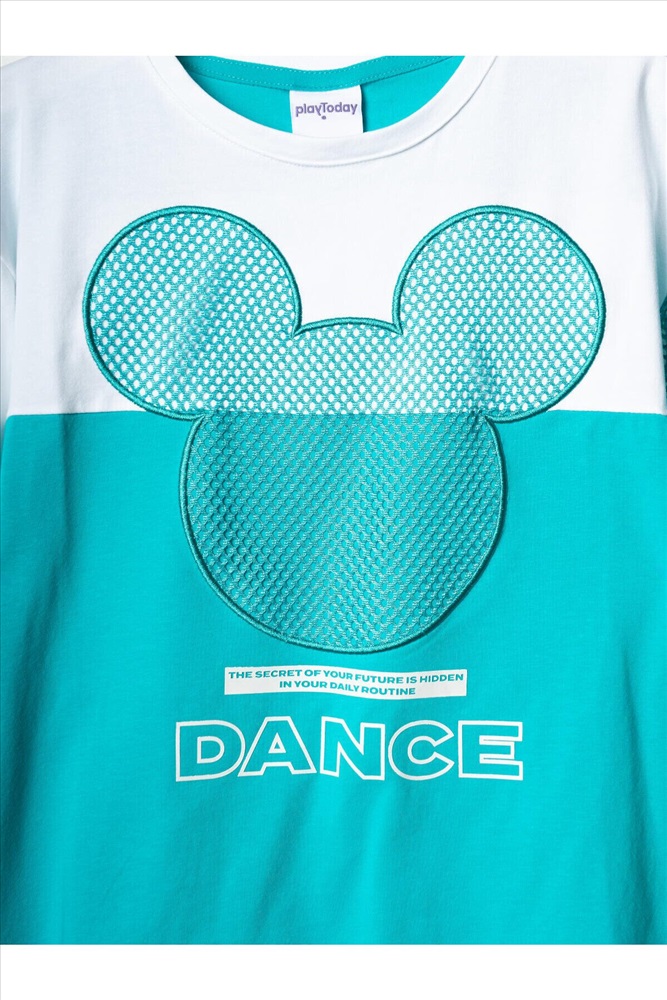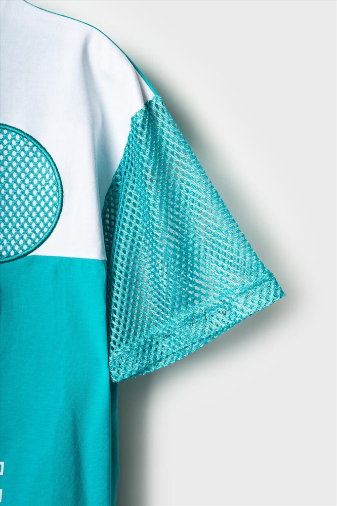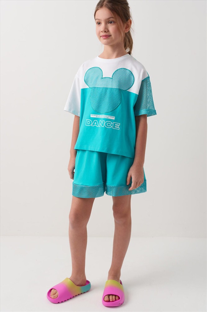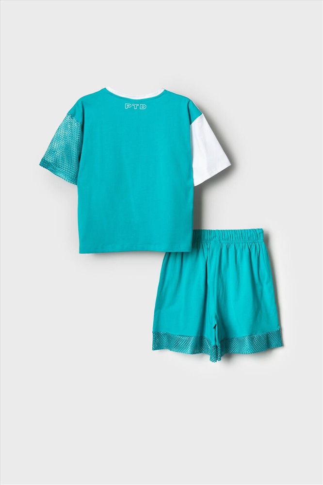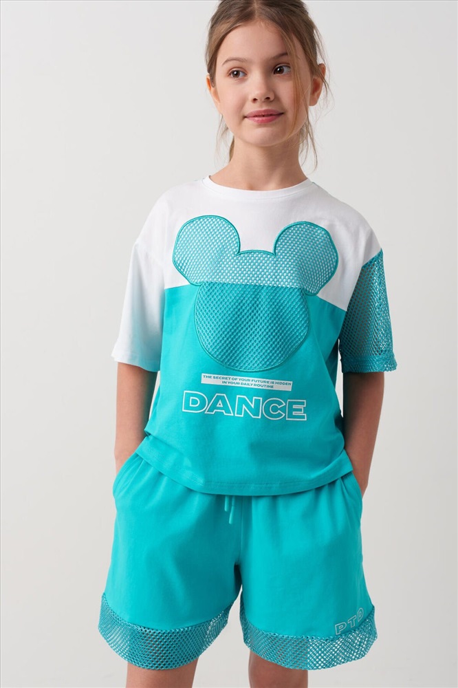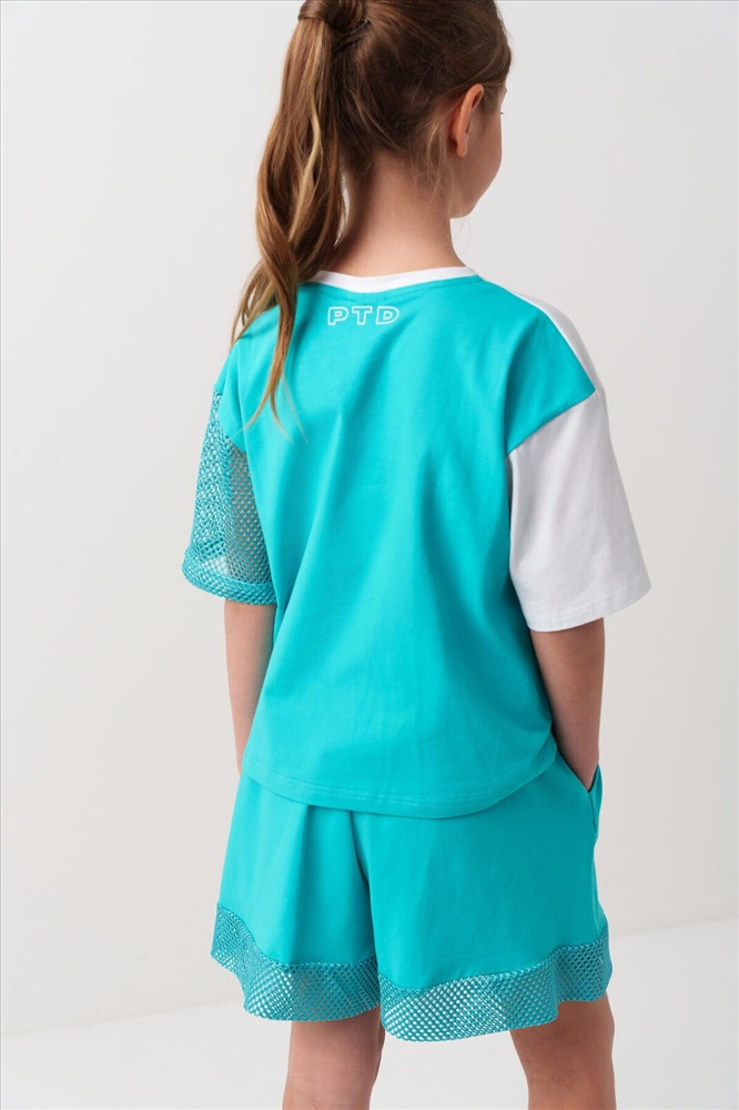 ID товара: 1240140 Состав: Ткань 1- 95% хлопок, 5% эластан; Ткань 2- 100% полиэстер Сезон: Весна/Лето Костюм для девочки подростка. Состоит из футболки с коротким рукавом и удобных шорт. Выполнен из хлопкового трикотажа. Футболка свободного кроя, оформлена крупным графичным принтом. Рукав и принт выполнены из сетки. Шорты свободные, с эластичным поясом и декоративным шнурком для регулировки посадки. Комментарии к товару
