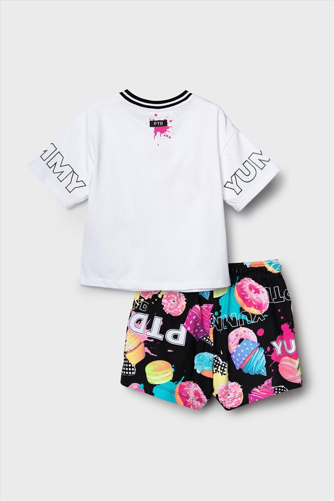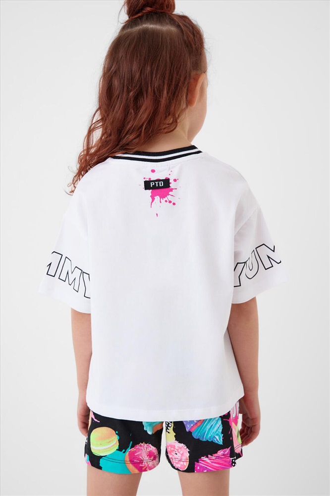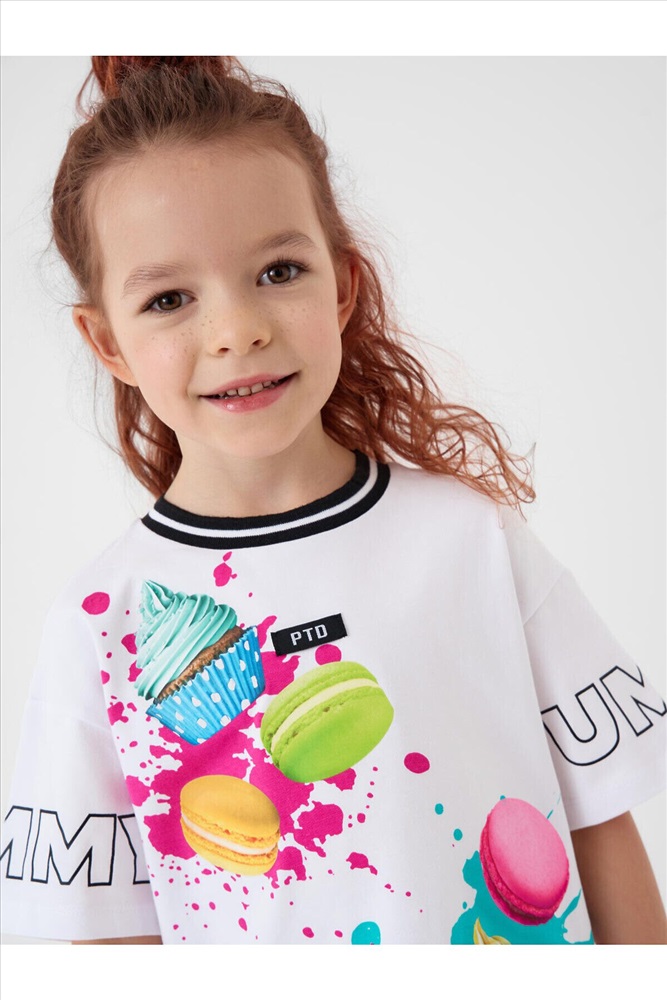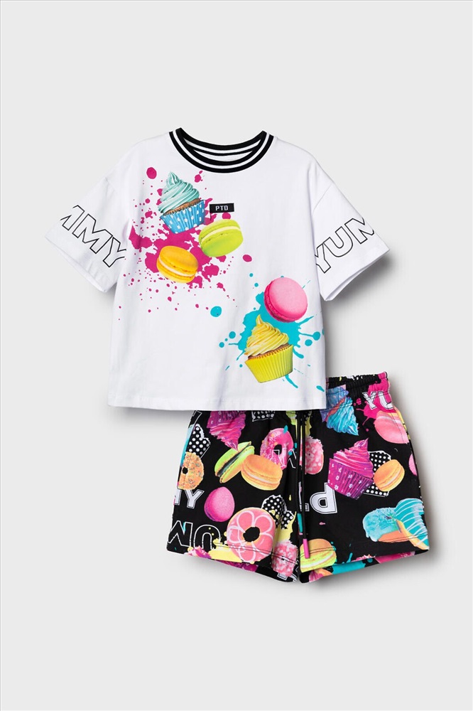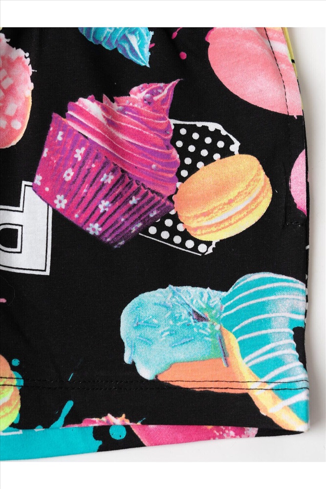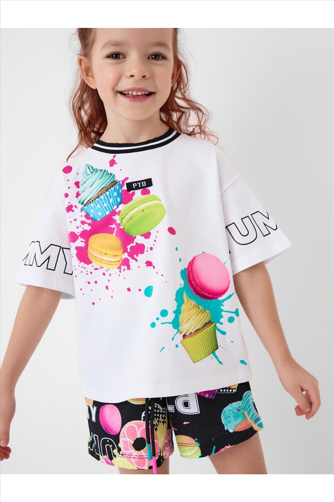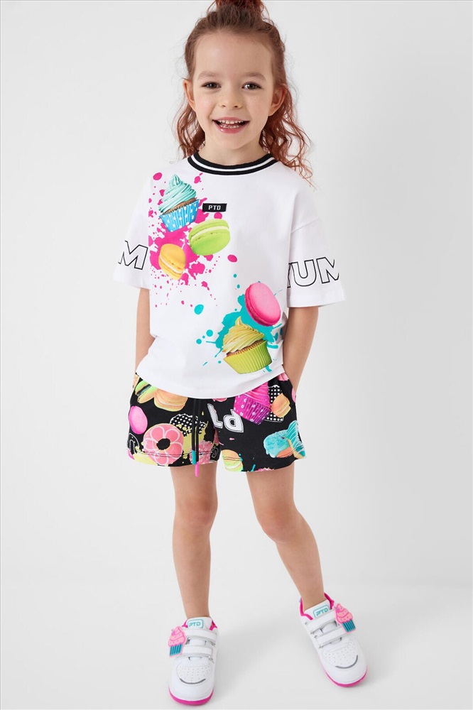 ID товара: 1240326 Состав: Футболка- 95% хлопок, 5% эластан, Шорты- 100% хлопок Сезон: Весна/Лето Детский костюм для девочки. Состоит из футболки с коротким рукавом и шорт. Выполнен из хлопкового трикотажа. Футболка оверсайз с красочным принтом. Шорты свободные, короткие, хорошо сидят на талии благодаря эластичному поясу и регулирующему шнурку. Удобные боковые карманы. Комментарии к товару