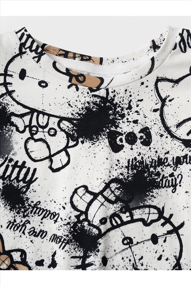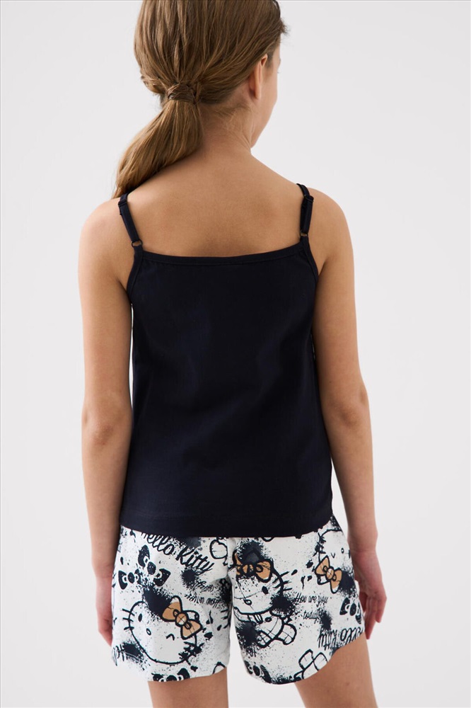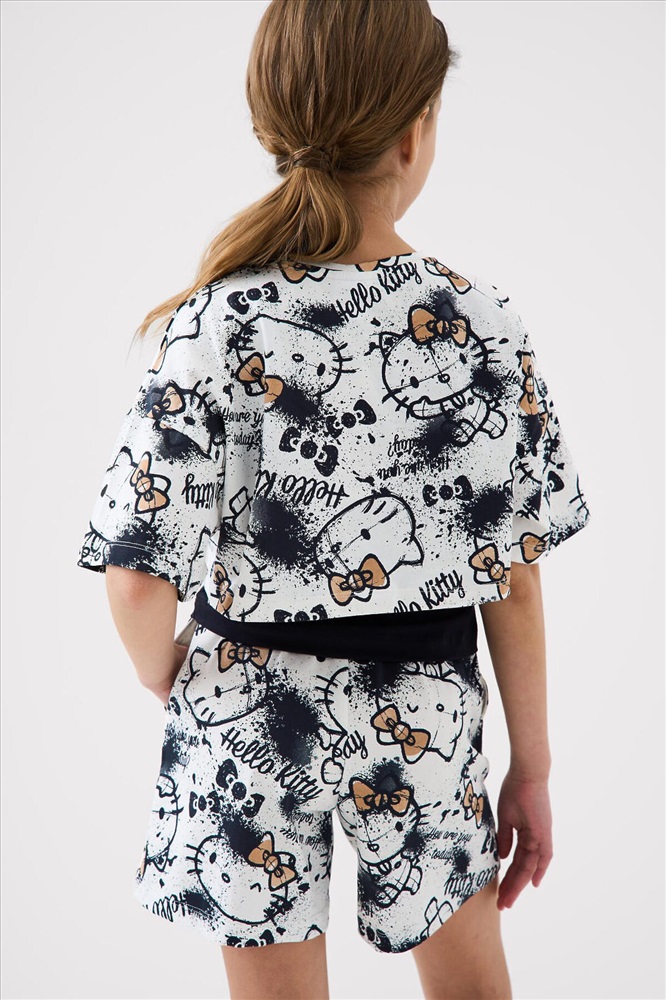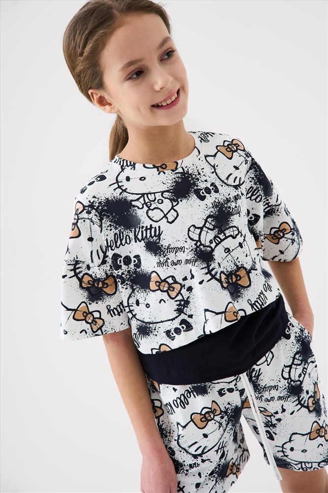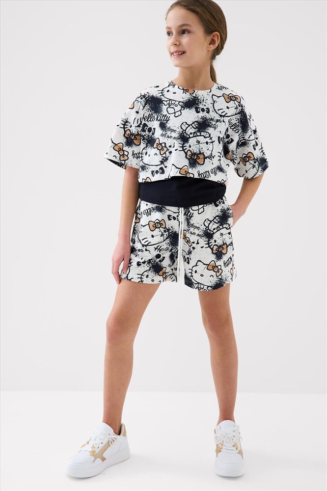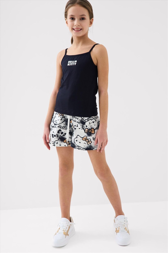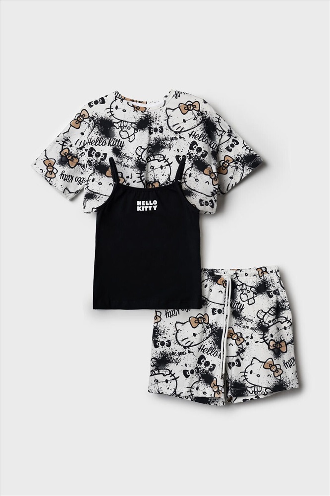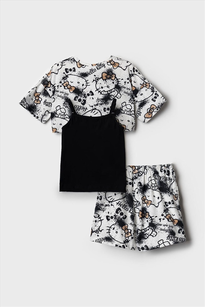ID товара: 1240137 Состав: 95% хлопок, 5% эластан Сезон: Весна/Лето Летний комплект для девочки подростка. Состоит из трёх предметов: укороченной футболки с короткими рукавами, топа на тонких бретелях и шорт. Футболка и шорты выполнены из мягкого хлопкового трикотажа джерси с принтом Hello Kitty. Топ однотонный с аккуратным небольшим принтом спереди. Шорты с удобным эластичным поясом и шнурком, обеспечивают комфортную посадку. Комментарии к товару