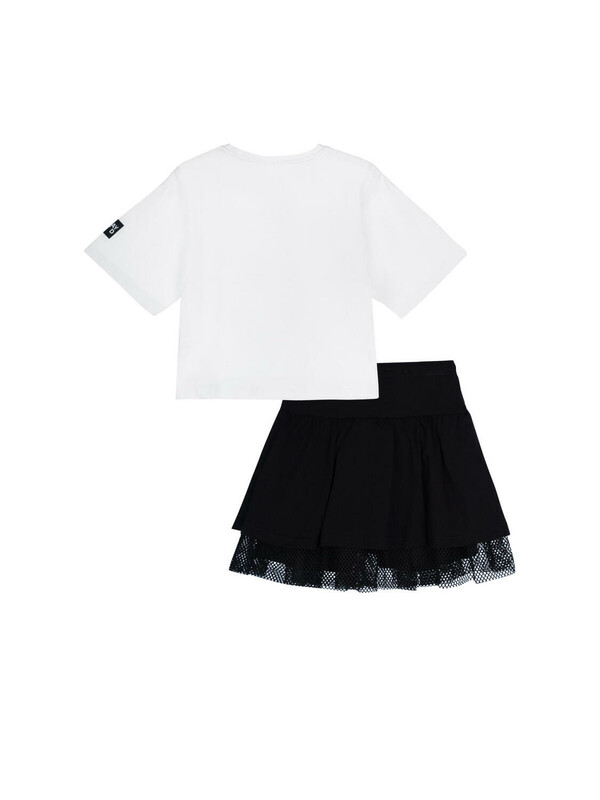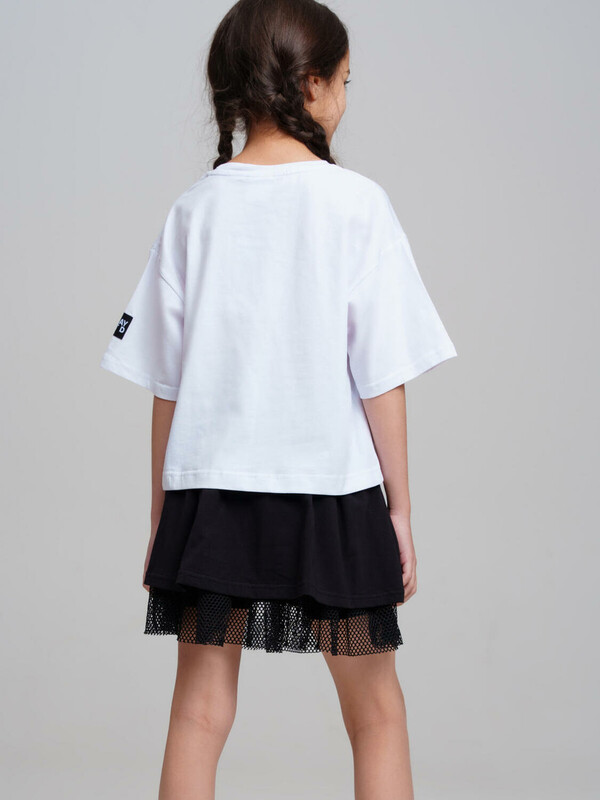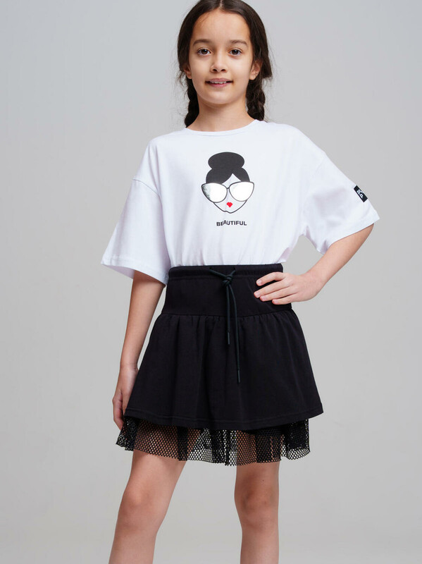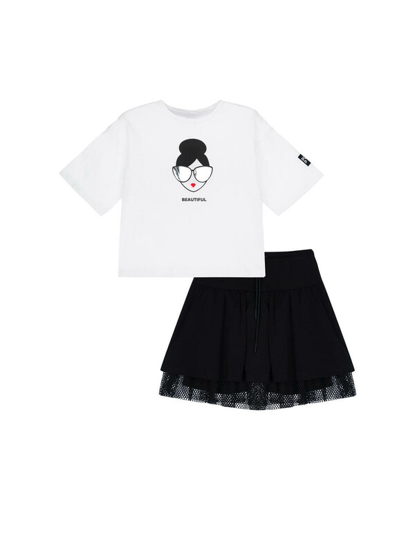Костюм для девочки подростка.Футболка и юбка-шорты классической посадки. Костюм из качественного и приятного на ощупь трикотажа джерси с высоким содержанием хлопка 95%. Благодаря наличию эластана в составе ткани изделие проще в уходе и держит форму. Юбка шорты на резинке. Декор из сетки. Модель выполнена из качественного и приятного на ощупь трикотажа.