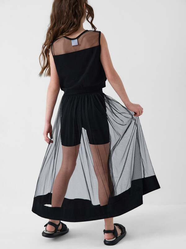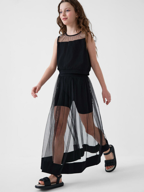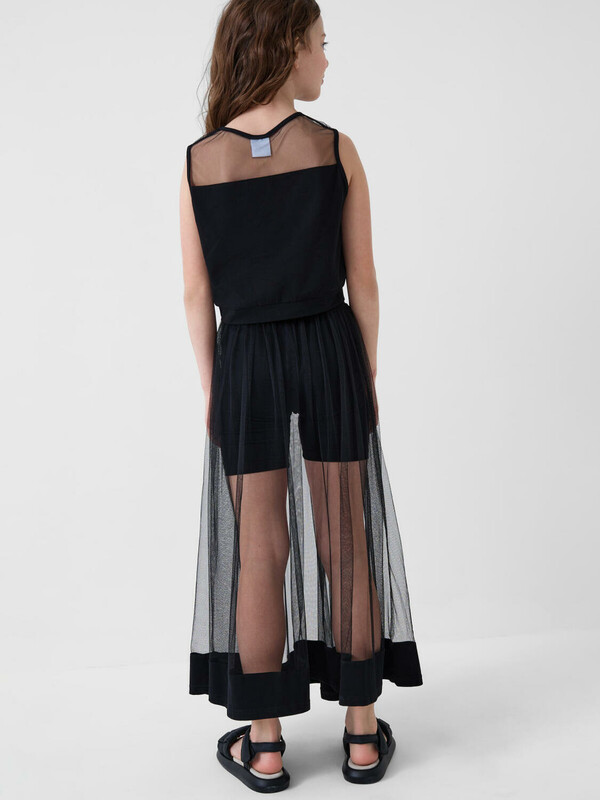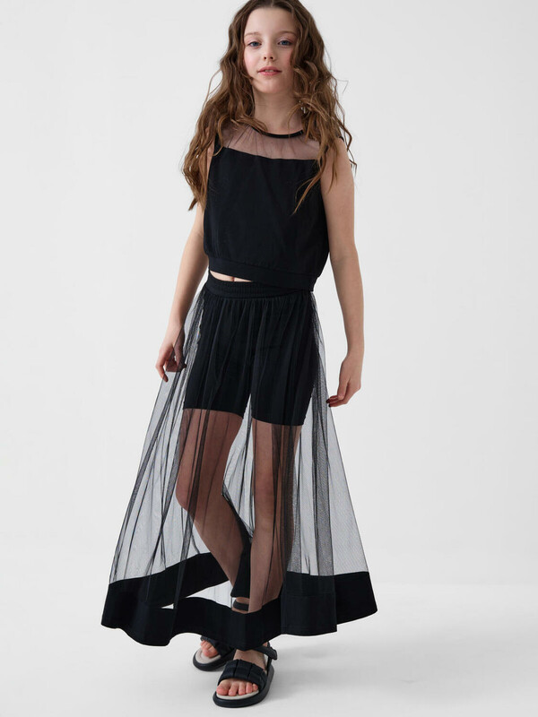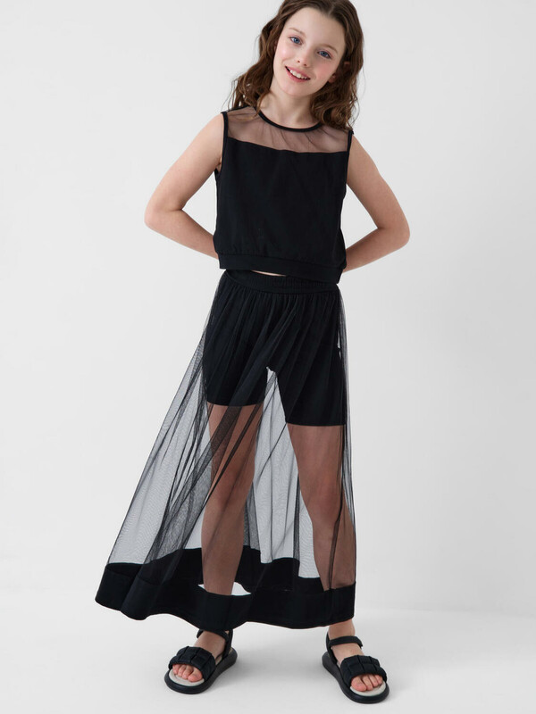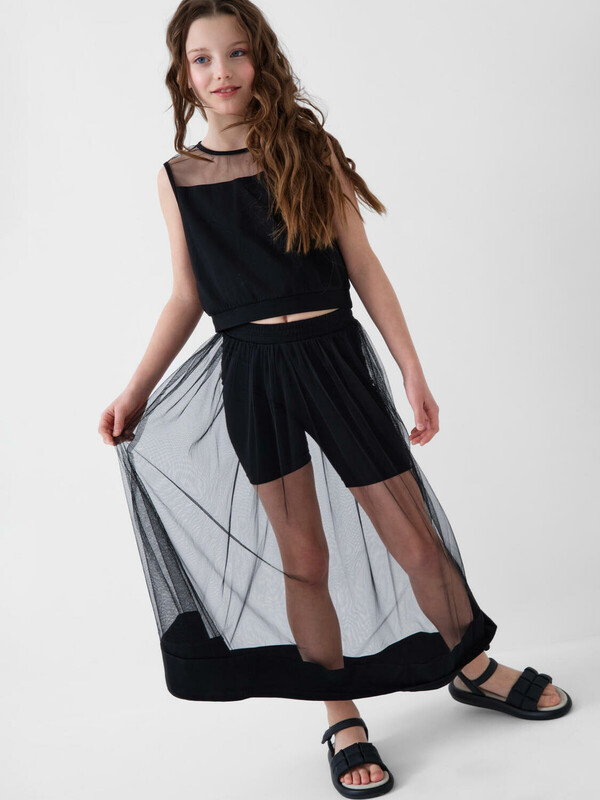 Стильный комплект для девочки подростка. Выполнен из комбинации трикотажа и сетки, состоит из укороченного топа и юбки-шорт. Верх выполнен в минималистичном дизайне: плотный трикотаж внизу и полупрозрачная сетка в зоне декольте и плеч создают модный контраст. Юбка-шорты выглядят как длинная воздушная юбка, но внутри скрыты удобные трикотажные шорты. Верхний слой выполнен из прозрачной сетки, которая красиво драпируется. Пояс на мягкой резинке обеспечивает удобную посадку.
