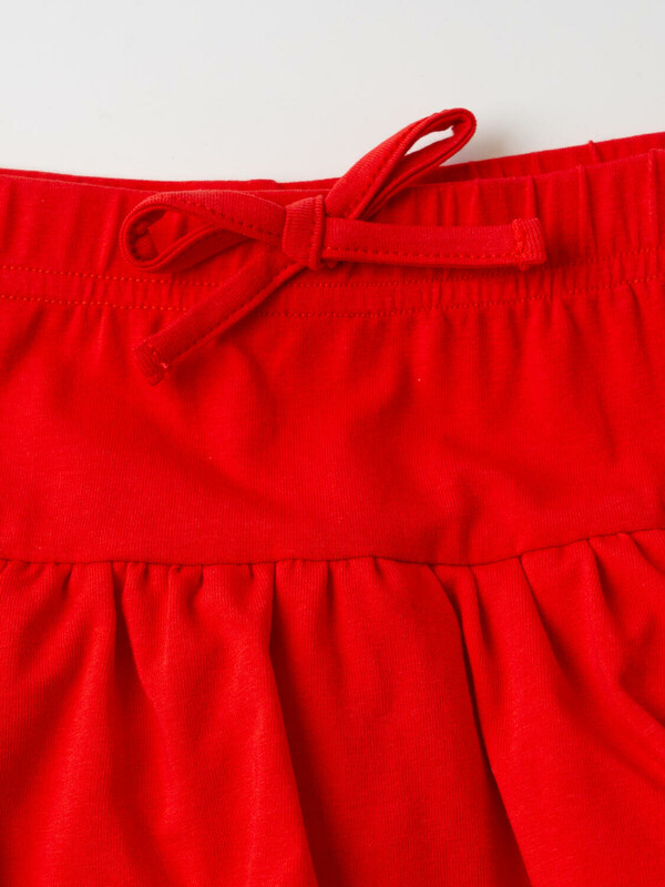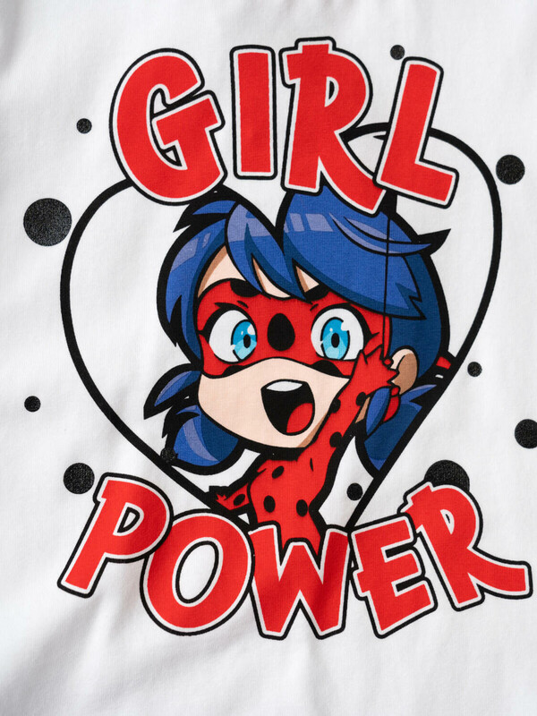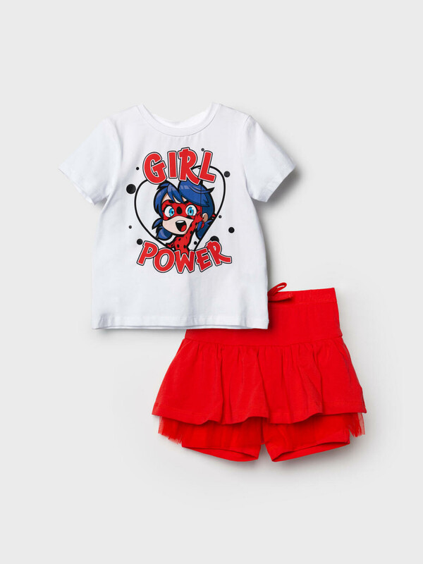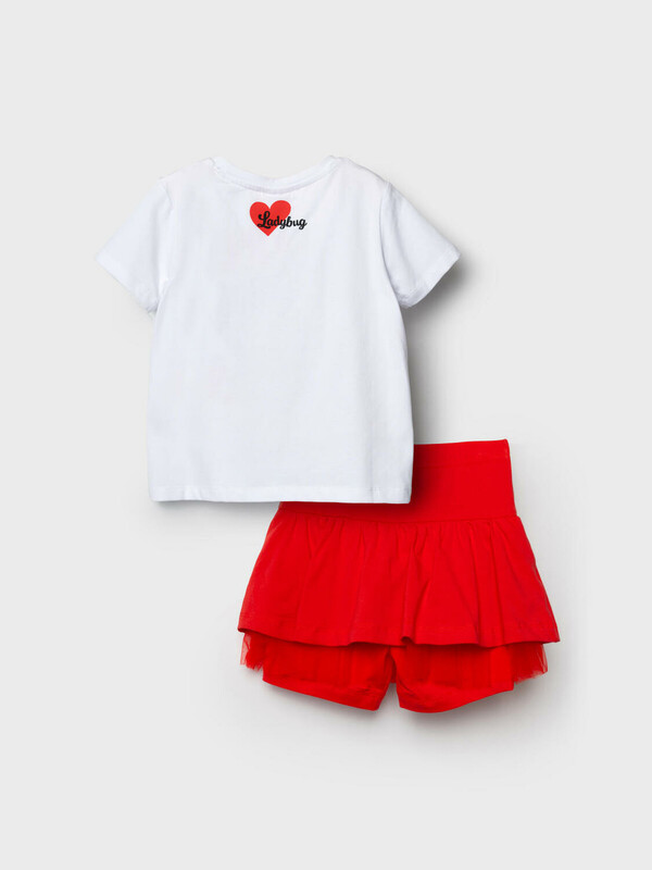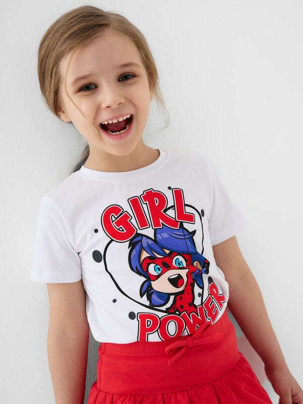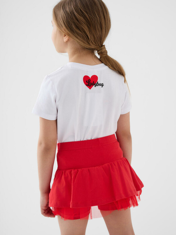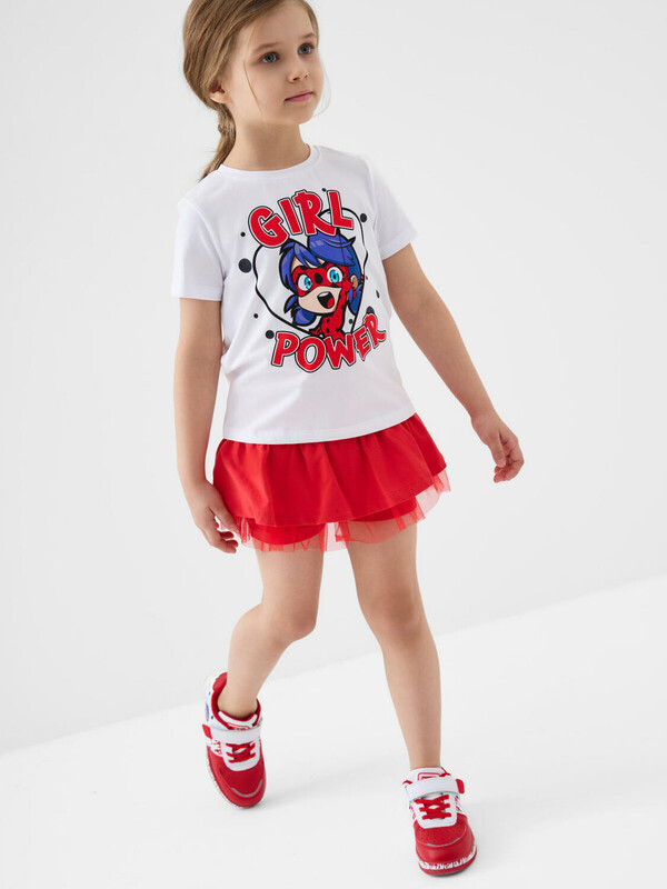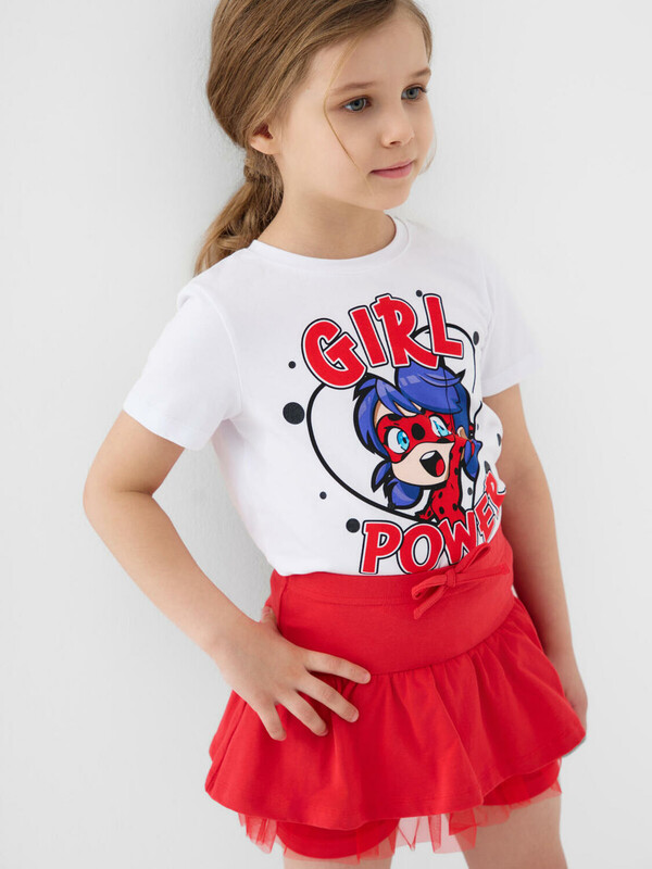 Легкий детский комплект для девочки. Выполнен из мягкого хлопкового трикотажа джерси, состоящий из футболки и юбки-шорт. Футболка прямого кроя с ярким принтом с любимым персонажем "Леди Баг и Супер-Кот". Пышная юбка на резинке со шнурком, украшена воланами и сеткой, внутри имеет удобные шорты, что делает модель практичной для активного отдыха.