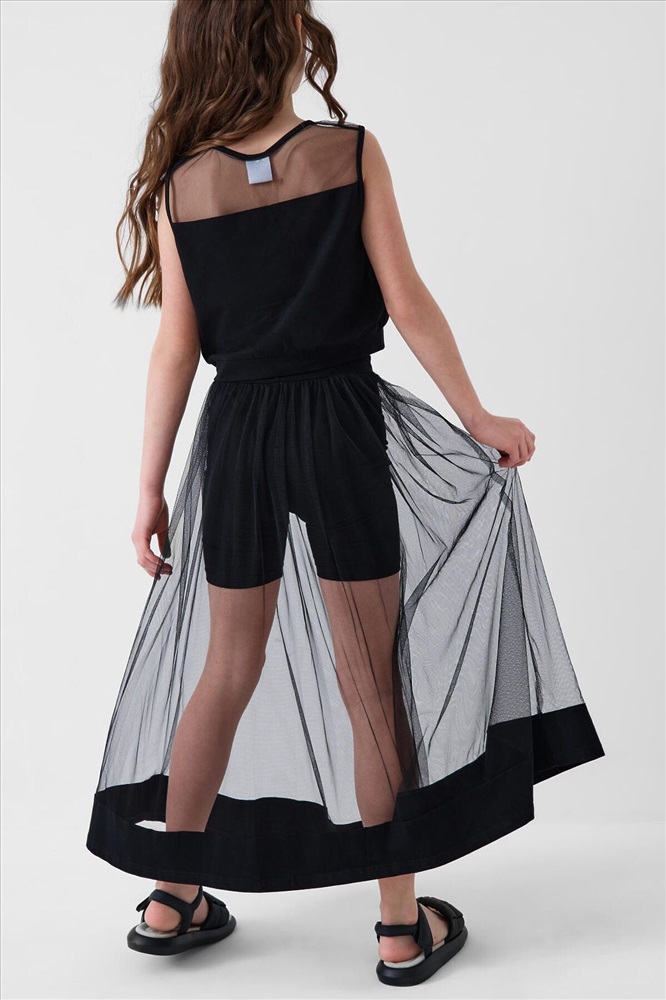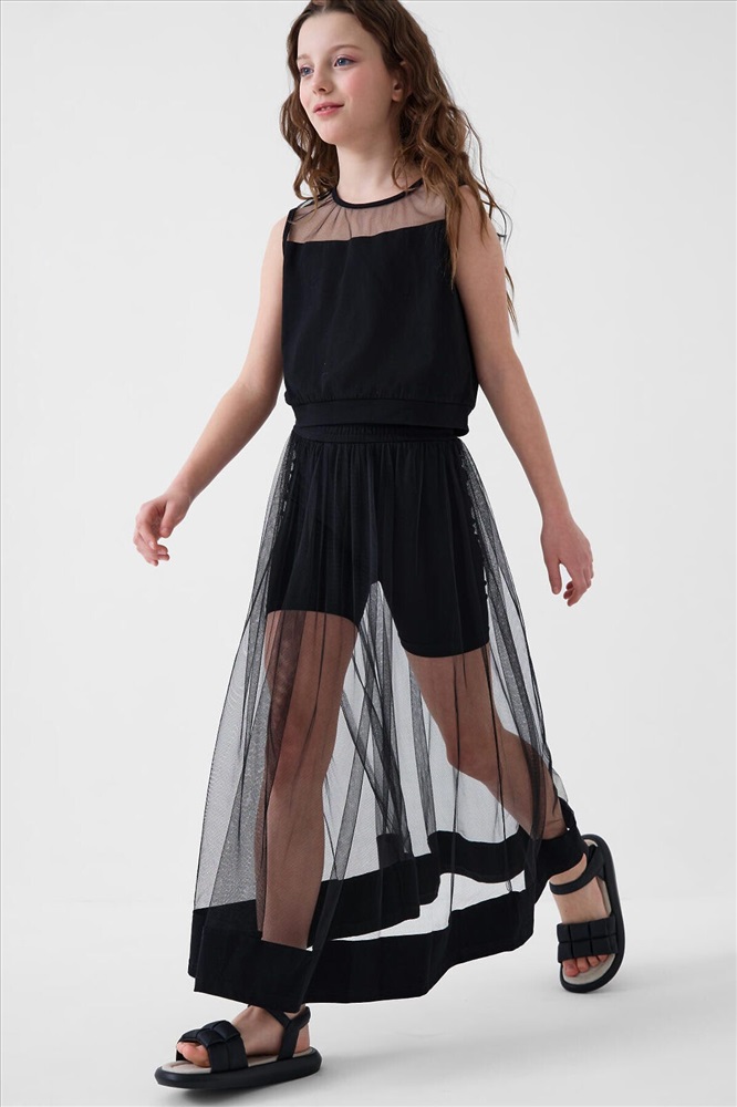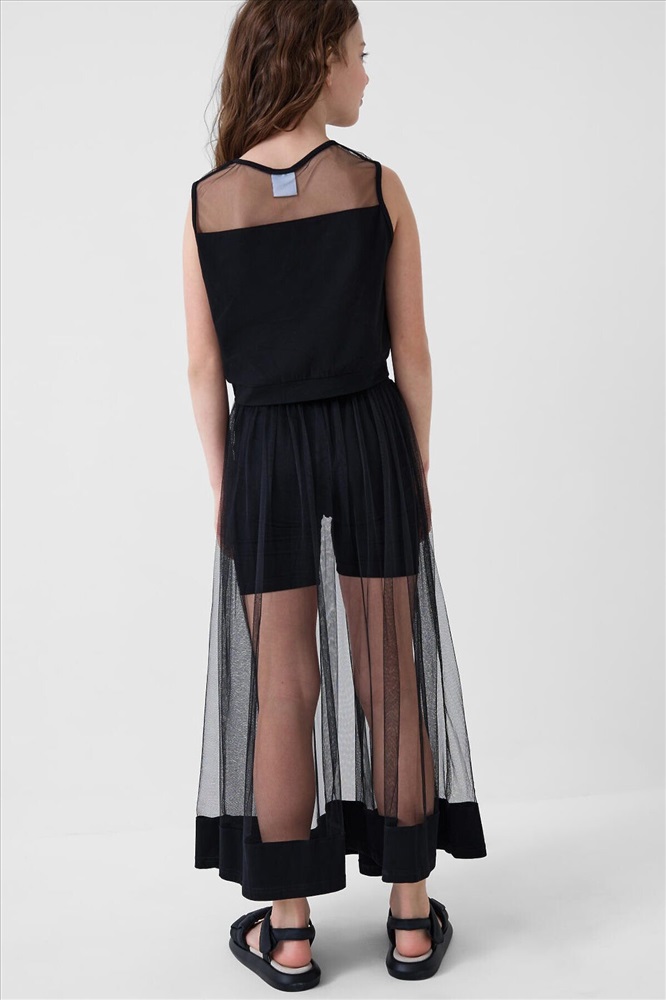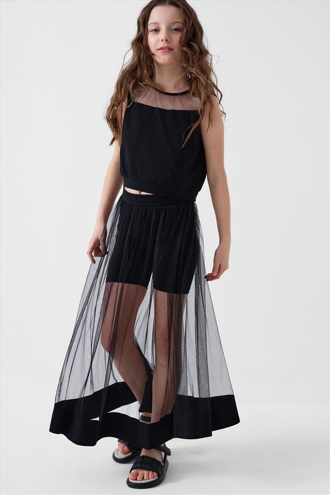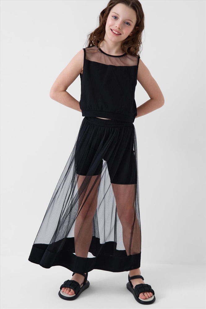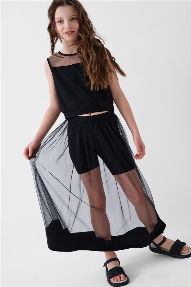 Сезон: Весна/Лето Стильный комплект для девочки подростка. Выполнен из комбинации трикотажа и сетки, состоит из укороченного топа и юбки-шорт. Верх выполнен в минималистичном дизайне: плотный трикотаж внизу и полупрозрачная сетка в зоне декольте и плеч создают модный контраст. Юбка-шорты выглядят как длинная воздушная юбка, но внутри скрыты удобные трикотажные шорты. Верхний слой выполнен из прозрачной сетки, которая красиво драпируется. Пояс на мягкой резинке обеспечивает удобную посадку.