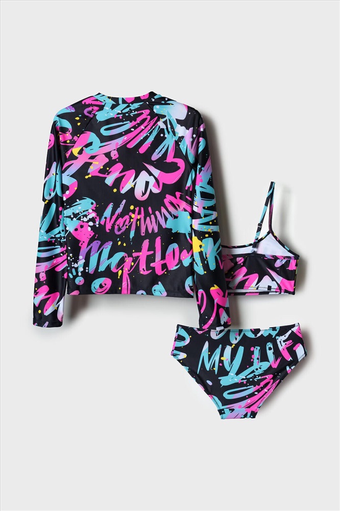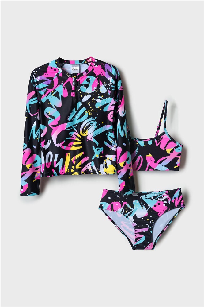ID товара: 1244196 Состав: 85% полиэстер, 15% эластан Сезон: Весна/Лето Модель купальника: Раздельный Страна бренда: Германия Страна производства: Китай Яркий купальный комплект для девочки подростка, состоящий из укороченной футболки с длинным рукавом и раздельного купальника. Лонгслив выполнен с молнией спереди. Купальник включает топ на тонких бретелях и классические плавки. Ткань устойчива к солнцу и солёной воде, благодаря UF-защите сохраняет насыщенность цвета и структуру волокон. Внутри изделия предусмотрена подкладка и эластичные швы для комфорта. Подходит для активного отдыха на пляже или у бассейна. Комментарии к товару