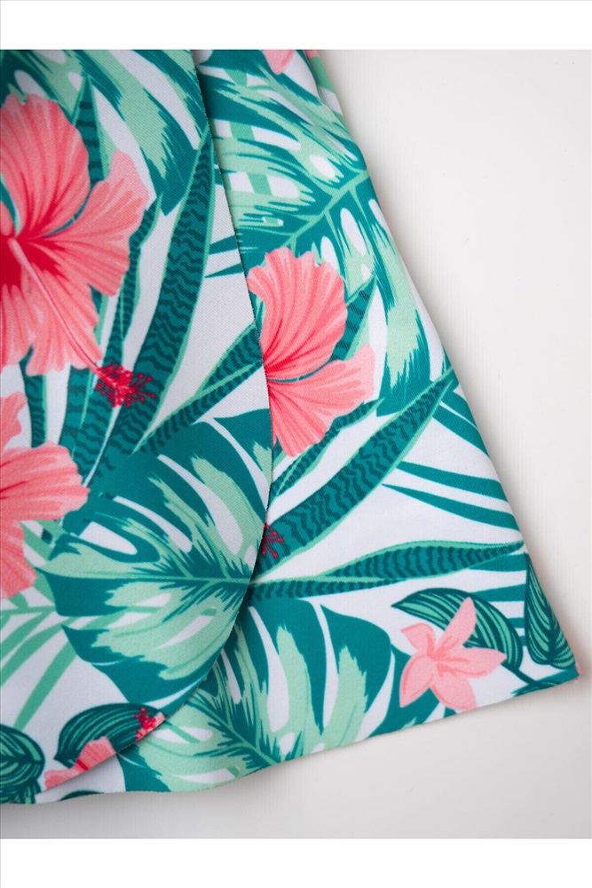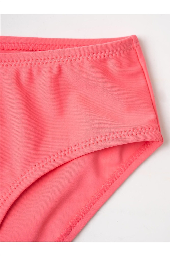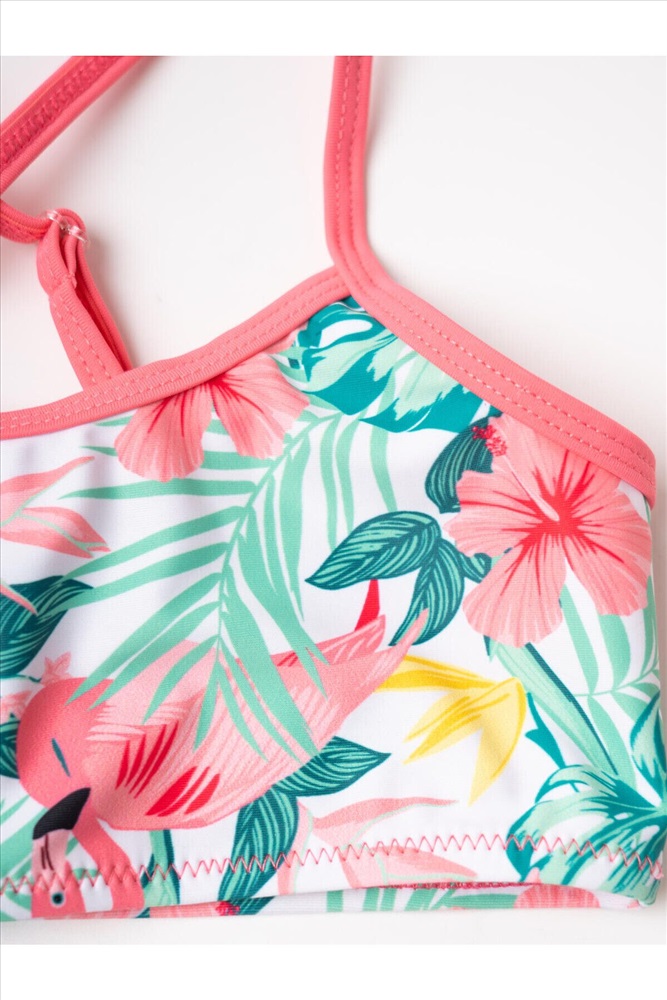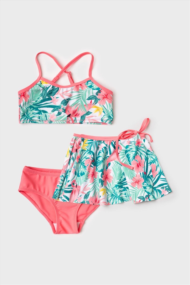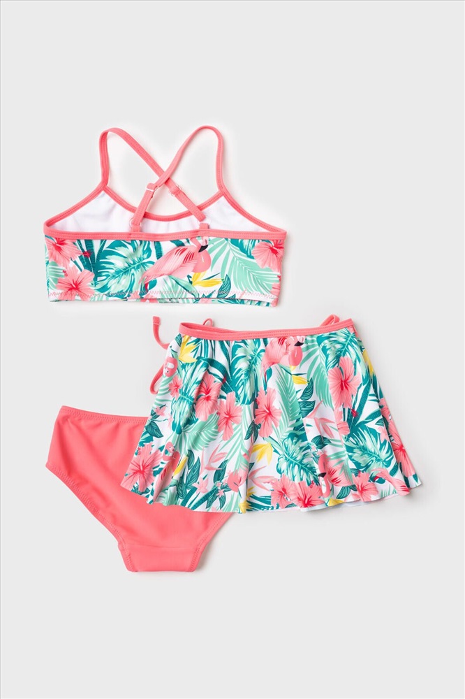 Комплект детский для девочки, состоящий из раздельного купальника и лёгкой юбочки. Топ с тонкими перекрещивающимися на спине бретелями, которые можно регулировать. Плавки однотонные, светло-розового цвета, классической формы с подкладкой. Юбка лёгкая, с тропическим рисунком, завязывается сбоку бантиком. Все края обработаны эластичной тесьмой, чтобы изделие хорошо сидело на теле и не натирало. Благодаря UF-защите, ткань сохраняет первоначальный вид даже при длительном пребывании на солнце. Подходит для плавания и активного отдыха.
