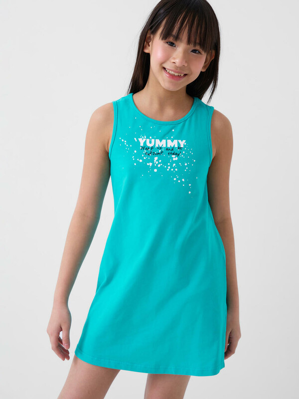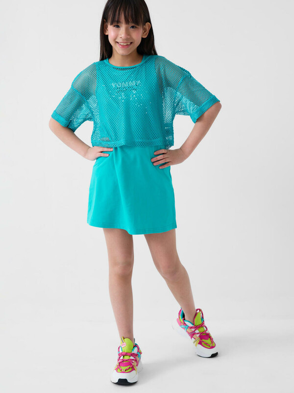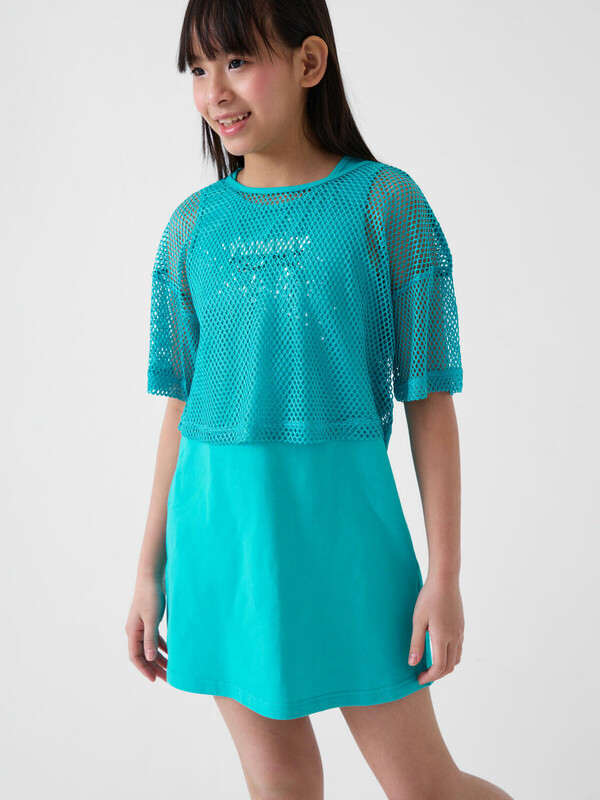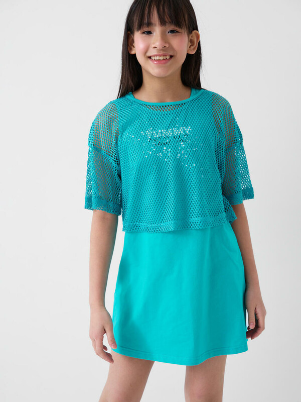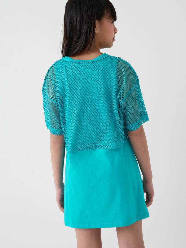 Комплект для девочки подростка. Сарафан прямого кроя, из хлопкового трикотажа джерси, дополнен красочным принтом. Укороченная футболка оверсайз выполнена из сетки.