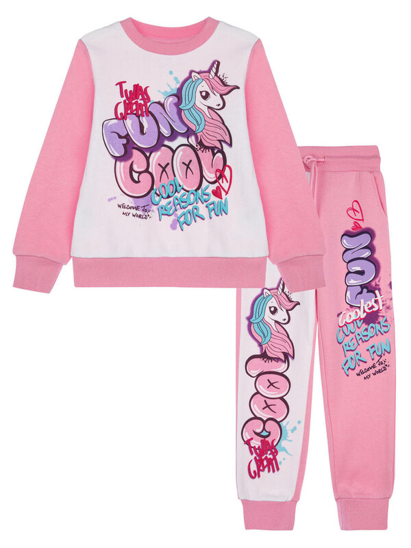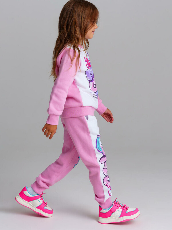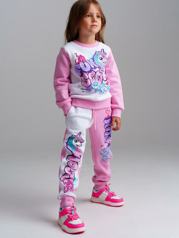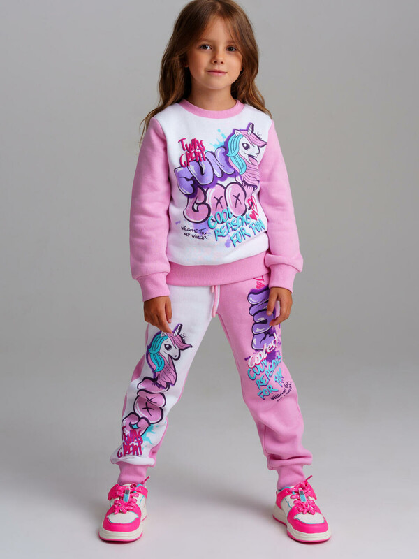 Костюм детский из футера с начесом для девочки. Свитшот с высоким содержанием хлопка. Штаны на резинке со шнурком. Удобные карманы. Модель из капсульной коллекции UNICORN KUROMI (ЮНИКОРН КОРОМИ). Соберите полный образ в едином стиле! Модель выполнена из качественного и приятного на ощупь трикотажа.