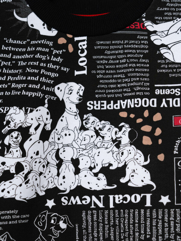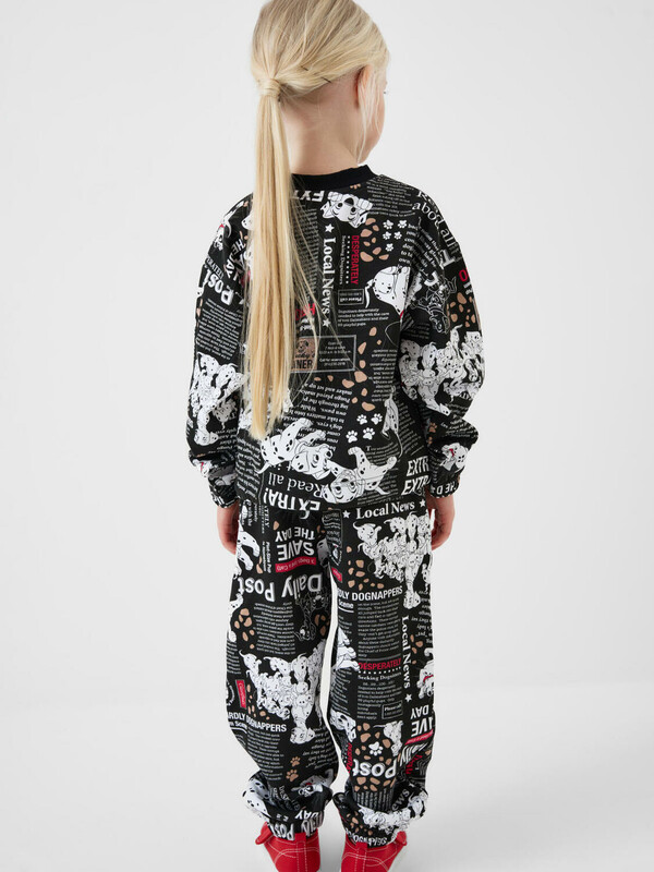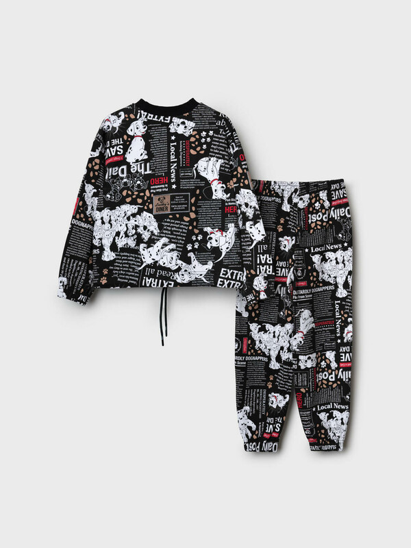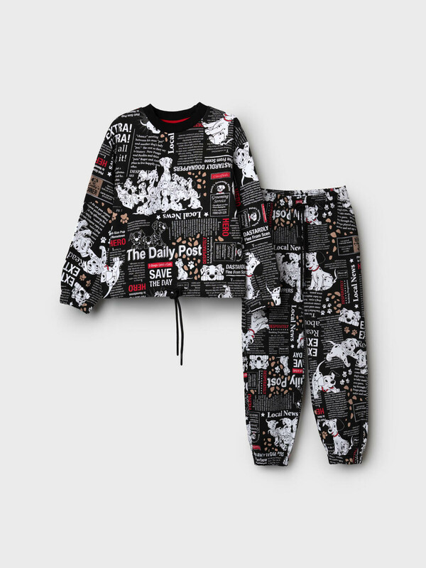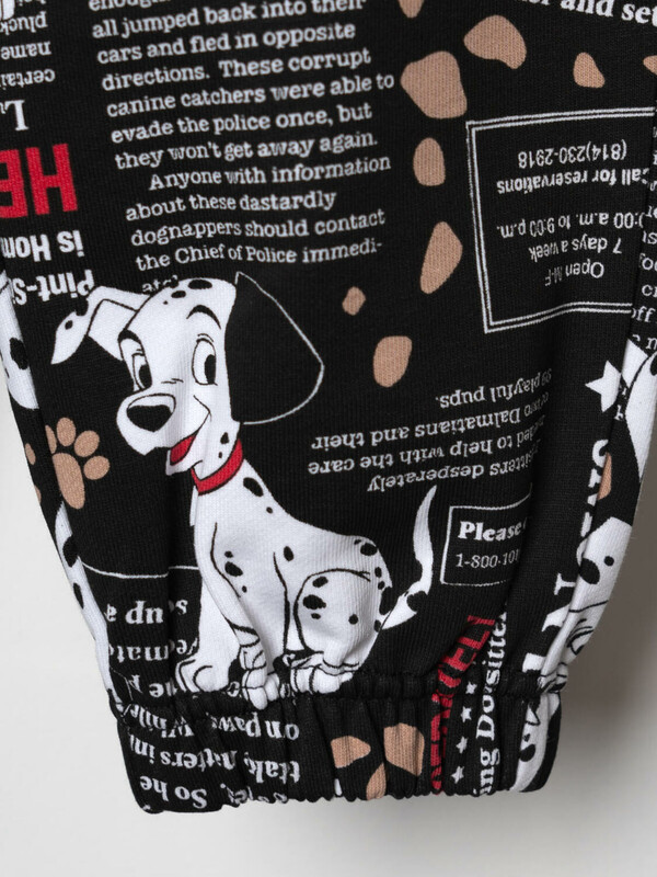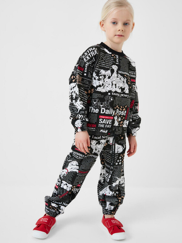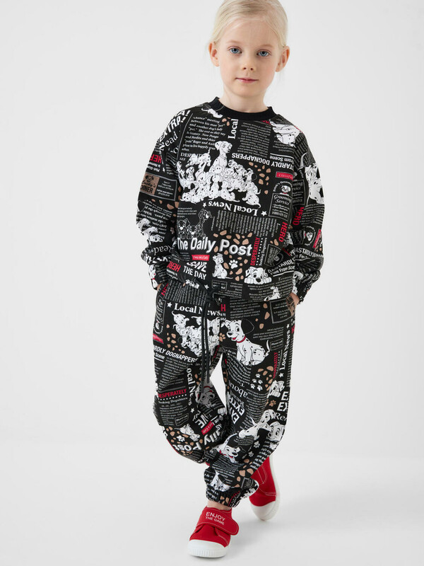 Детский спортивный костюм для девочки. Комплект выполнен из хлопкового футера и состоит из свитшота и джогеров на резинке. Свитшот прямого кроя, украшен красочным принтом с персонажами из "101 далматинца". Манжеты выполнены из эластичного риба. Низ изделия можно затянуть шнурком. Брюки джоггеры — комфортные, с эластичным поясом и шнуром для регулировки посадки. Удобные боковые карманы. Низ штанин собран на резинку.