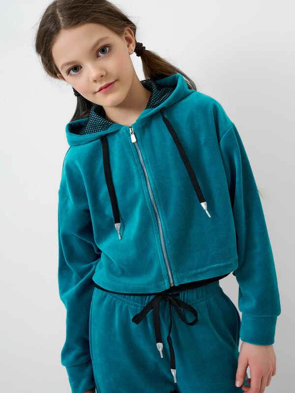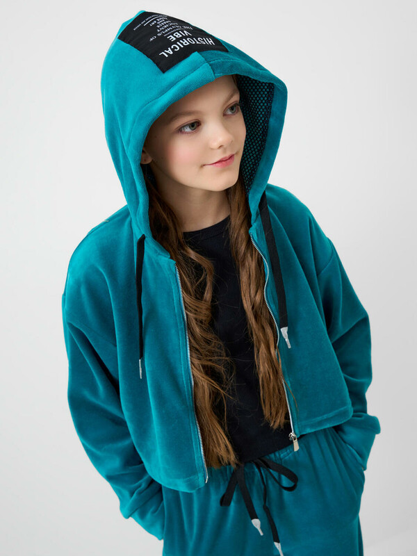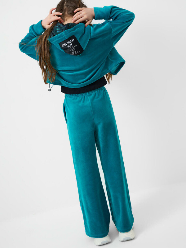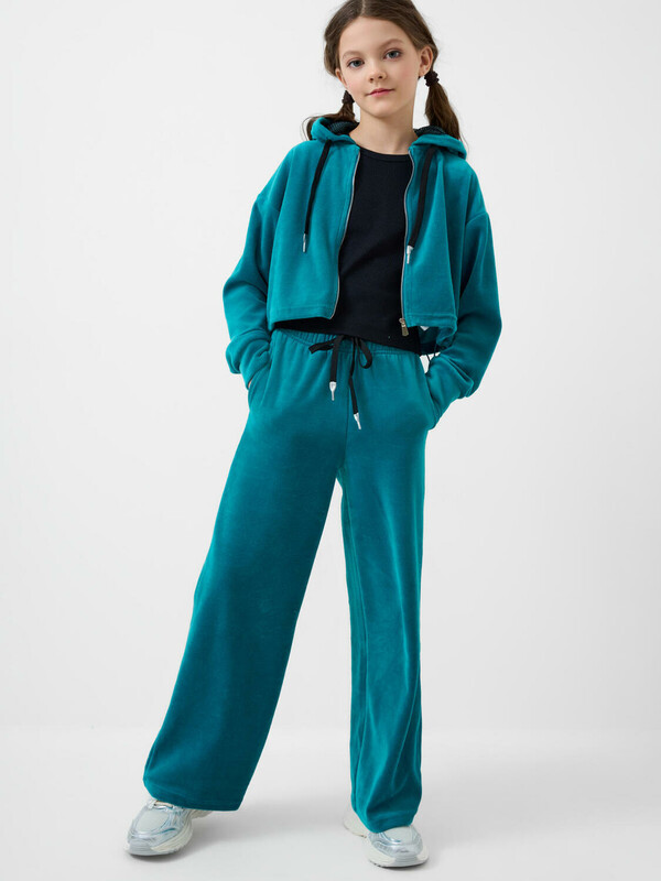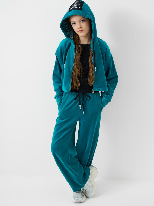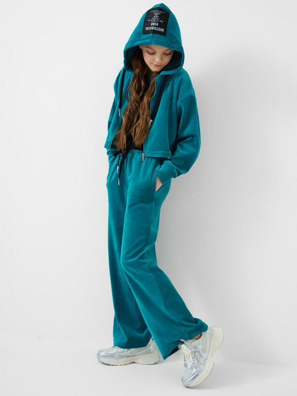 Спортивный велюровый костюм для девочки подростка. Комплект состоит из толстовки на молнии и широких брюк на резинке. Укороченная толстовка оверсайз. Низ изделия с утяжкой стопперами для регулировки посадки. Брюки палаццо — комфортные, с эластичным поясом и шнуром для регулировки посадки. Удобные боковые карманы.