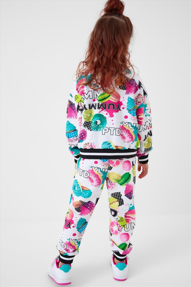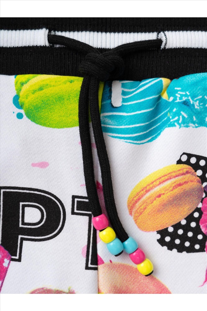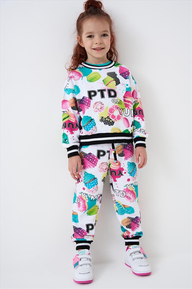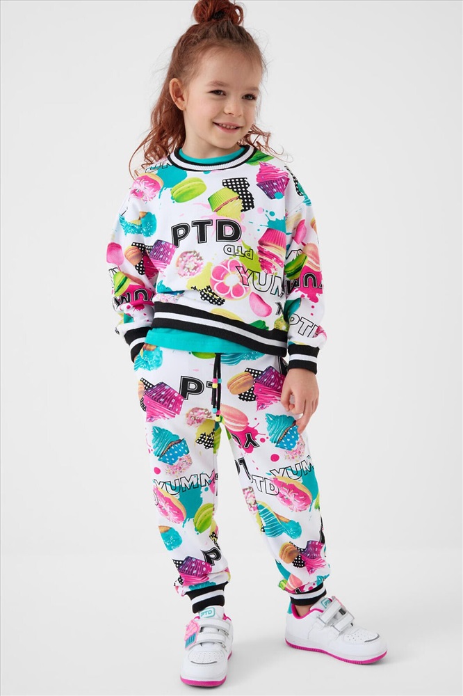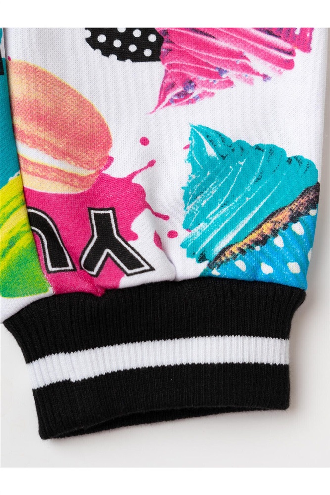 ID товара: 1240207 Состав: 60% хлопок, 40% полиэстер Сезон: Весна/Лето Детский спортивный костюм для девочки. Комплект выполнен из хлопкового футера и состоит из свитшота и джогеров на резинке. Красочный принт с донатами, капкейками и макарунами. Толстовка прямого кроя. Манжеты и пояс выполнены из эластичного риба, благодаря чему изделие хорошо держит форму. Брюки джоггеры — комфортные, с эластичным поясом и шнуром для регулировки посадки. Удобные боковые карманы. Низ штанин собран на резинку. Комментарии к товару