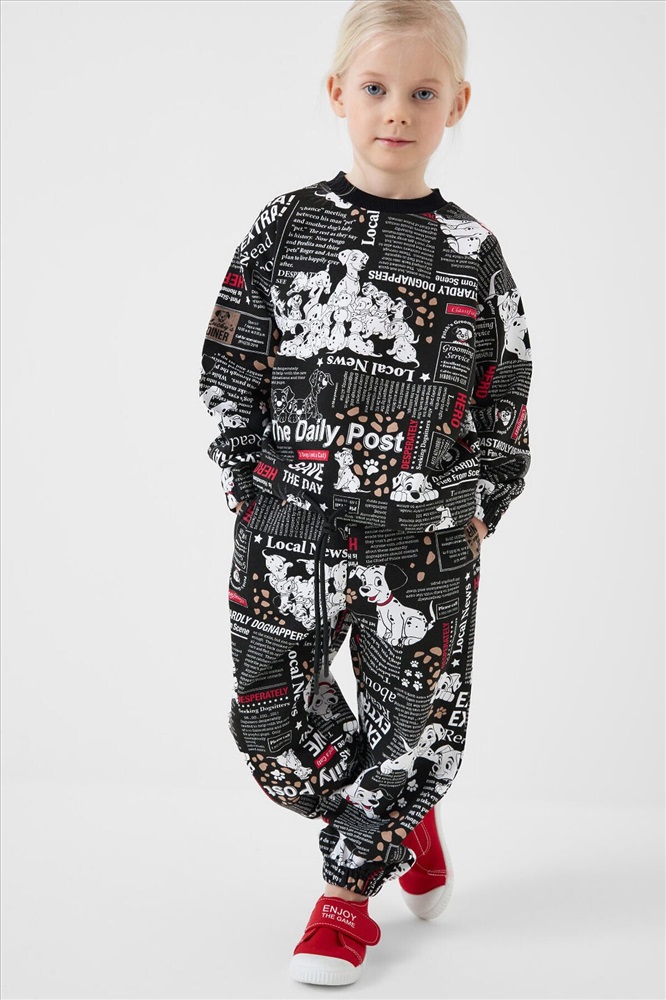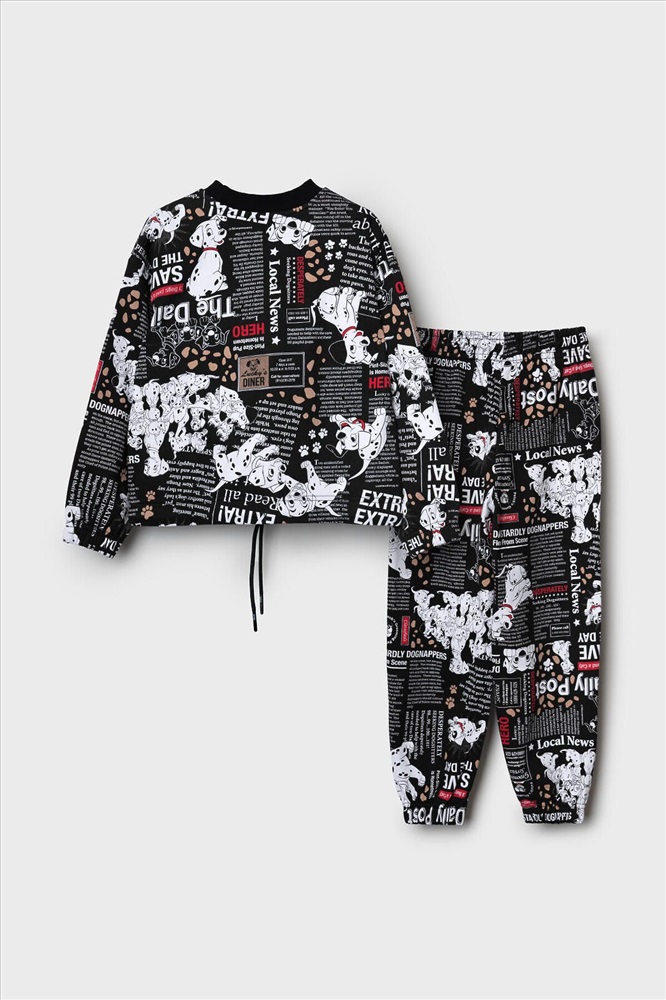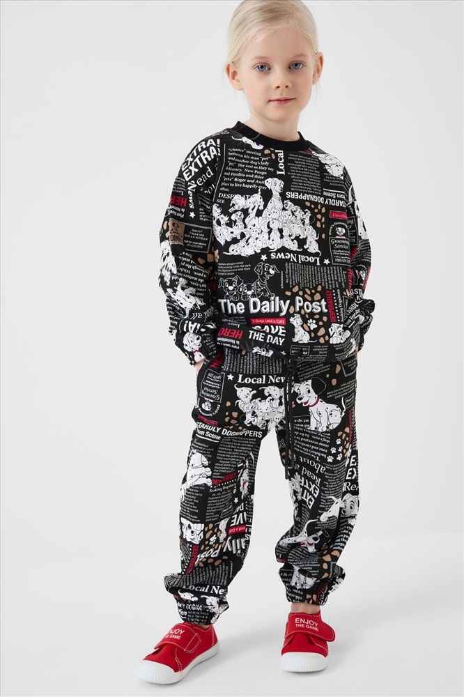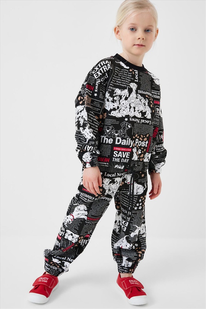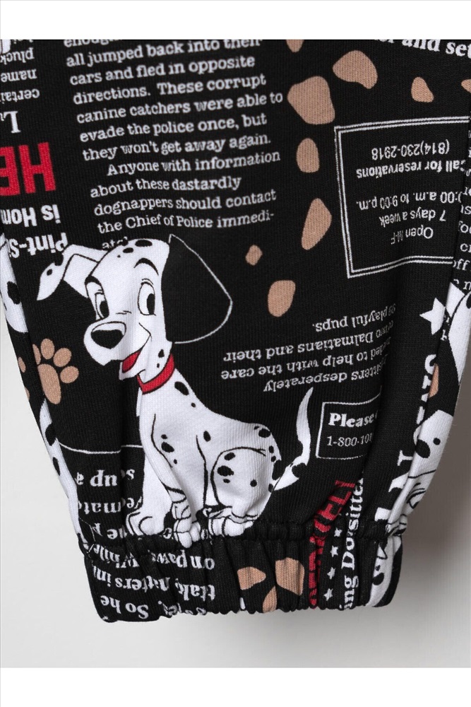 Детский спортивный костюм для девочки. Комплект выполнен из хлопкового футера и состоит из свитшота и джогеров на резинке. Свитшот прямого кроя, украшен красочным принтом с персонажами из "101 далматинца". Манжеты выполнены из эластичного риба. Низ изделия можно затянуть шнурком. Брюки джоггеры — комфортные, с эластичным поясом и шнуром для регулировки посадки. Удобные боковые карманы. Низ штанин собран на резинку.