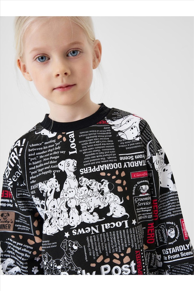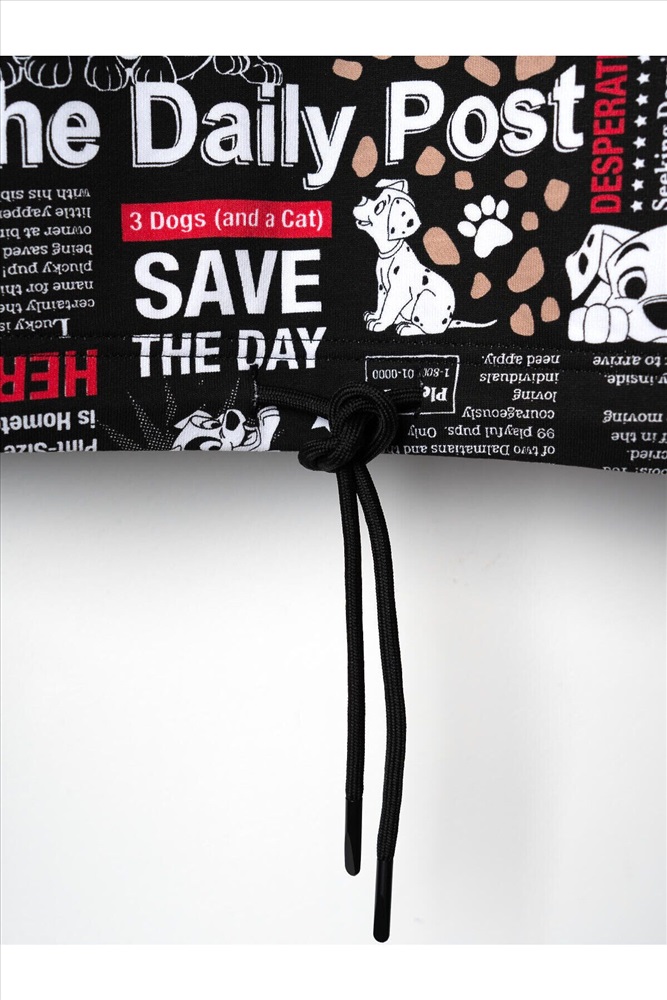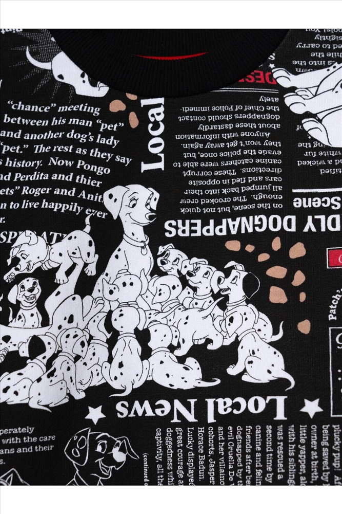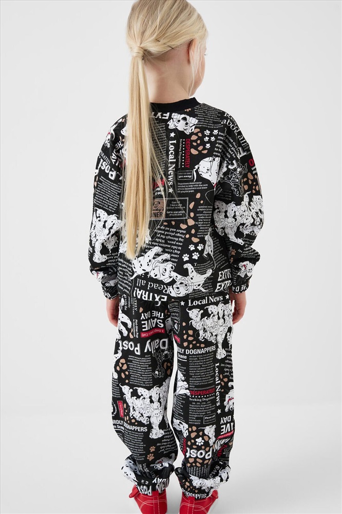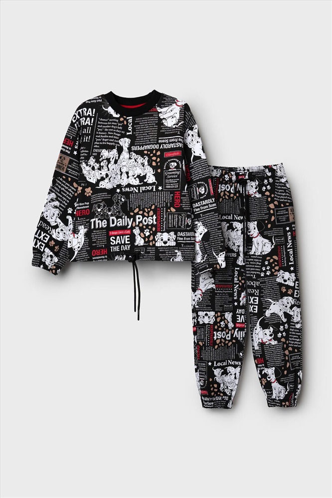 Детский спортивный костюм для девочки. Комплект выполнен из хлопкового футера и состоит из свитшота и джогеров на резинке. Свитшот прямого кроя, украшен красочным принтом с персонажами из "101 далматинца". Манжеты выполнены из эластичного риба. Низ изделия можно затянуть шнурком. Брюки джоггеры — комфортные, с эластичным поясом и шнуром для регулировки посадки. Удобные боковые карманы. Низ штанин собран на резинку.