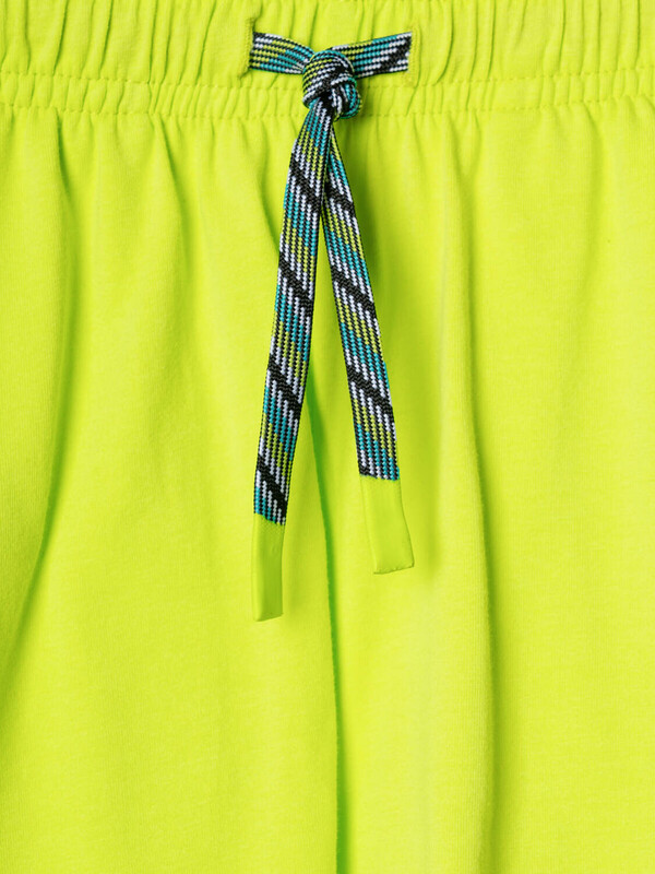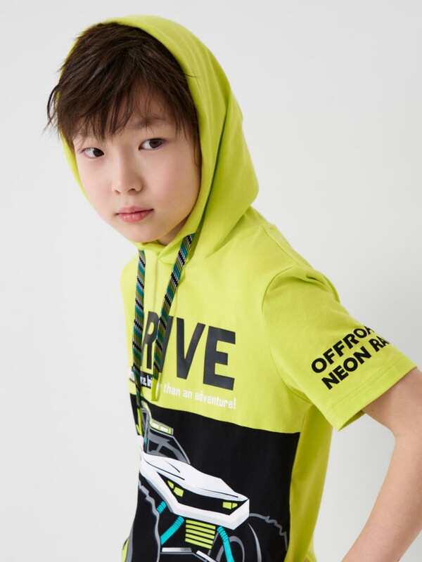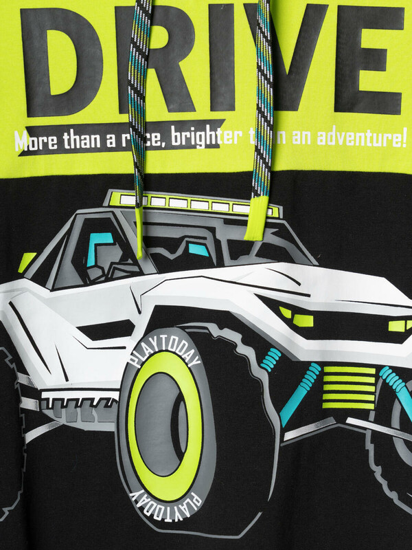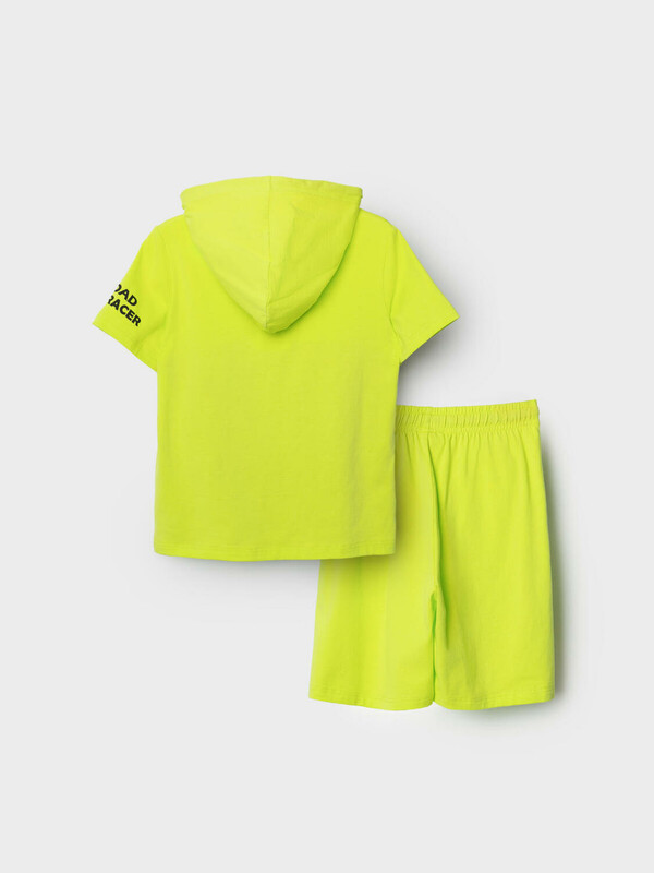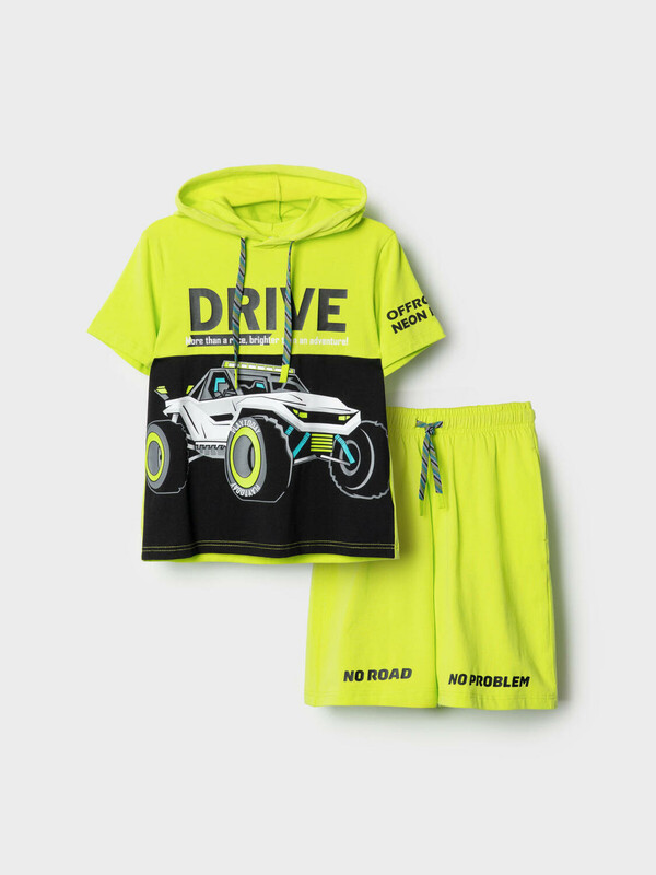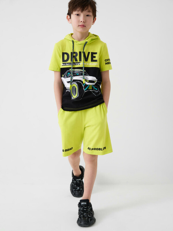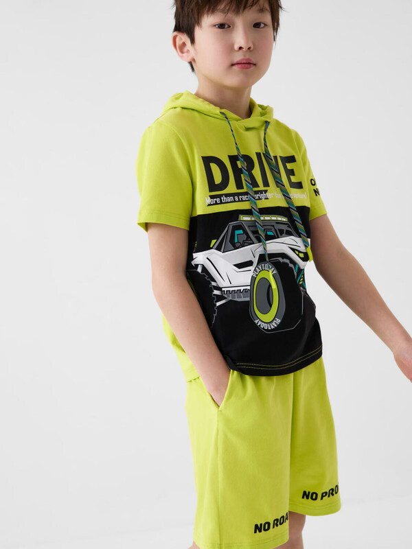 Костюм для мальчика подростка. Состоит из футболки и шорт. Выполнен из хлопкового трикотажа. Футболка прямого кроя с капюшоном. Регулировка капюшона шнуром. Яркий принт в гоночной тематике. Шорты свободные, с эластичным поясом и шнурком для регулировки посадки. По бокам расположены карманы.