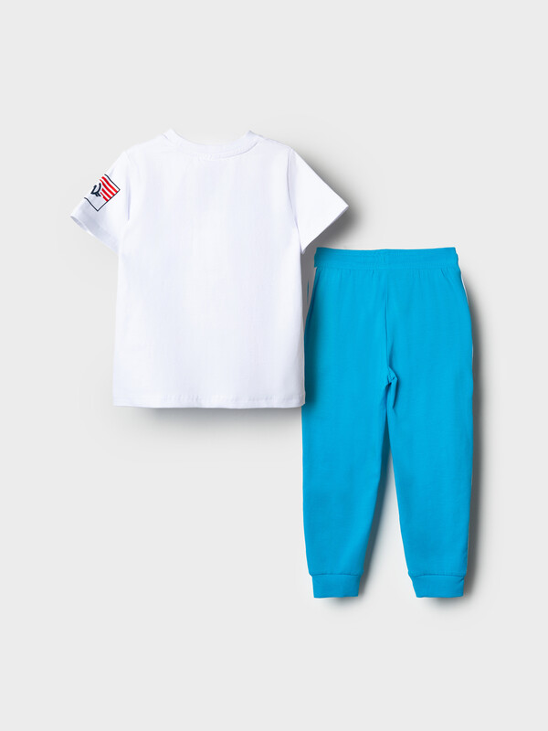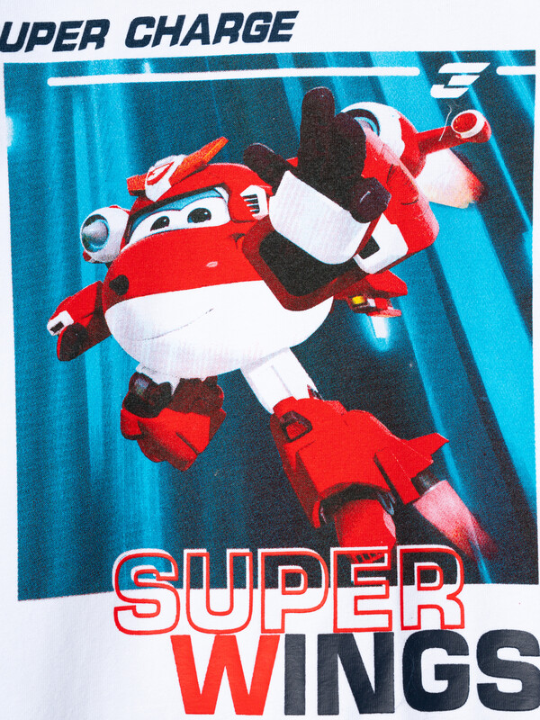 Детский костюм для мальчика. Состоит из футболки с коротким рукавом и брюк на резинке. Футболка прямого кроя с яркими принтами "Super Wings". Брюки выполнены из хлопкового трикотажа. Джоггеры с комфортной посадкой, пояс на резинке дополнен шнурком. Удобные боковые карманы. Внизу — эластичные манжеты.