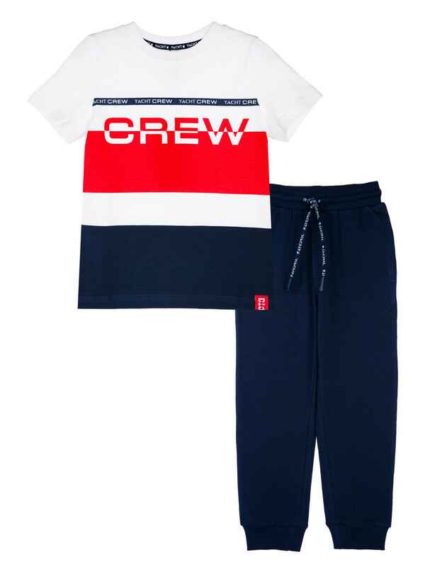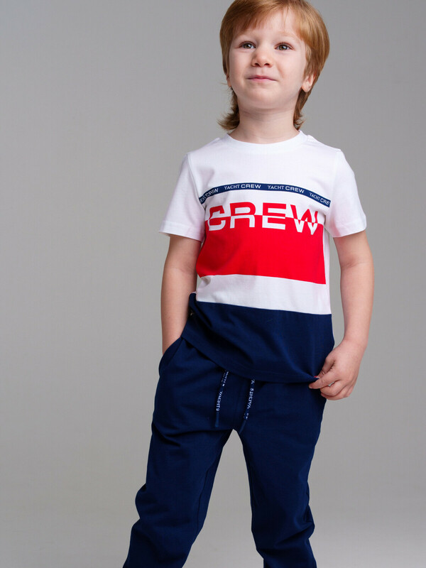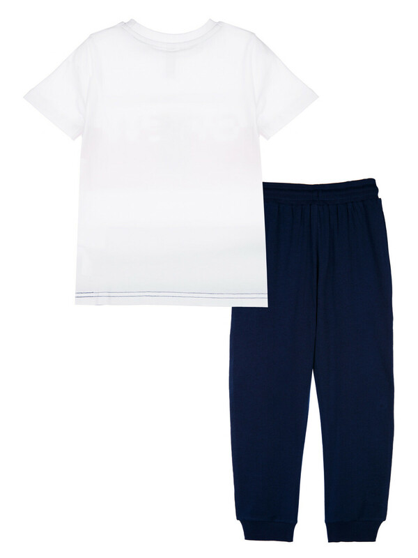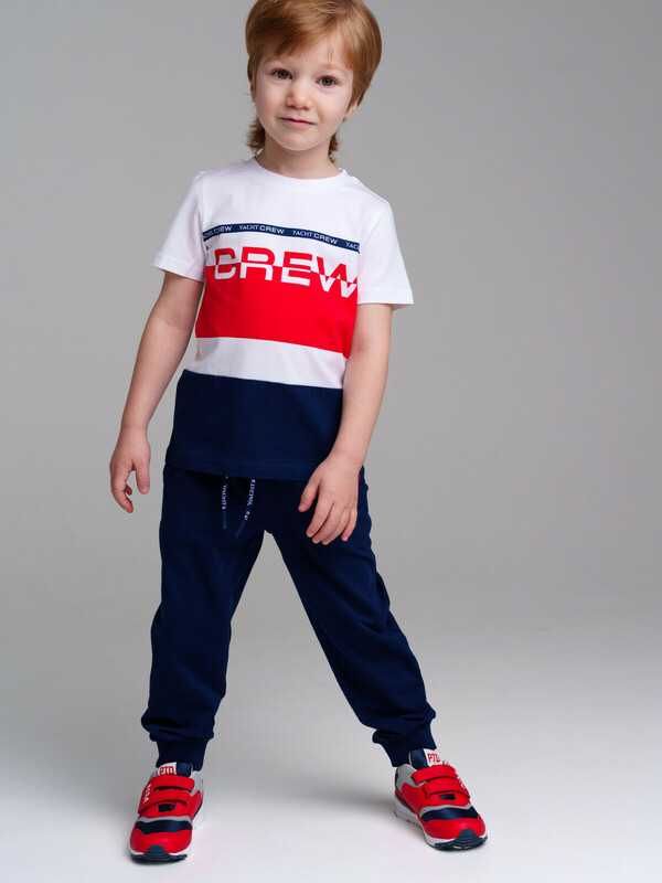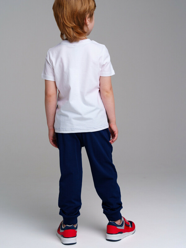 Комплект: футболка, брюки из качественного и приятного на ощупь трикотажа джерси. Высокое содержание хлопка 95%. Благодаря наличию эластана в составе ткани изделие проще в уходе и держит форму. Regular fit. Эластичный пояс со шнурком. Карманы. Манжеты брюк в эластичный рубчик.