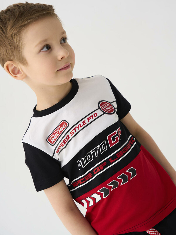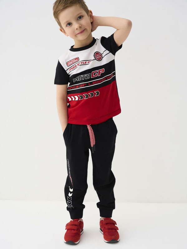 Детский костюм для мальчика. Состоит из футболки с коротким рукавом и брюк на резинке. Футболка прямого кроя с яркими принтами в гоночной тематике. Брюки выполнены из плотного хлопкового трикотажа. Джоггеры с комфортной посадкой, пояс на резинке дополнен шнурком. Удобные боковые карманы. Внизу — эластичные манжеты.