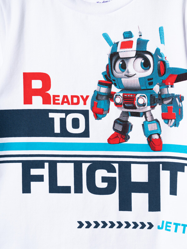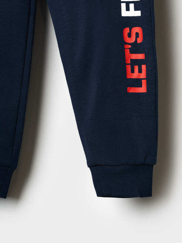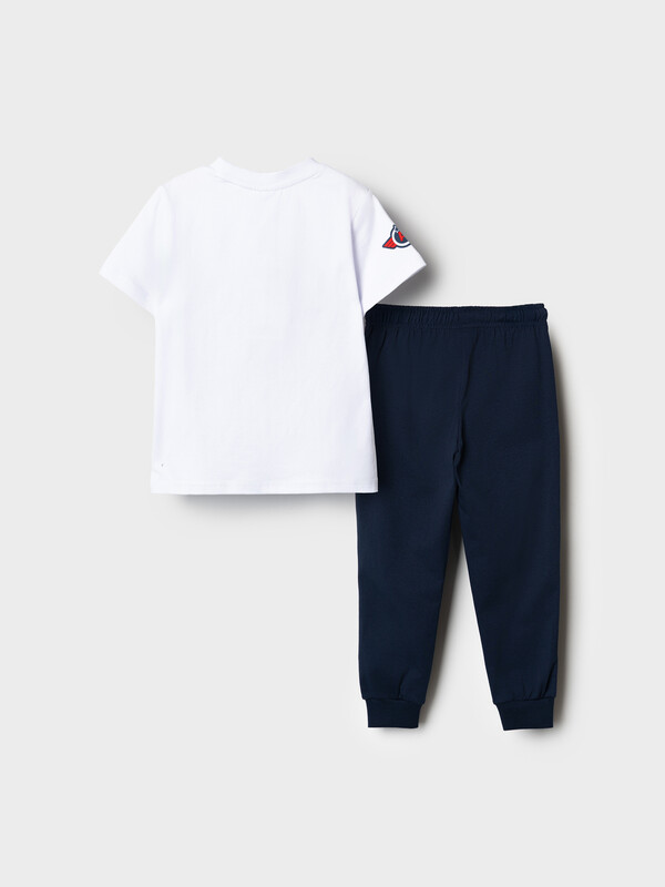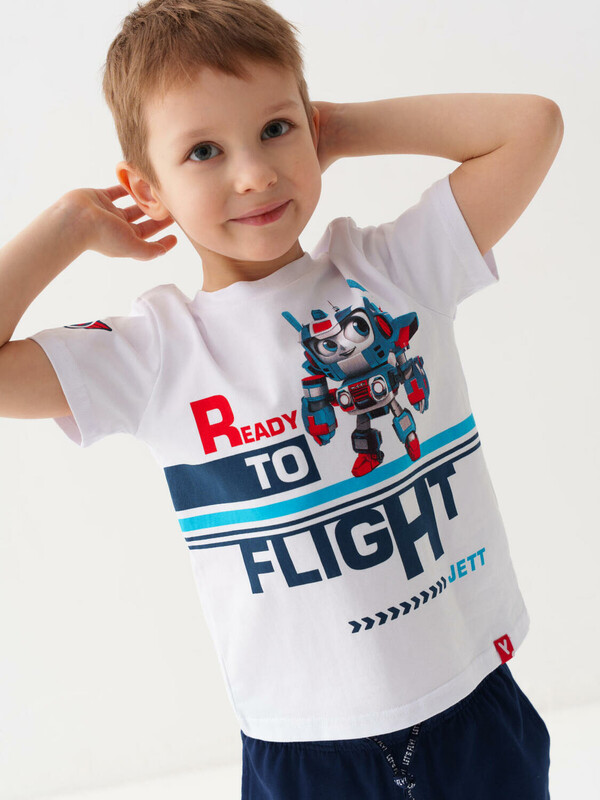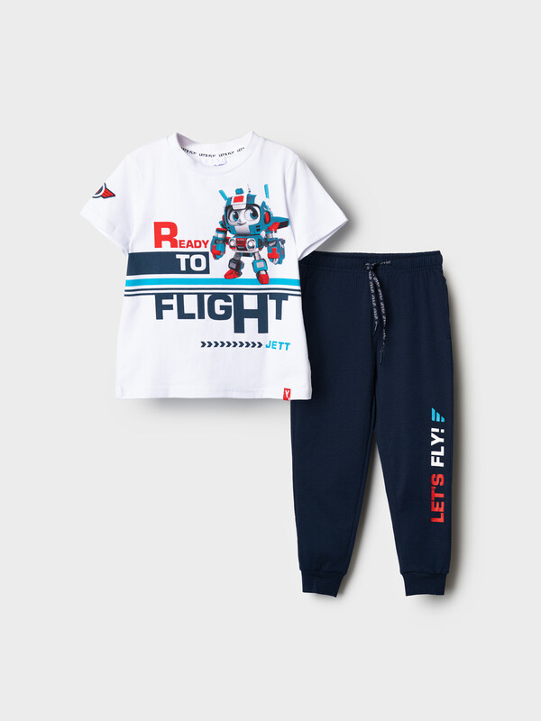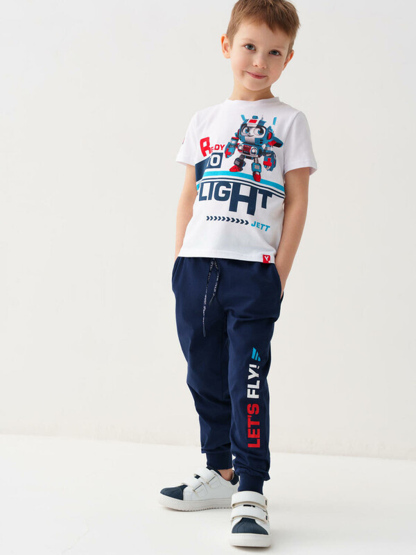 Детский костюм для мальчика. Состоит из футболки с коротким рукавом и брюк джоггеров. Футболка прямого кроя с яркими принтами и нашивкой. Брюки выполнены из плотного хлопкового трикотажа. Модель с комфортной посадкой, пояс на резинке дополнен шнурком. Удобные боковые карманы. Внизу — эластичные манжеты.