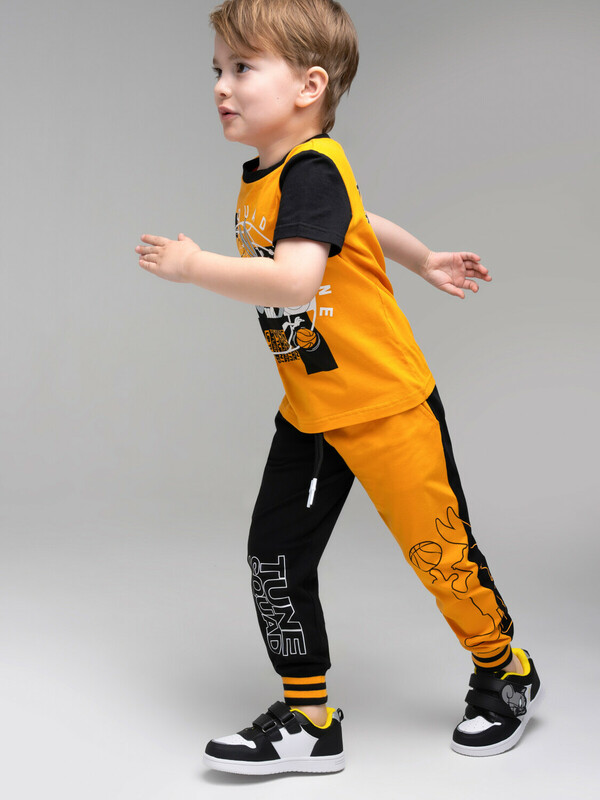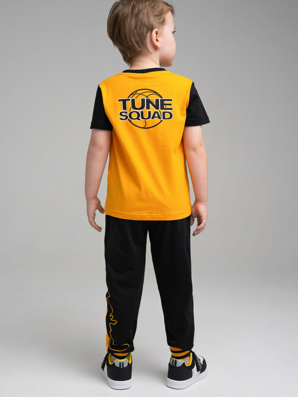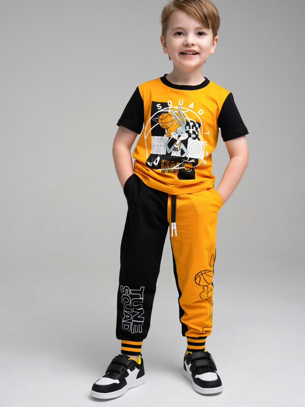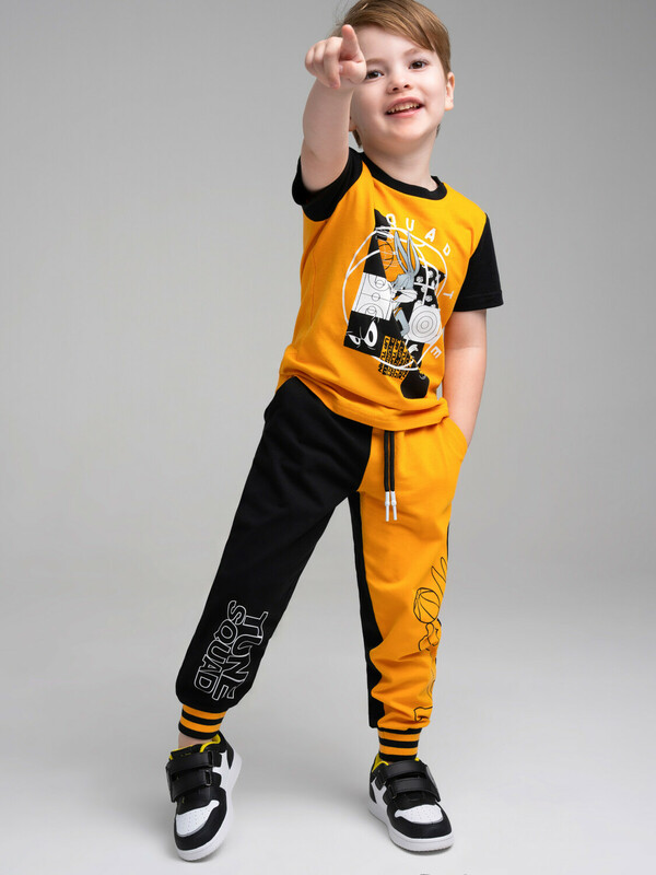 Костюм детский для мальчика. Комплект: футболка, брюки. Высокое содержание хлопка 95%. Благодаря наличию эластана в составе ткани изделие проще в уходе и держит форму. Штаны на резинке со шнурком. Боковые карманы. Модель выполнена из качественного и приятного на ощупь трикотажа.