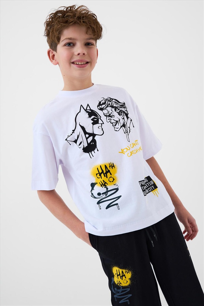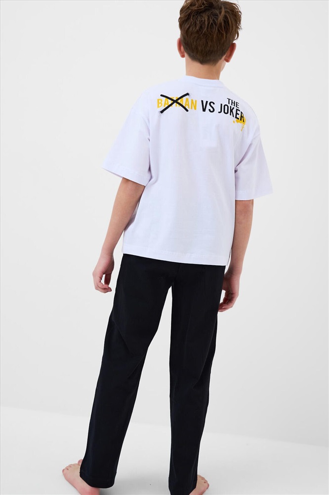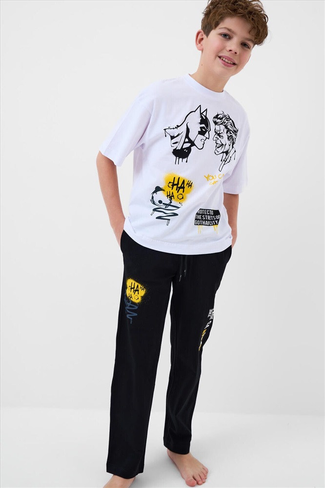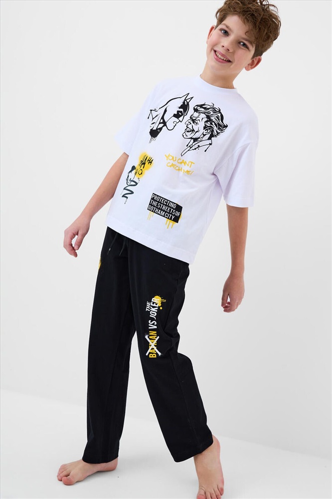 ID товара: 1242082 Состав: 95% хлопок, 5% эластан Сезон: Весна/Лето Рукав: короткие Страна бренда: Германия Страна производства: Китай Пижама для мальчика подростка. Состоит из белой оверсайз футболки и чёрных брюк. На футболке размещён яркий принт с персонажами Batman и Joker. Брюки украшены принтами в едином стиле. У футболки круглый вырез и короткие рукава, а у брюк — эластичный пояс со шнурком и удобные боковые карманы. Материал - мягкий, хлопковый трикотаж. Комментарии к товару