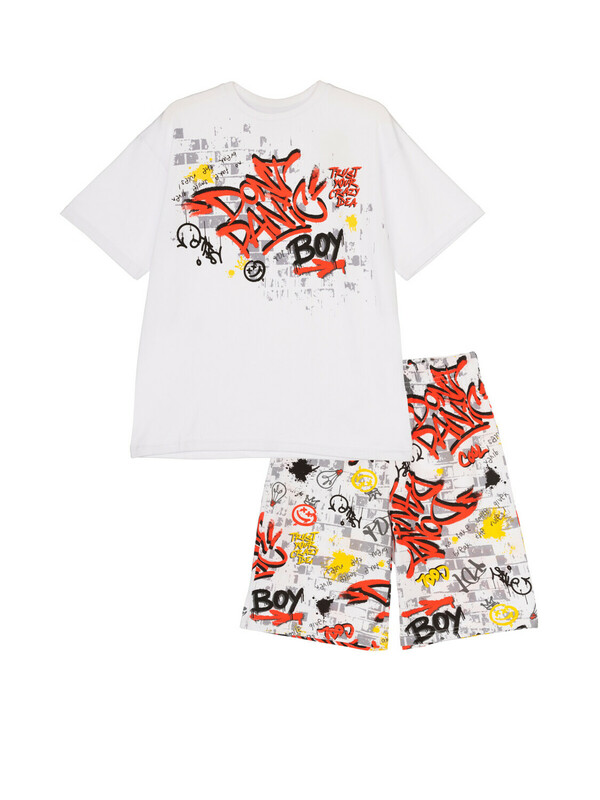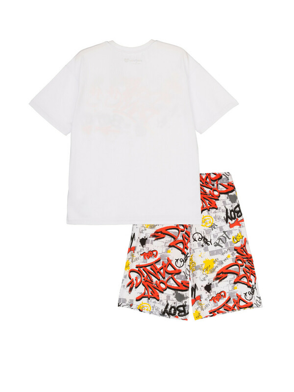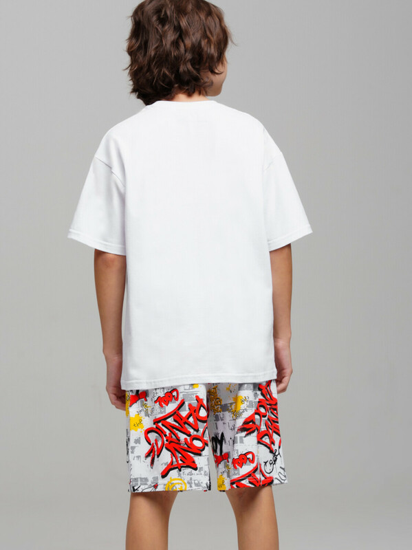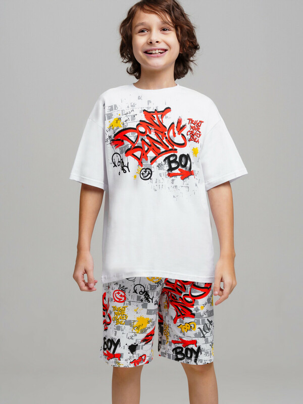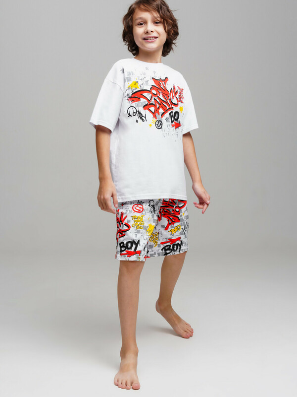 Пижама для мальчика подростка. Футболка и шорты из эластичного и приятного на ощупь трикотажа. Шорты на резинке со шнурком. Высокое содержание хлопка 95%. Благодаря наличию эластана в составе ткани изделие держит форму и меньше мнется.