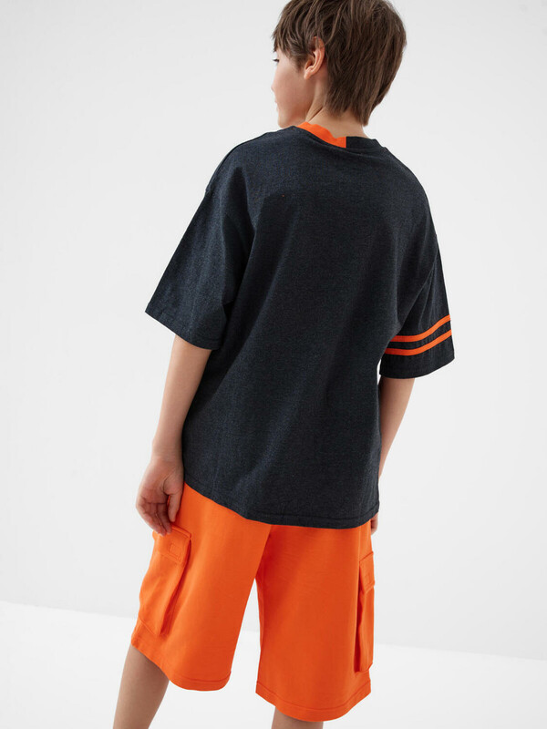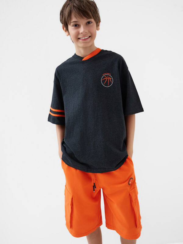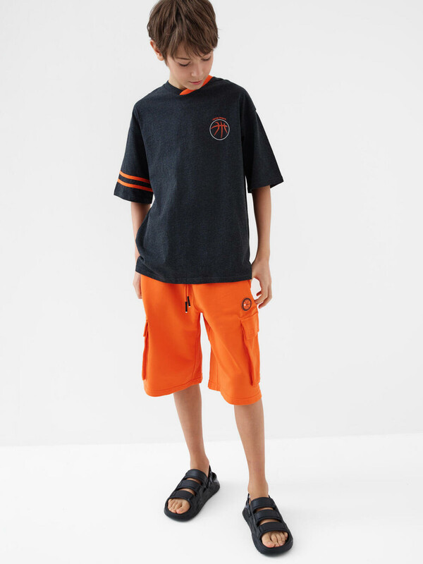 Костюм для мальчика подростка. Состоит из футболки и шорт. Выполнен из хлопкового трикотажа. Футболка оверсайз, с коротким рукавом. На груди размещён небольшой принт с баскетбольным мячом. Шорты свободные, с эластичным поясом и шнурком для регулировки посадки. Удобные боковые карманы, и накладные карманы-карго.